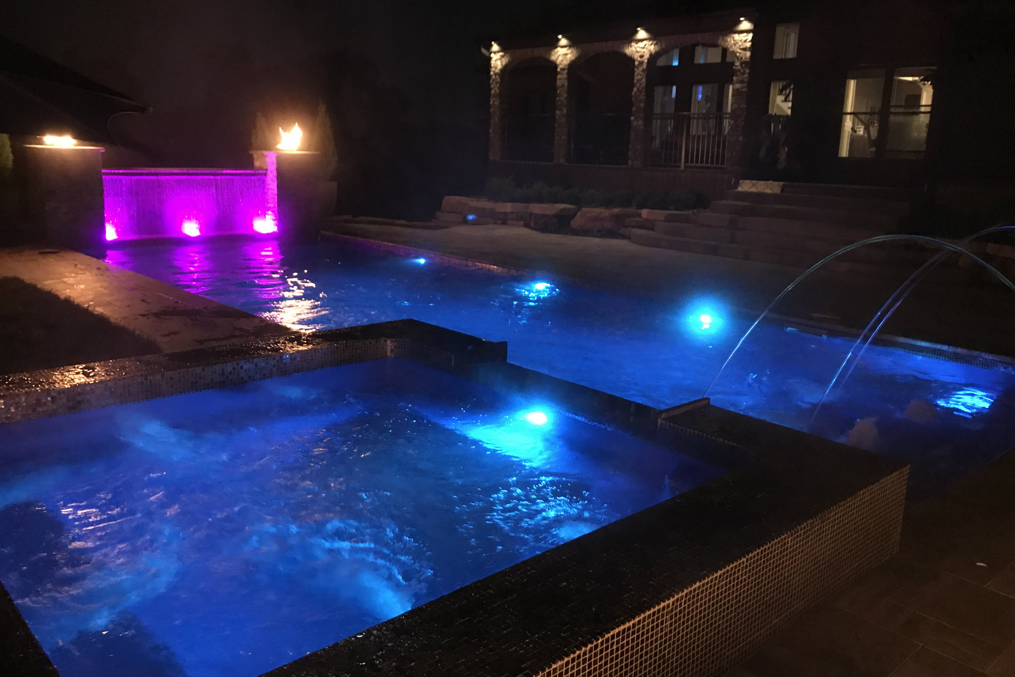The rain wall at the deep end was cleverly constructed to keep it kid-safe. Most water walls are built with a trough on top that overflows, creating a gentle trickle down the vertical surface. Recognizing that such a feature could pose a hazard if children were to scale the wall, Hutchinson capped the top and installed a span of manufactured rain curtains. Not only does the wall provide privacy and a noise barrier, it’s a spectacle at night. The LED lights make the drops appear like dancing diamonds, Hutchinson says.