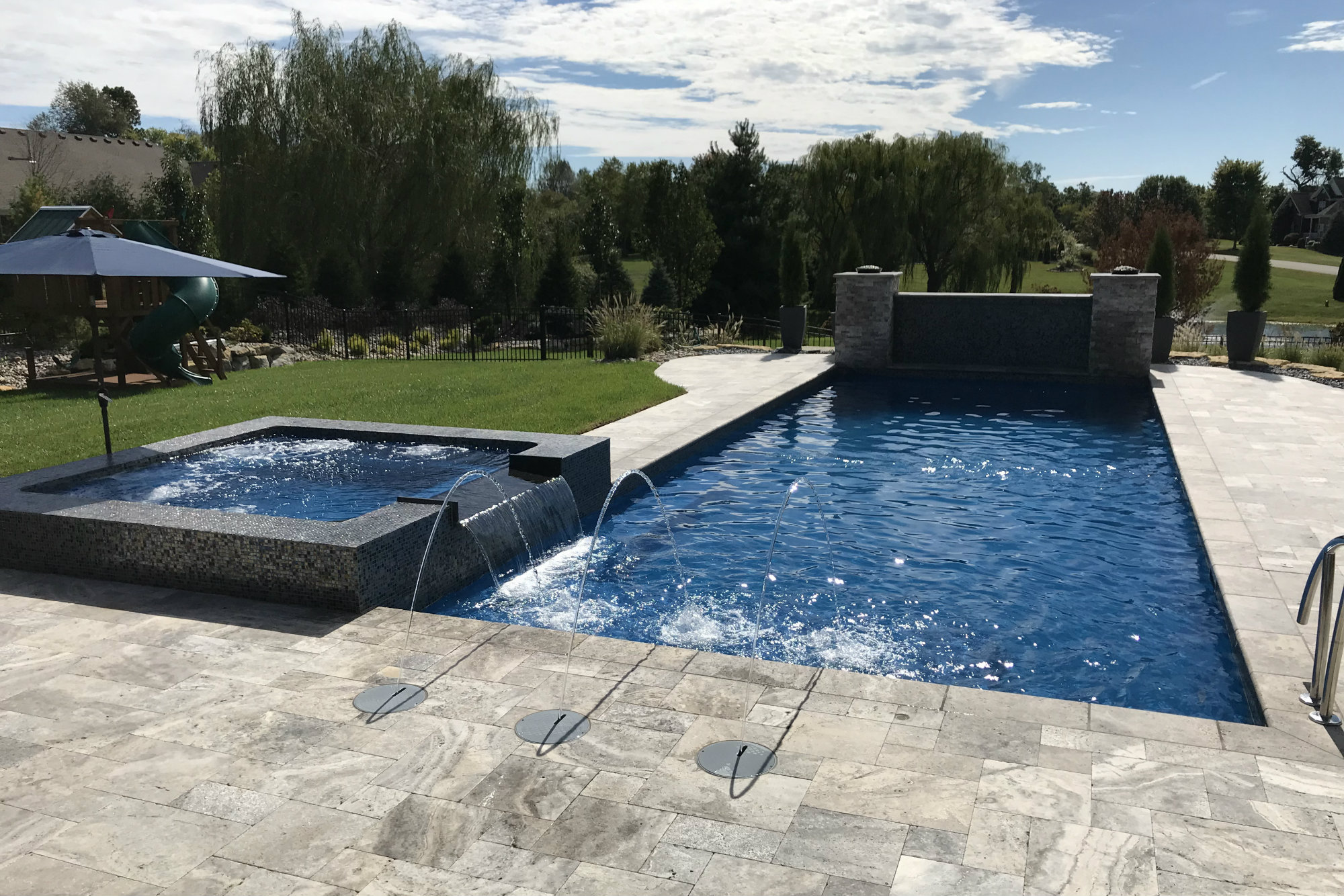 The design team, Broc and Stacy Hutchinson, owners of Sunset Fiberglass Pools in Lagrange, Ky., commissioned a custom vessel from a fiberglass pool manufacturer. Measuring 16-by-42 feet, it’s one of the largest of its kind on the market, Broc Hutchinson says. Benches on the shallow end, left side and deep end can accommodate up to 20 guests, a must-have feature for a family that likes to entertain. Likewise, the spa was custom-made with a spillover and wrapped in 1-inch tile, concealing its fiberglass surface. A granite slab on top of the spillway further disguises the fiberglass.