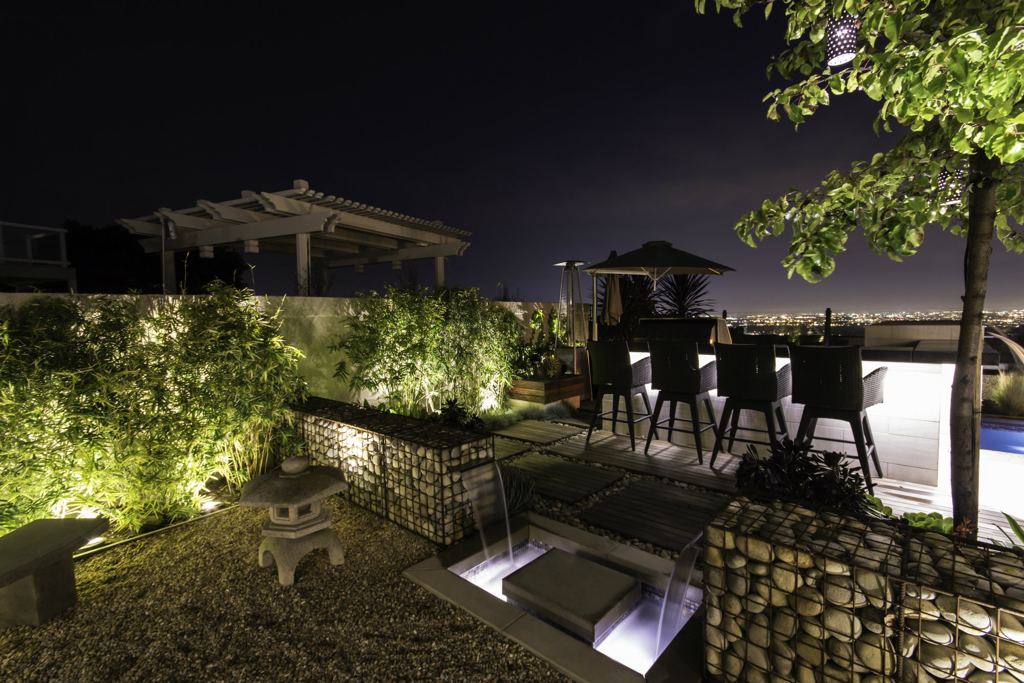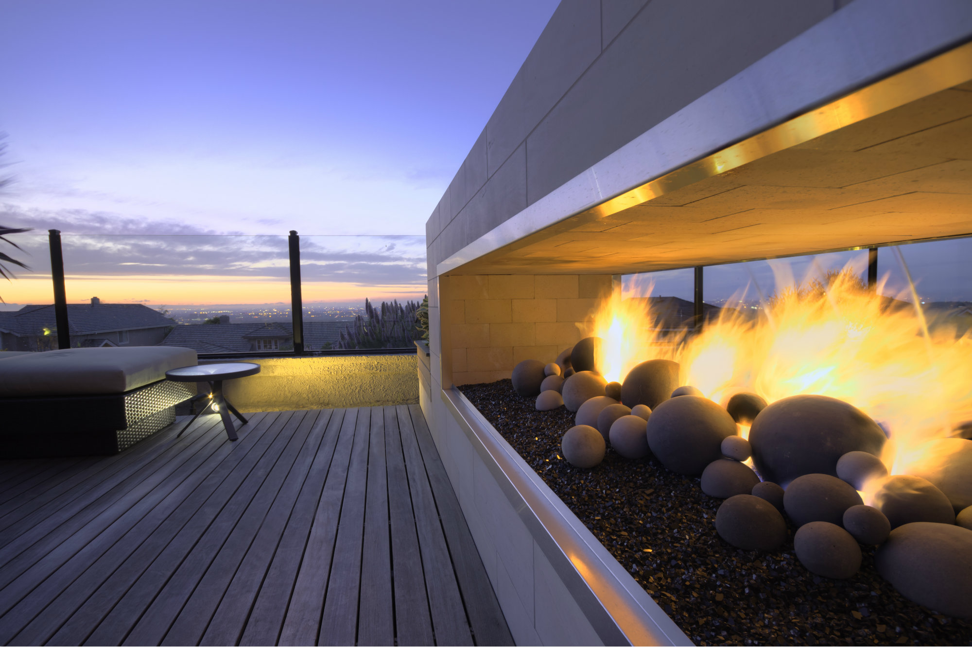 Contemporary cookout: Modern elements in the kitchen include an Ipe wood deck and a bar overlooking the city lights. But the centerpiece of this design is a glass fireplace that allows loungers a view of water spilling on the other side. Five streams flow from custom scuppers into the pool. The see-through fire feature ties this new room to the existing pool, while the fountain corresponds with the waterfeatures in the Zen garden.