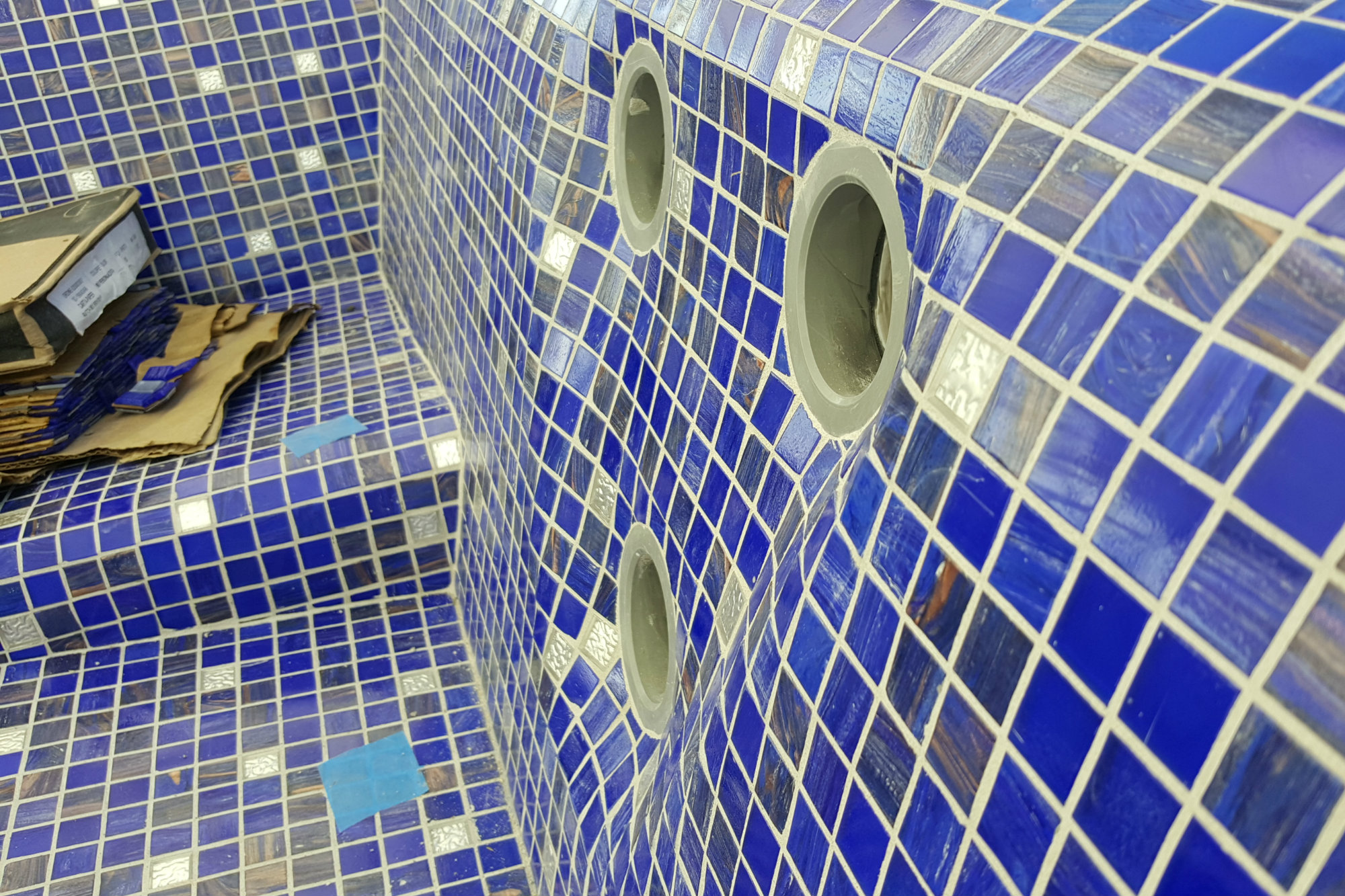 Details in azure: Chafey and Blauvelt chose an intense blue glass tile to make it obvious this was a body of water — and give it the appearance of being deeper than it was. “We wanted to stick with the theme, but we really wanted it to be obvious from the ground that you weren’t just looking through a glass panel and seeing nothing,” Chafey says. “The look is pretty impressive with that color of blue that comes through the glass panel.” Here, the spa jets are slightly recessed in the wall so the fittings, which protrude slightly, won’t push into users’ backs.