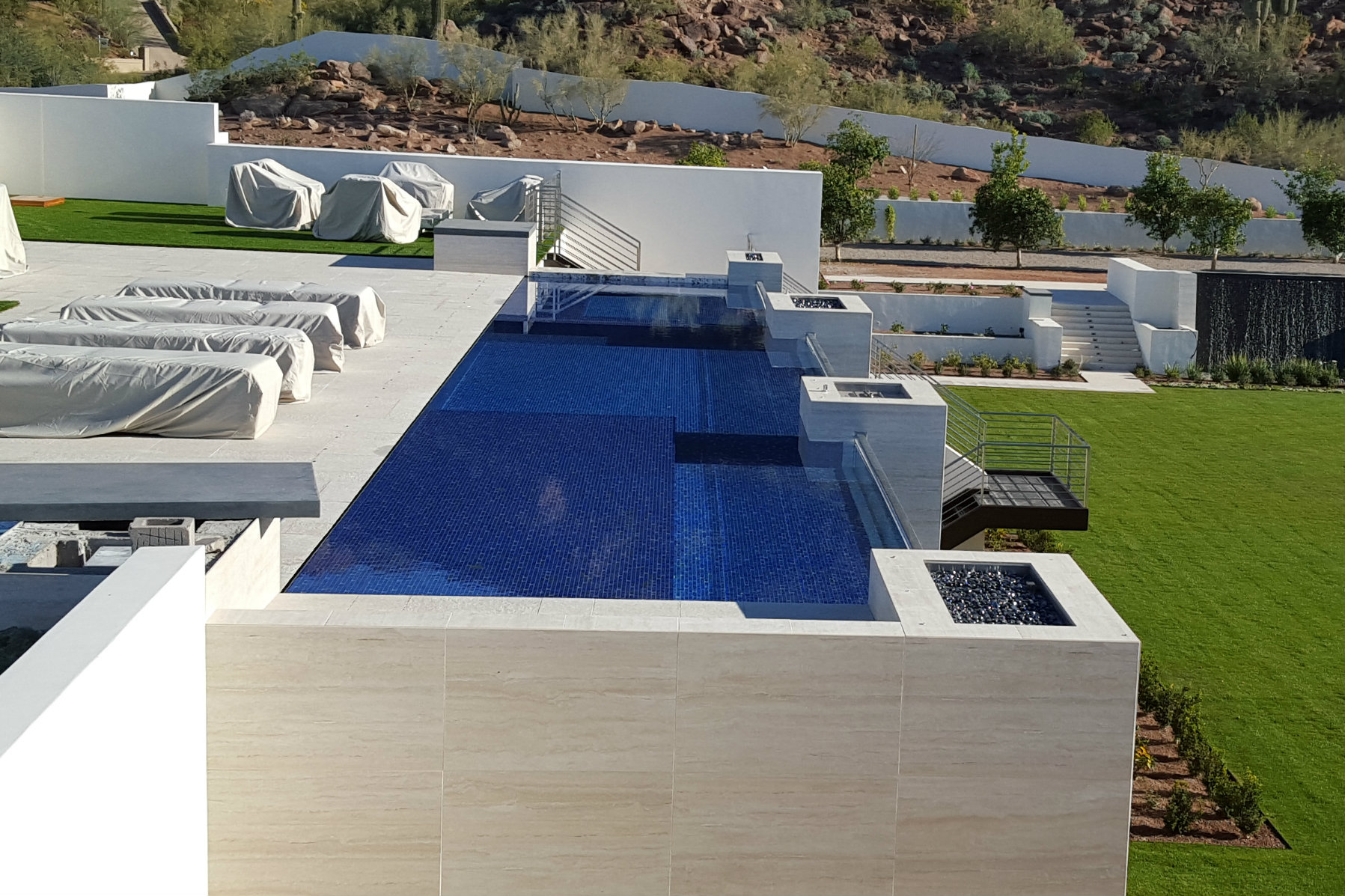 The amenities: The long, narrow pool/spa combination melds with the strong horizontal lines of the architecture, while the perimeter overflow/Lautner edge detail brings the water flush with the deck. The spa sits at the far end and features the same edge detail so it all looks like one body of water. However, when the spa is in operation, its water lowers by a fraction of an inch and the heated vessel stops overflow, so the hot and cold water don’t combine. A sunshelf in the foreground sits in about 7 inches of water. The three fire pits top support columns for the home.