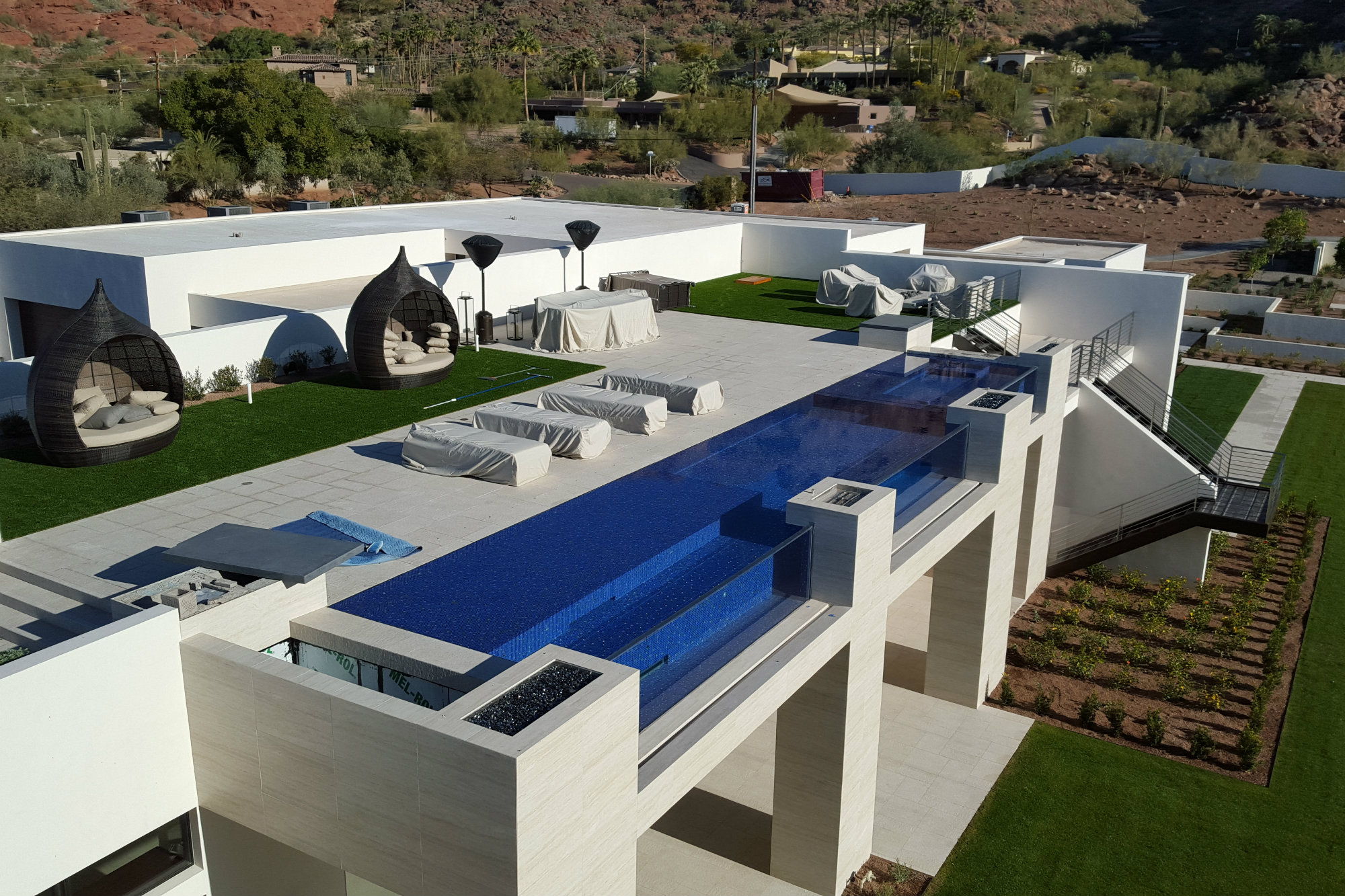 Architectural integrity: When the design team came onto this project, the plan was to build the house, then determine how a pool could be added onto the existing structure. They estimated that they could have a 1-foot-deep pool. Neither parts of that equation worked for Red Rock Pools & Spas. “The pool wouldn’t really work on the roof of the structure without it being extremely shallow, not matching the architecture at all, or breaking up the lines or the architecture,” says Rick Chafey. “So we got in with the client and looked at how we could accomplish the concept of a rooftop pool and yet have it mold and meld into the architecture seamlessly so it doesn’t look like a pimple on the side of the building or be a nonfunctional body of water.” One key to success was building the pool such that it would not be supported by the building, but actually serve as part of the abode’s reinforcement. The other was blending the clean, long lines with the outer glass panels for a stunning minimalism. The home was built by Brimley Development of Scottsdale, Ariz.