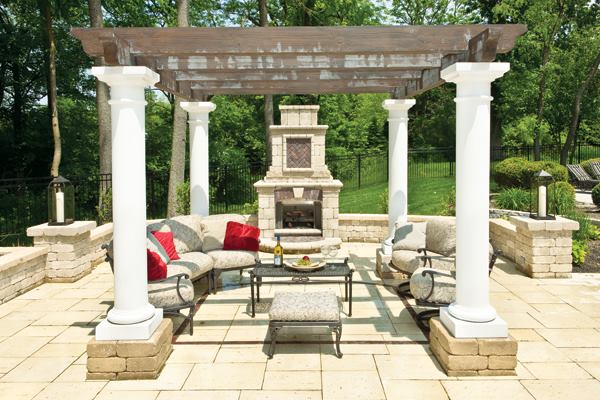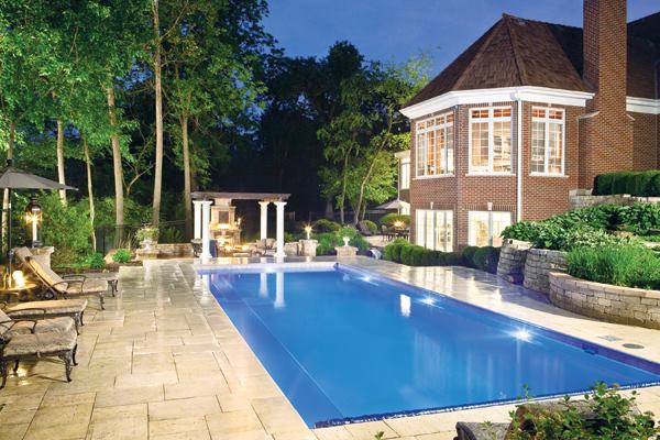 An adjacent stone grotto houses a spa featuring a custom concrete lid and a tile surround with built-in drink holders. “When I started doing this 12 years ago, fiberglass pools were a basic shell. It’s come a long way and the perception about fiberglass pools is really changing. People want the benefits of fiberglass, but they also want all the high-end features. We have to catch up and find ways to do it,” Emmerson says.