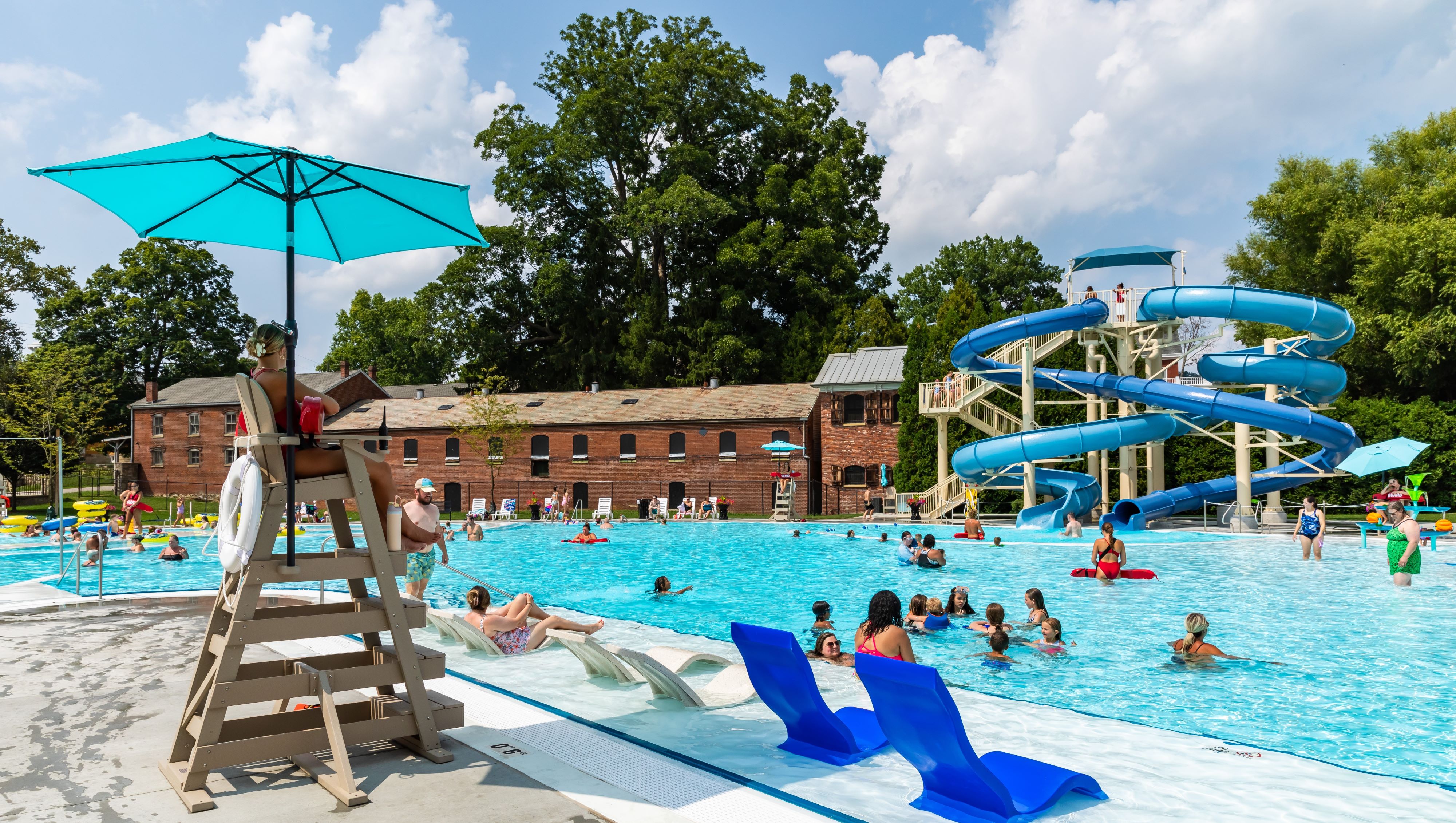 The showcase of the yard sits at one end of the long pool — the clear spa emerging 18 inches out of the water.