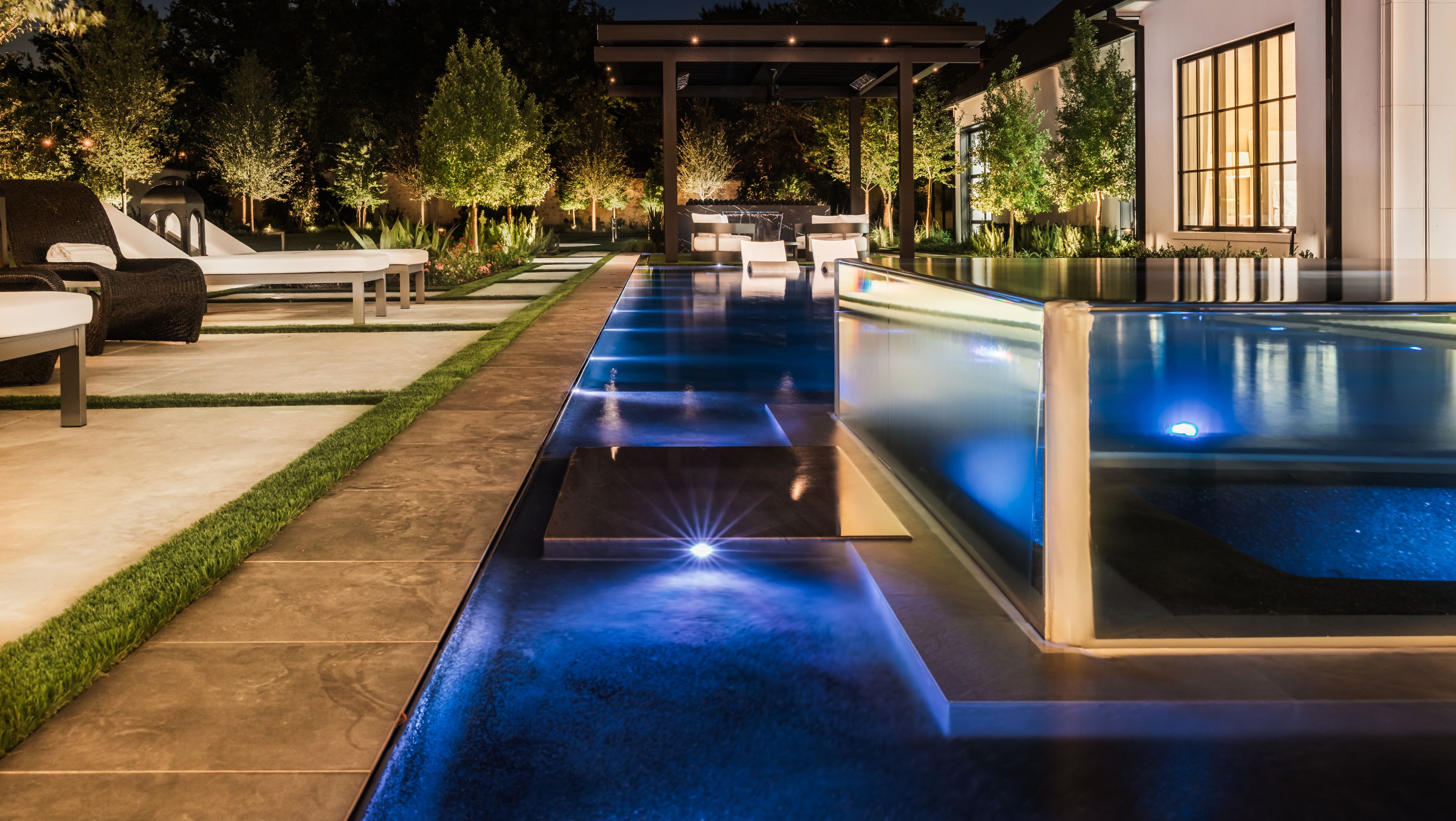 The designers decided to take advantage of the setting, lean into their modern design chops and, in the process, show off their skills at working with acrylic panels. They crafted a long, lean rectangular pool whose raised perimeter-overflow spa looks like a block of ice raised from the dark water. That effect comes courtesy of the four acrylic panels that form the spa’s borders above water.