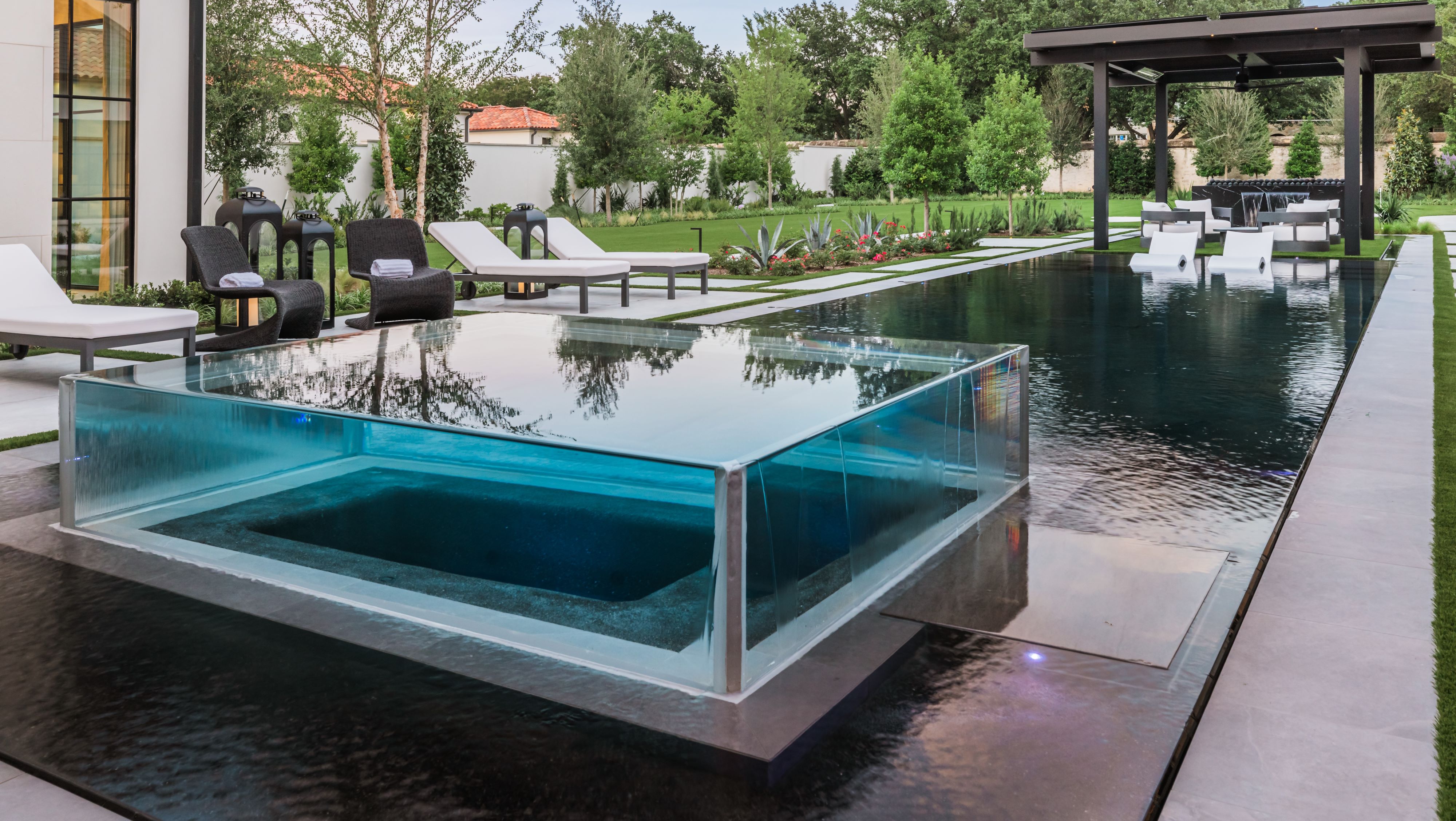 “We knew the focal point of that project was the acrylic spa in the front,” says Nick Hauk, president and founder of Pure Design, a pool design and construction firm based in Frisco, Texas . “We wanted that to be the crown gem, so that when you walk in the front door you get that incredible shot with the spa front and center.”