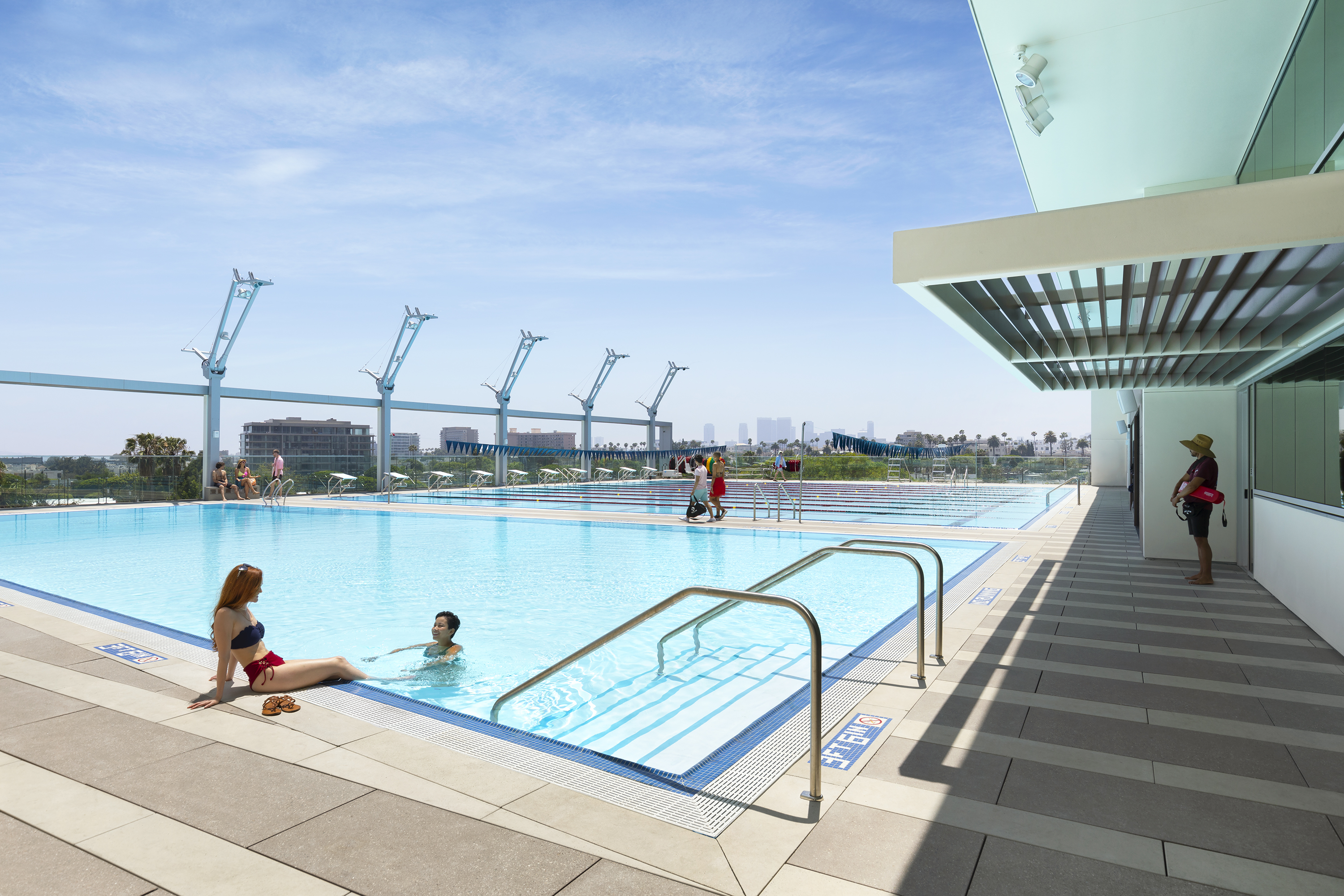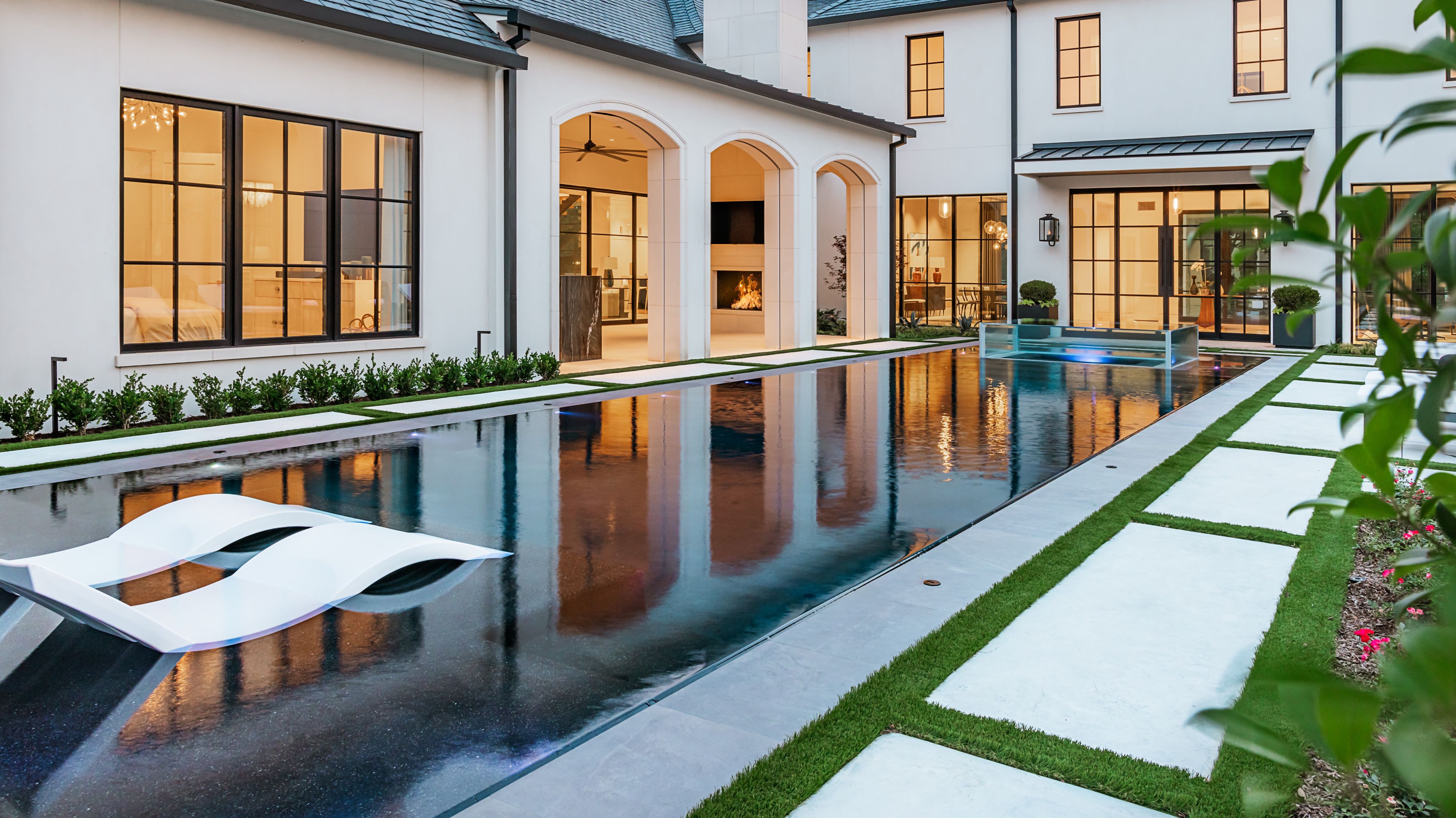 An 80-foot-long rectangular pool, with black pebble interior and perimeter-overflow design, provides the ultimate reflective surface to anchor the modern look.