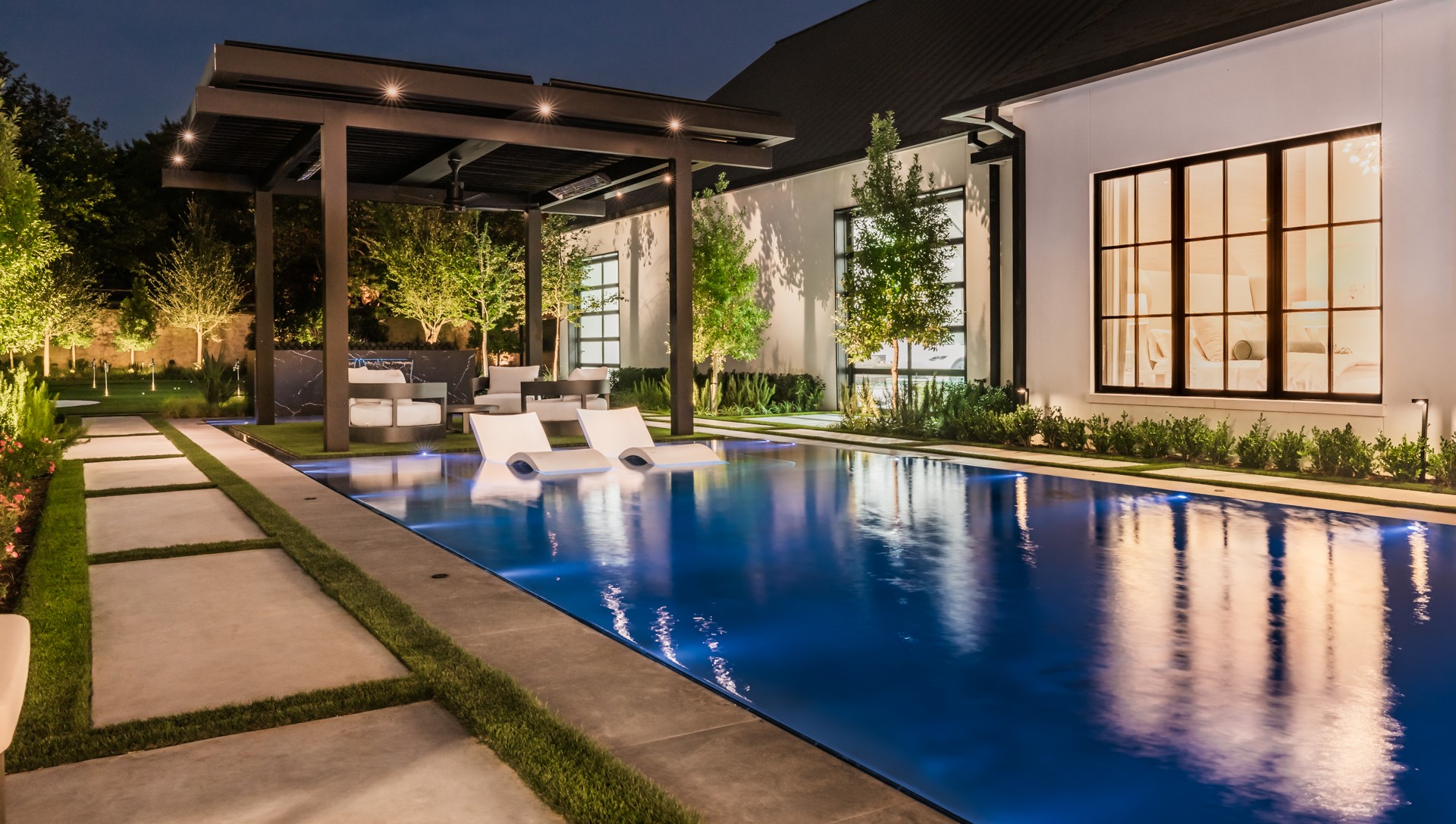 The home on this property somewhat straddles styles. While its peaked roofs read as traditional chateau, the straight lines and materials lean on the modern side. When the homeowners approached the backyard-design team, they said they preferred to veer toward modern, having already completely outfitted the home interiors with furnishings and décor to match.