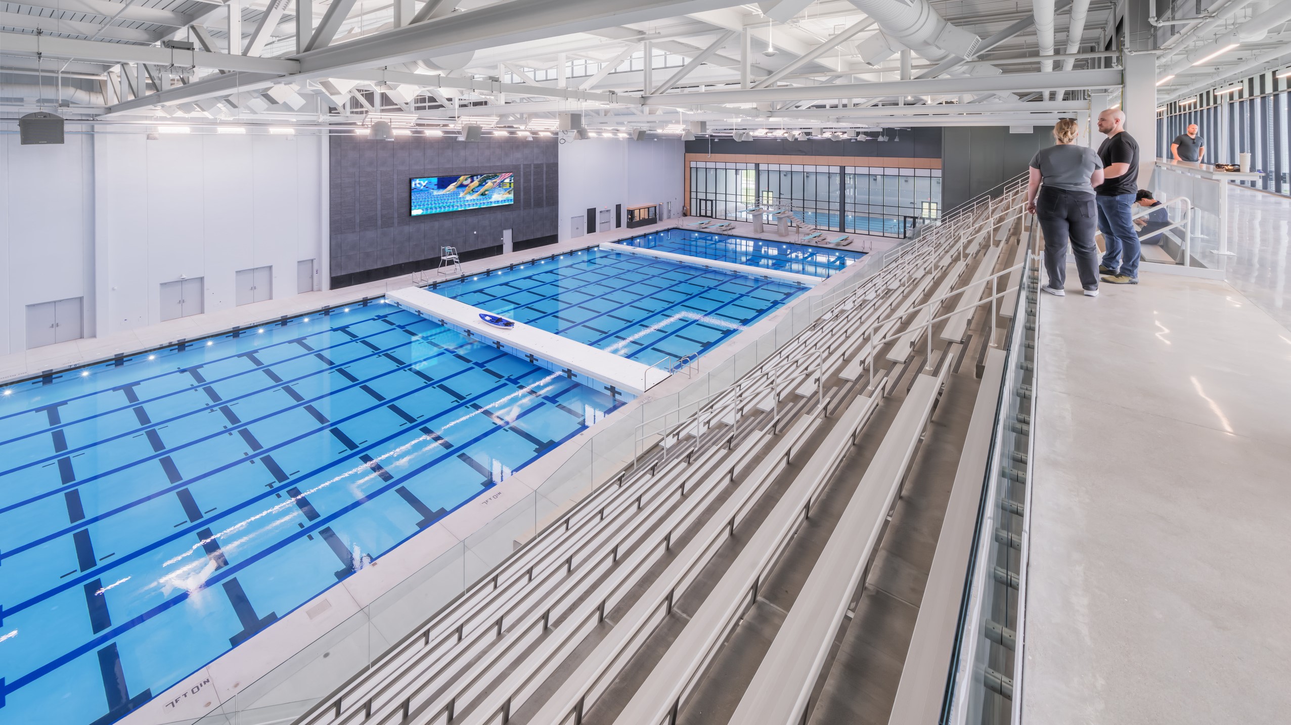 Under the water, the spa’s shell is crafted of shotcrete and finished in black pebble. The top of the shotcrete spa walls sit just underwater and also serve as the rebate for the acrylic panels — or that ledge into which the panels were inserted.
