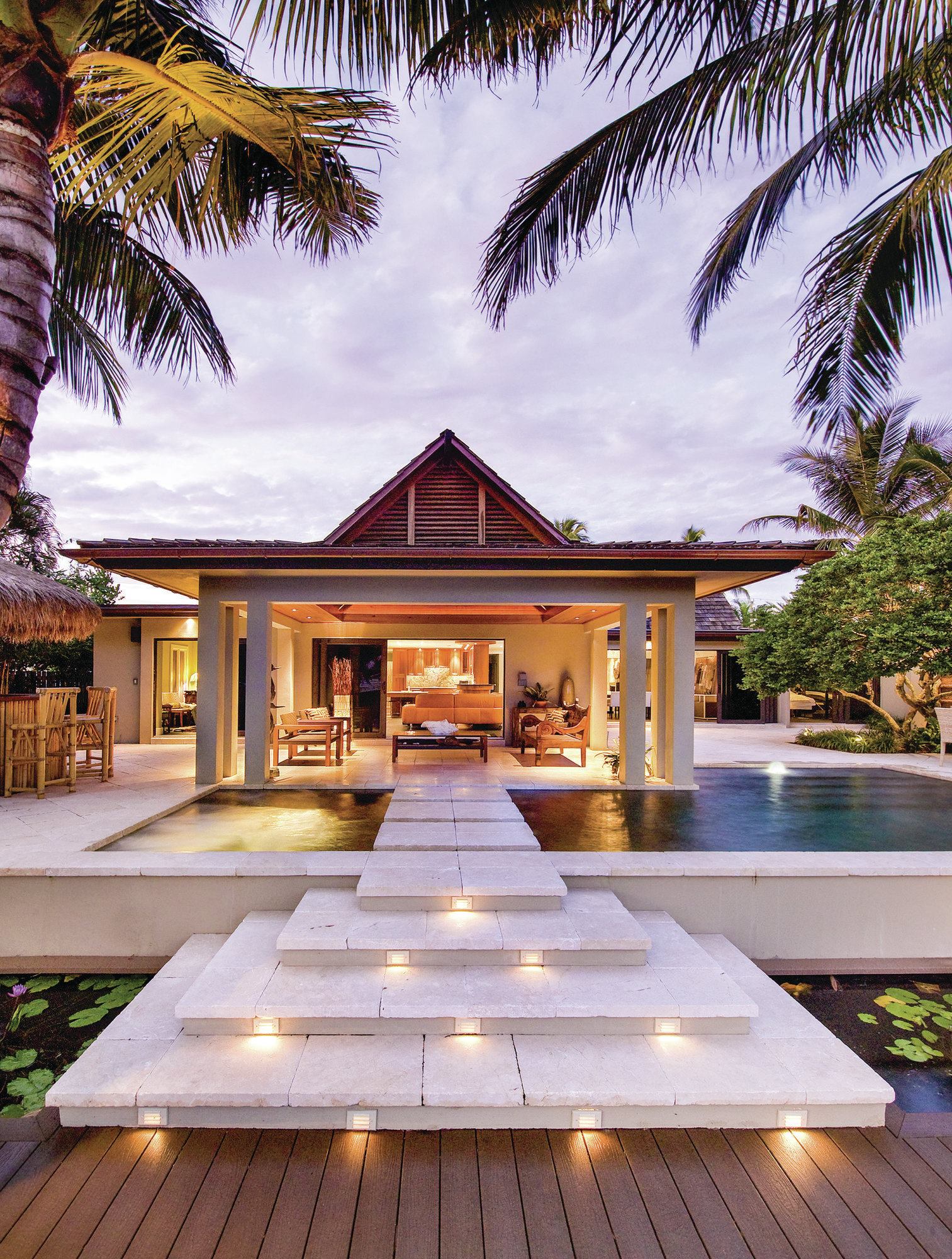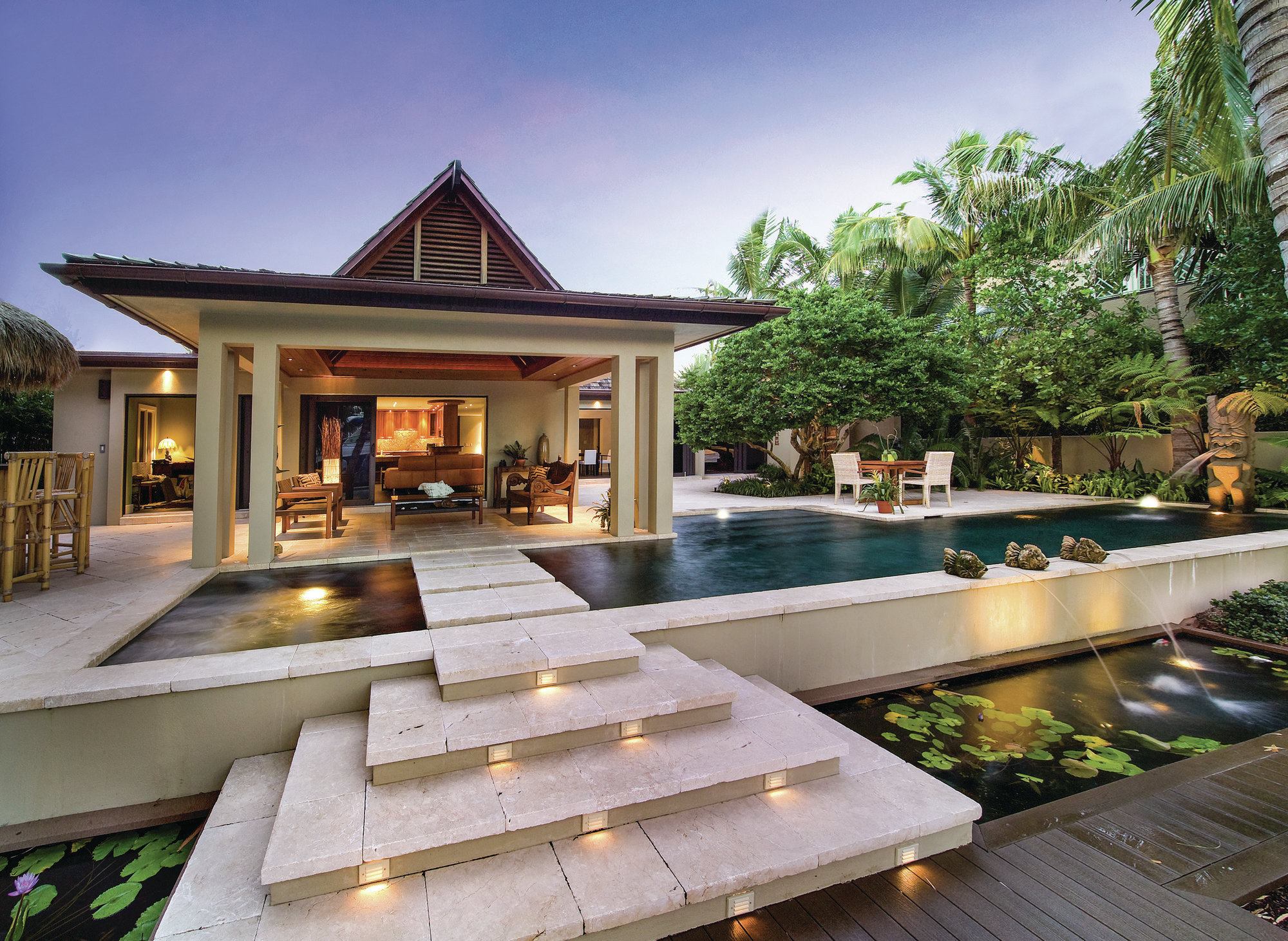 Seaside integration: A wood dock conceals the concrete seawall butting up against the property and goes 4 to 5 feet into the backyard. The yard’s layout visually and physically links all major components. Brushed Jerusalem stone steps lead up from the dock, over a koi pond and to a set of stepping pads that appear to float across the pool, allowing direct access to the lanai and also aligning with the home’s main axis. The floating pads also split the aquascape, with the spa on one side and pool on the other. The support columns from the lanai are built on the pool structure so they could stand merely 1 inch from the water. “It creates this more seamless look,” Kukk says. Because of this, the aquascape had to be built before the lanai, so crews worked from the dock back.