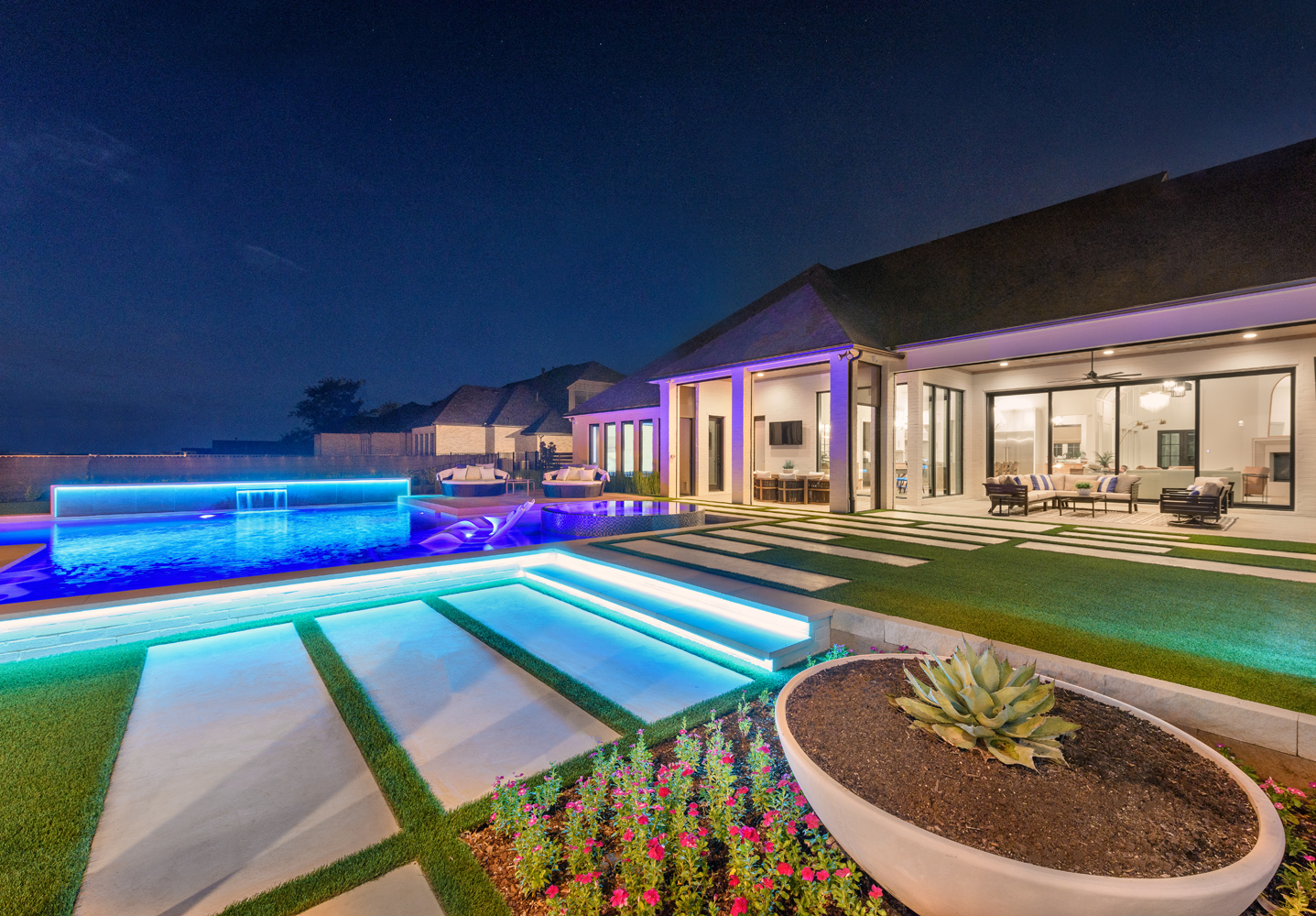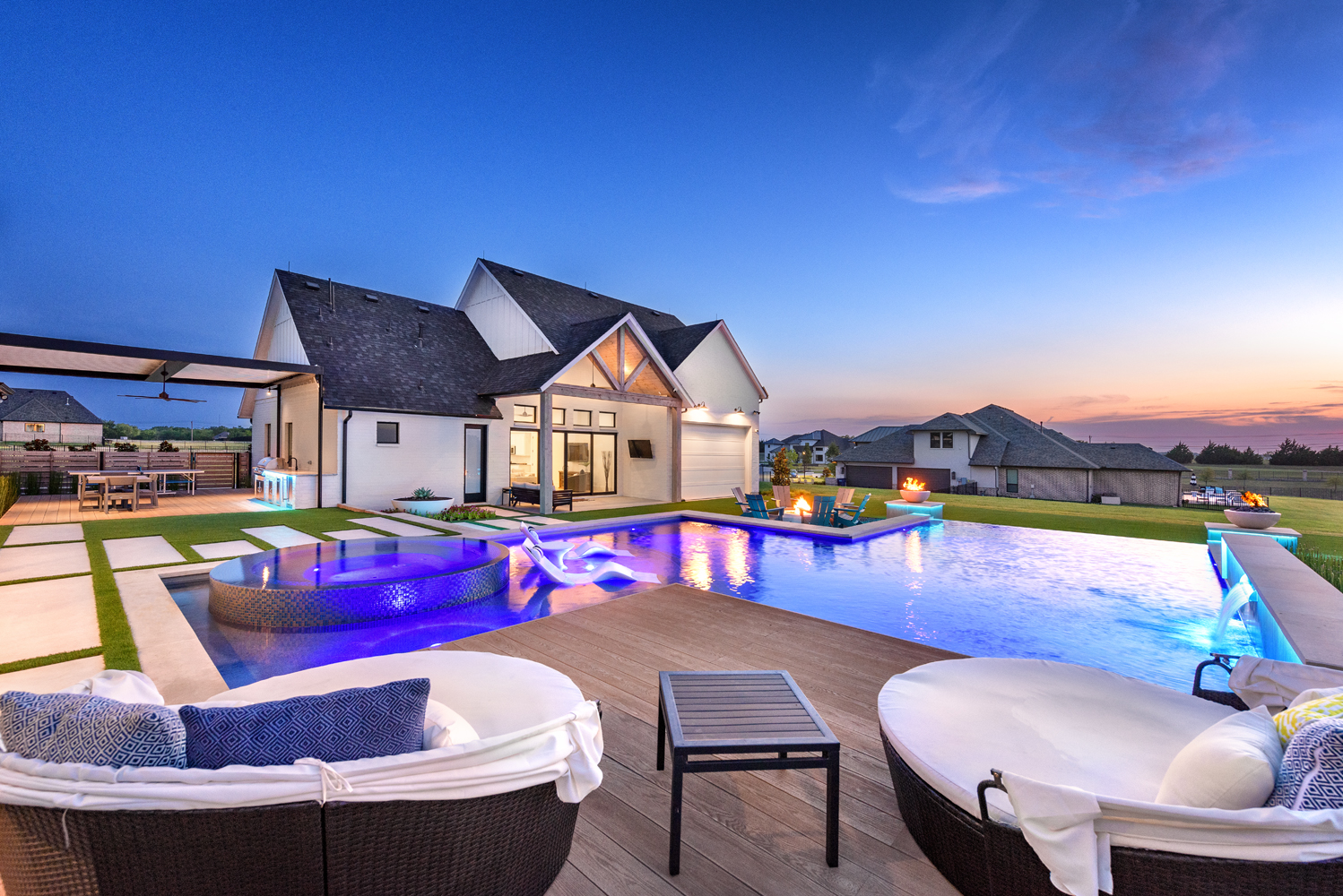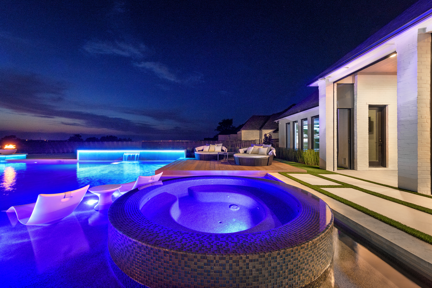 Fire bowls bookend the vanishing edge, while a raised bond beam with sheet waterfall sits on the side.