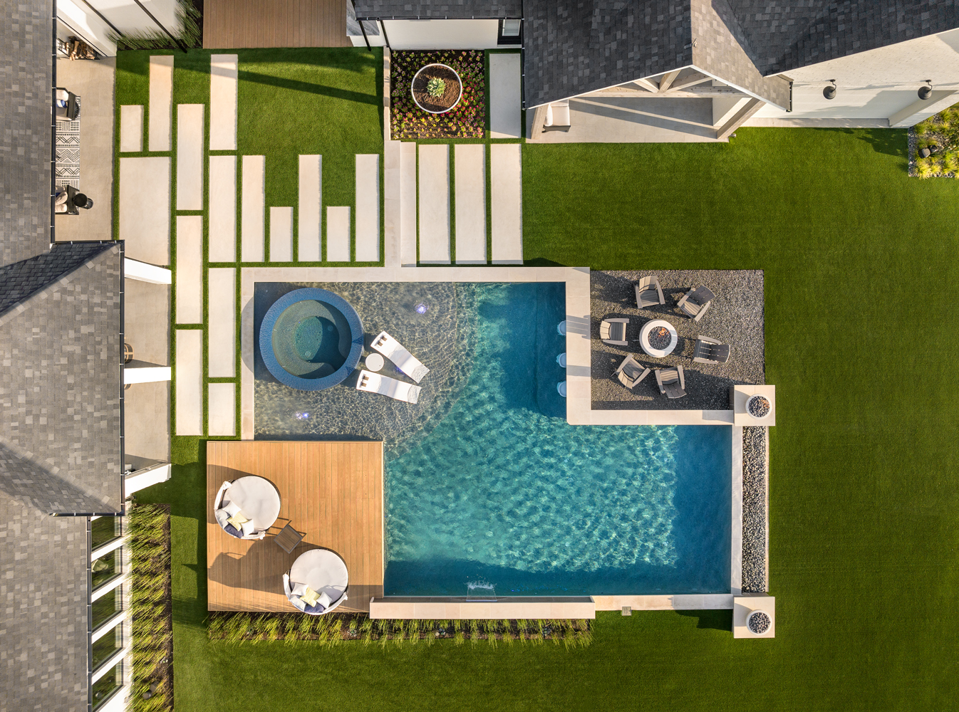 To blend with the home, Thevenot knew he would craft a rectilinear poolscape and use straight lines throughout the backyard.