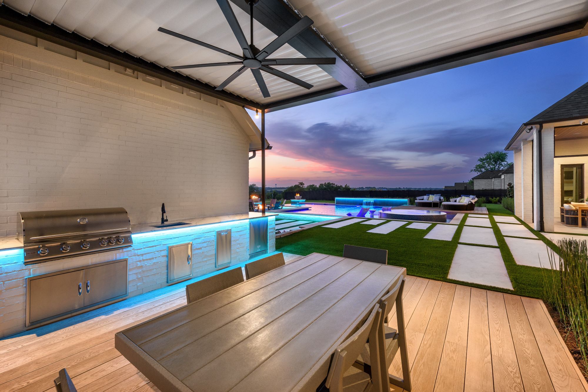 An outdoor kitchen with louvered roof outdoor kitchen space completes the scene.