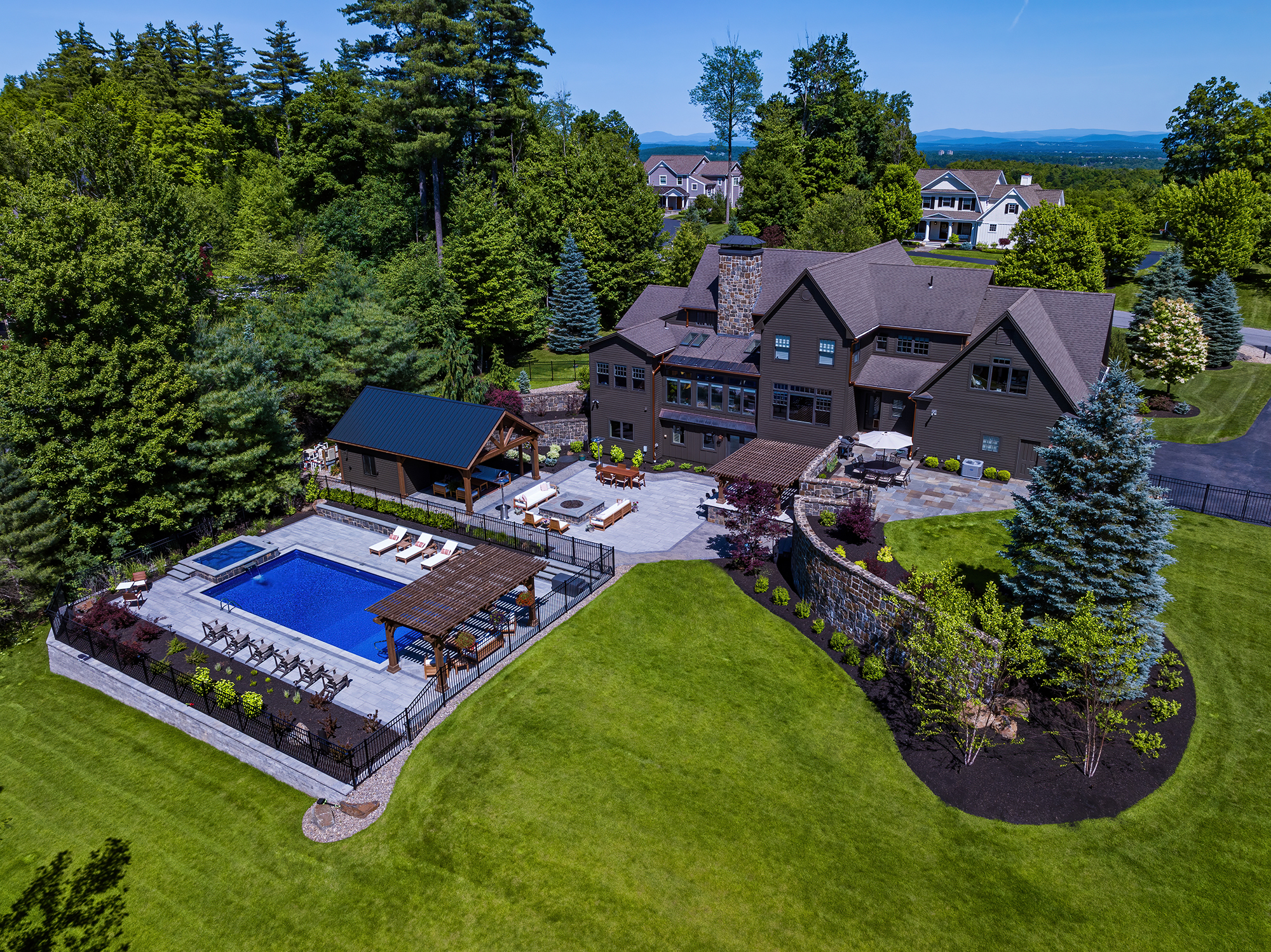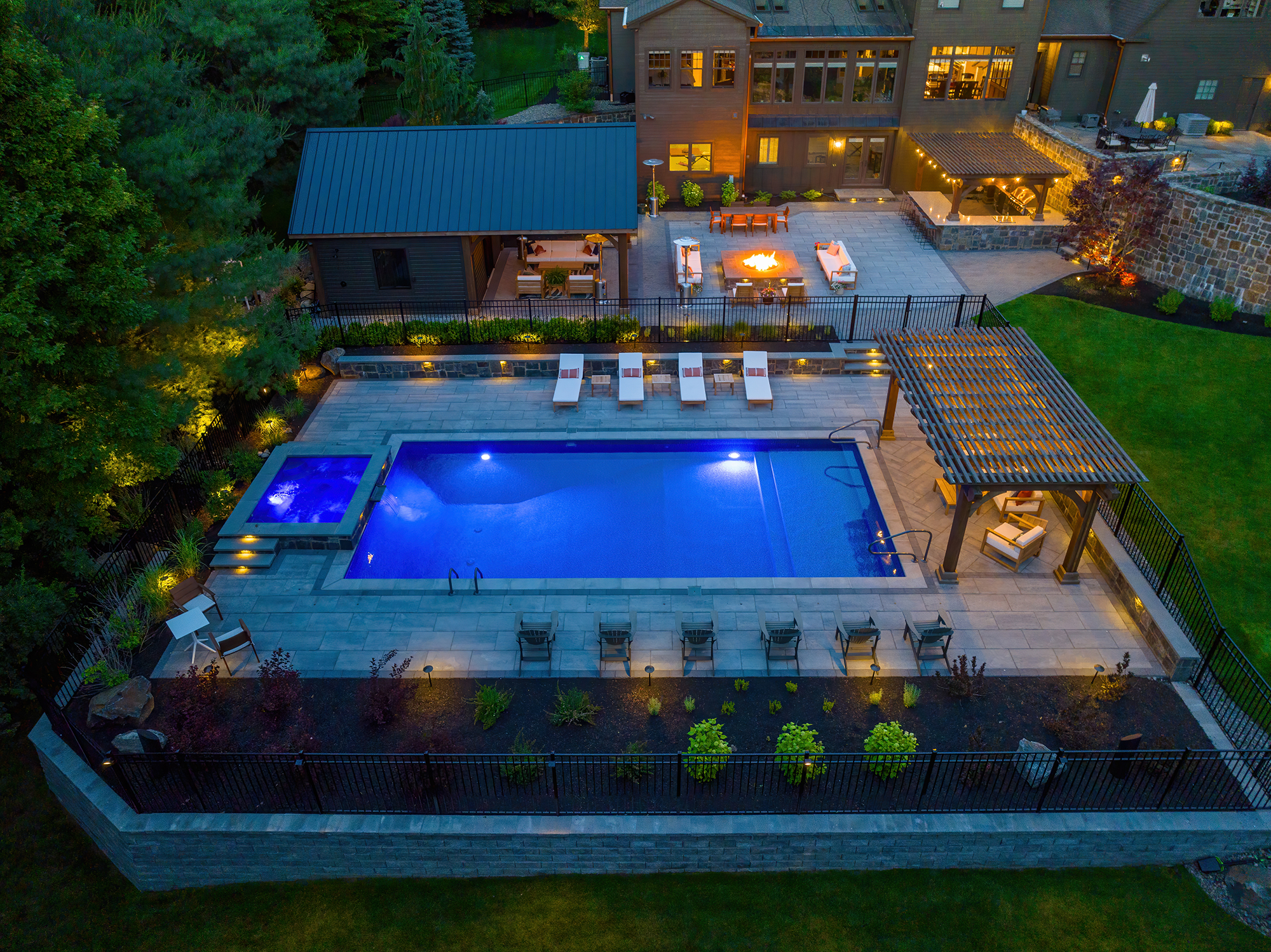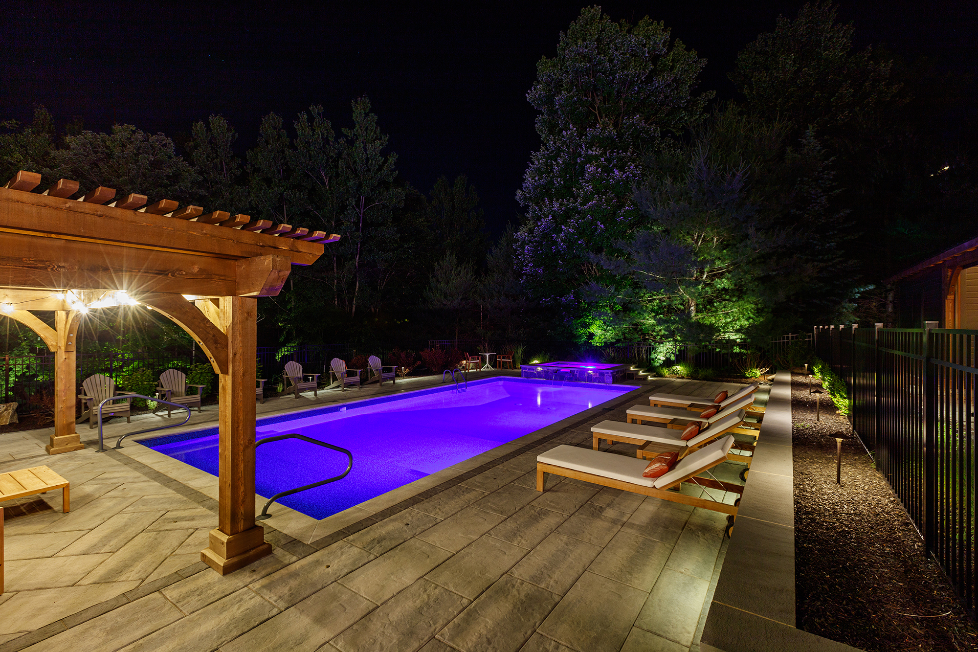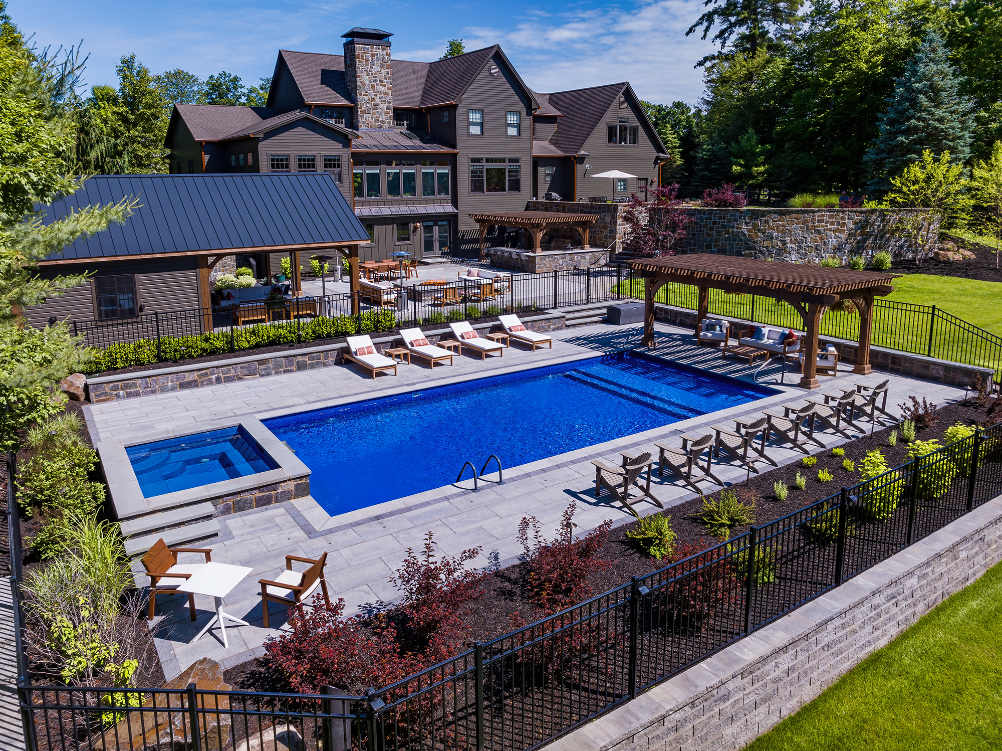 They asked for a design that encompassed the whole backyard, with different levels to hold family gatherings and entertain. The team at Concord Pools, based in Latham, N.Y. designed and built the vinyl liner pool and partnered with a hardscape company to create the other areas.