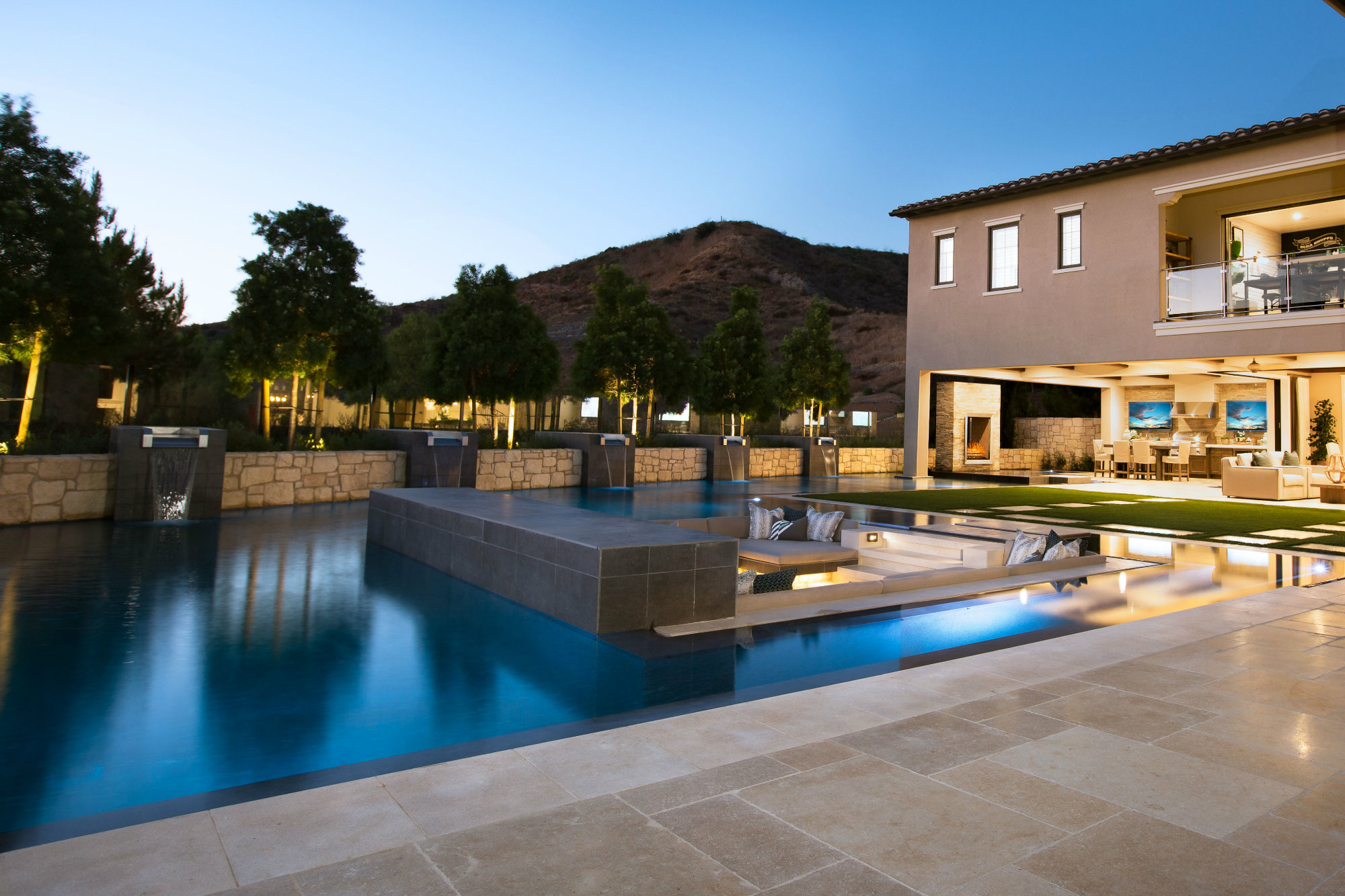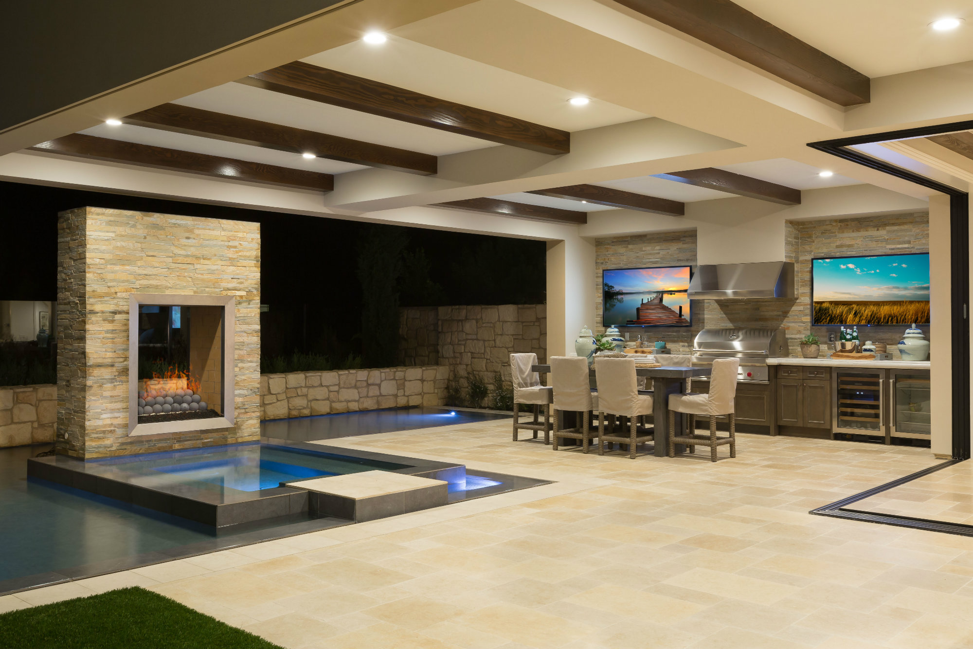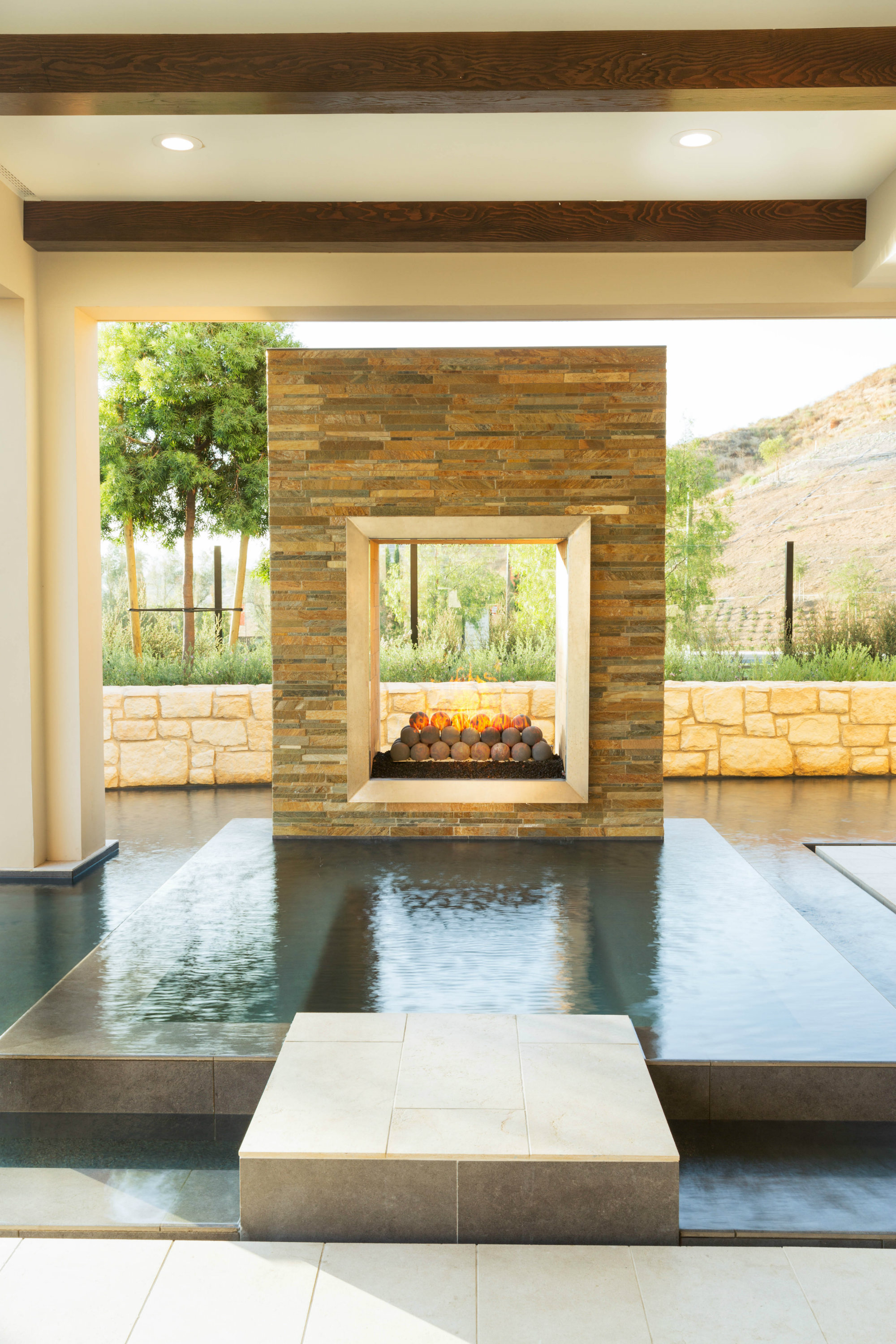 Sheltered by the home’s overhang, a perimeter-overflow spa supports a double-sided fireplace on its wall. The open firebox allows a view beyond. Water oozes over the surface on both sides, for a wet-wall effect. A stainless steel frame around the firebox, protruding slightly from the stonework, diverts falling water away from the flame.
