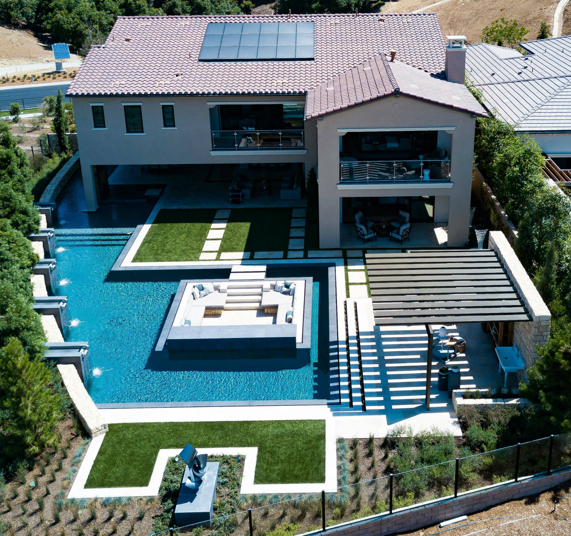 In that spirit, the pool surrounds a sunken seating area. The stone-clad fireplace keeps a low profile so loungers can see over it.