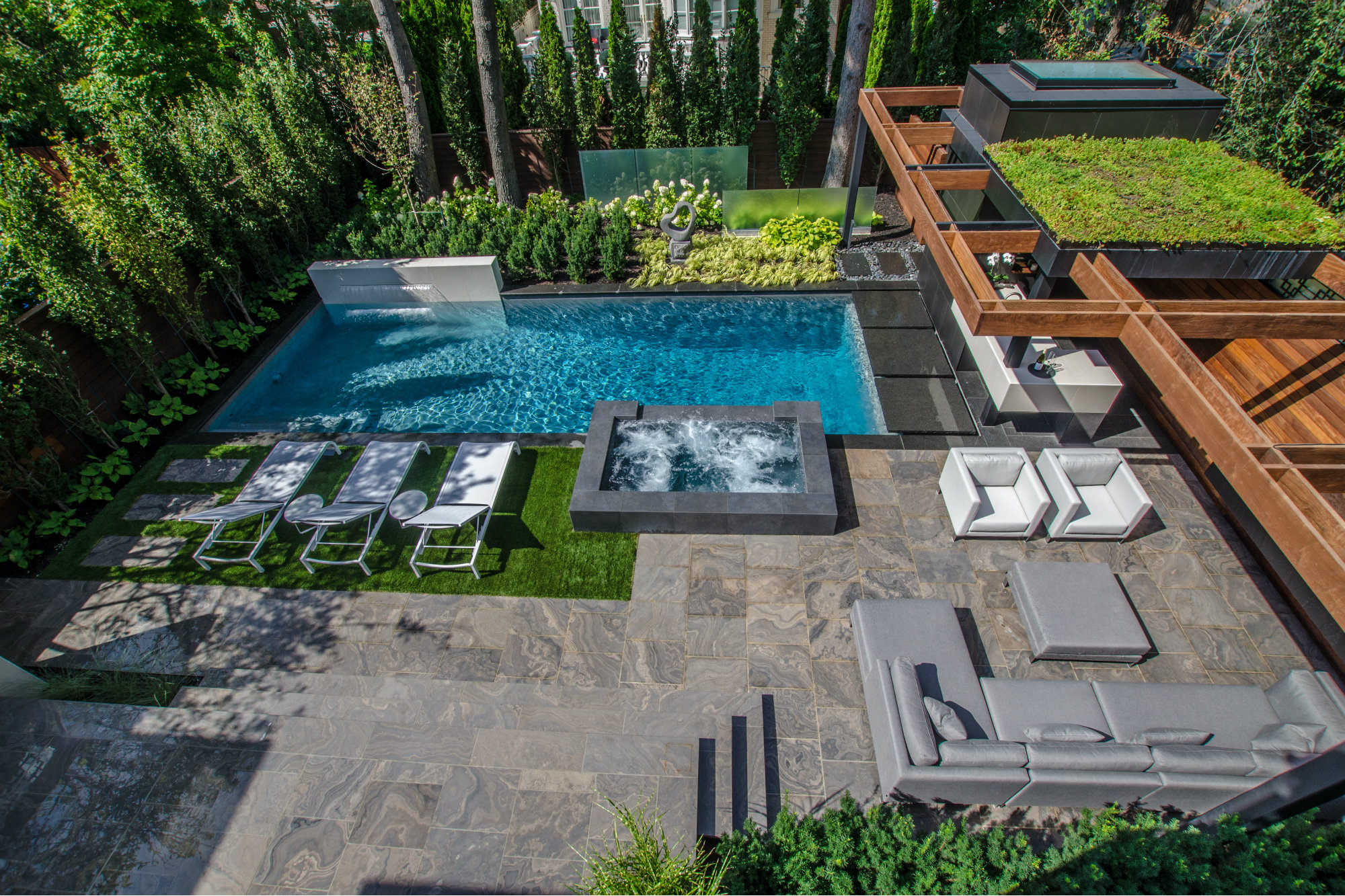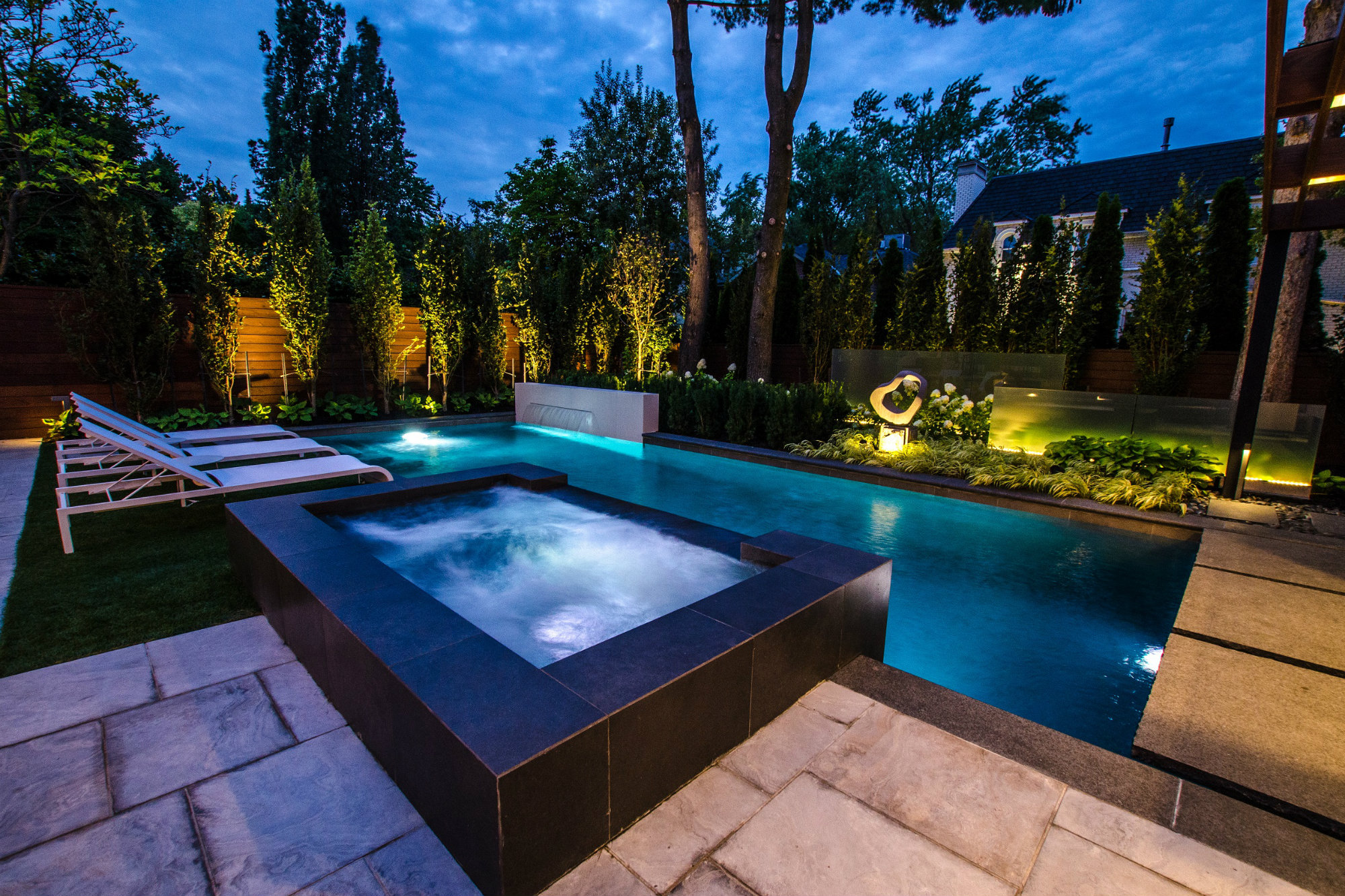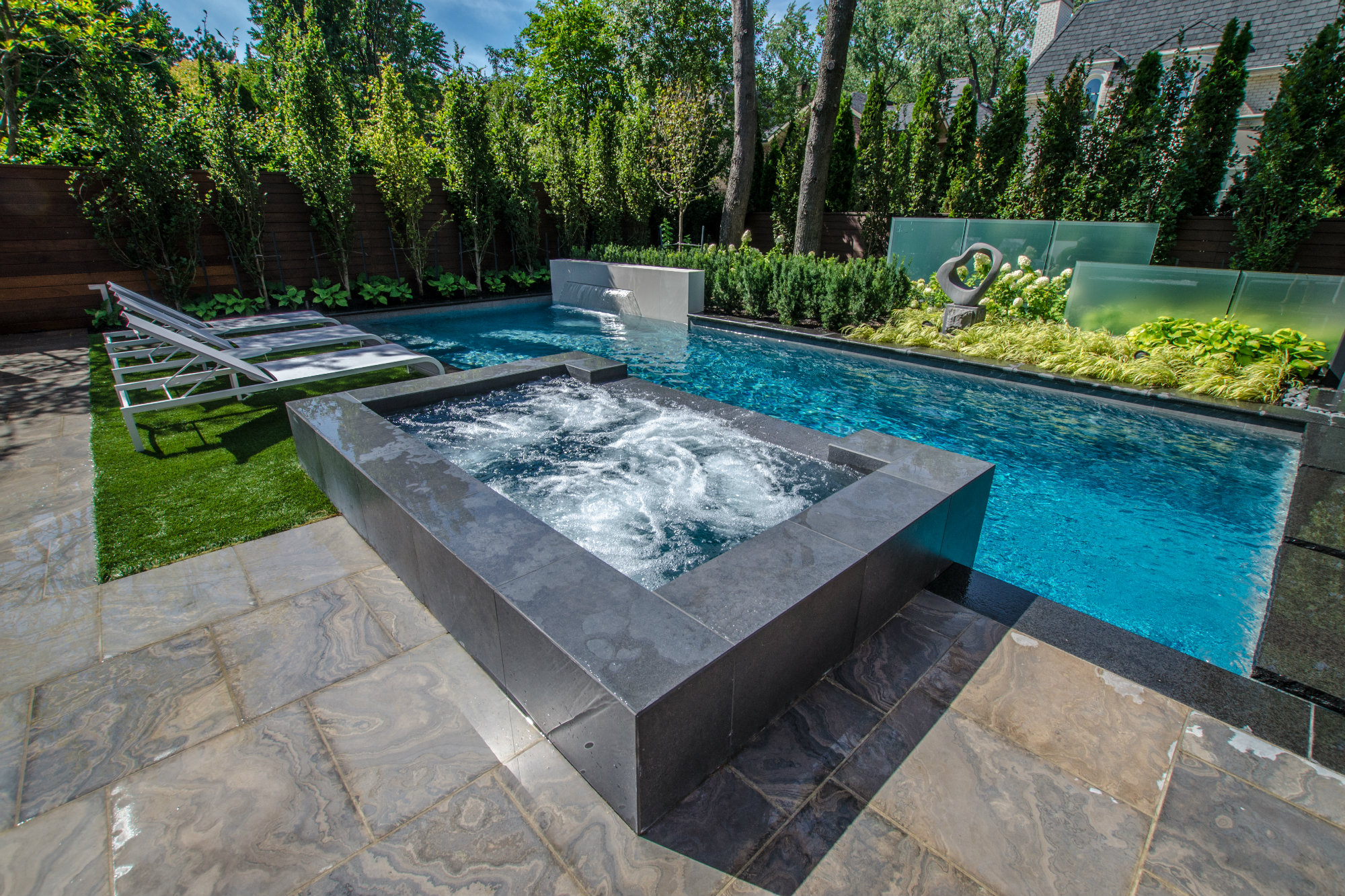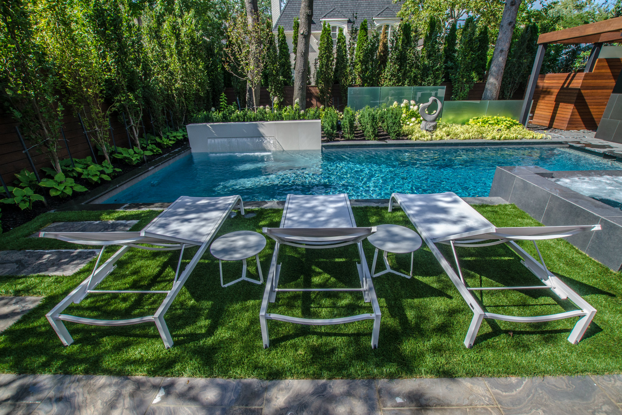 We see very interesting use of the thin vertical elements on the backside of the pool. The fountain wall and staggered glass panels have the effect of making the overall space feel larger — not smaller. The use of the glass panels and sculpture draw the eye beyond the pool and create another “room” to the rear property. Quite nice!
