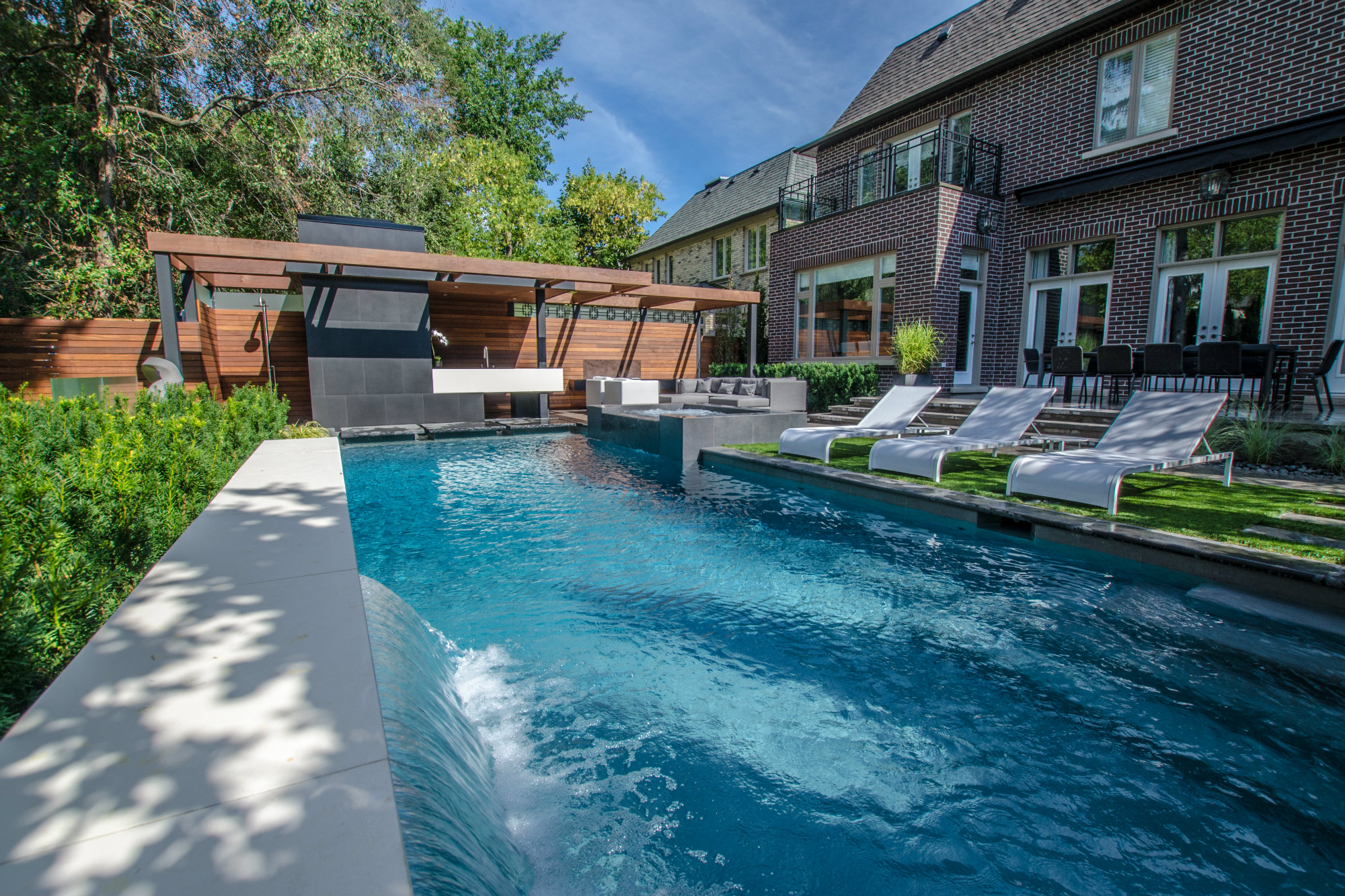 Color blocking throughout visually breaks the backyard down to its essential components, reinforcing the air of simplicity. Large-format tile helped with this approach, as the tighter grid formed by smaller tiles seemed too fussy. Large white tiles veneer the sheet waterfall in the back corner, going all the way down to the pool floor for continuity. For contrast, large black tiles clad the cabana at the other end of the pool.