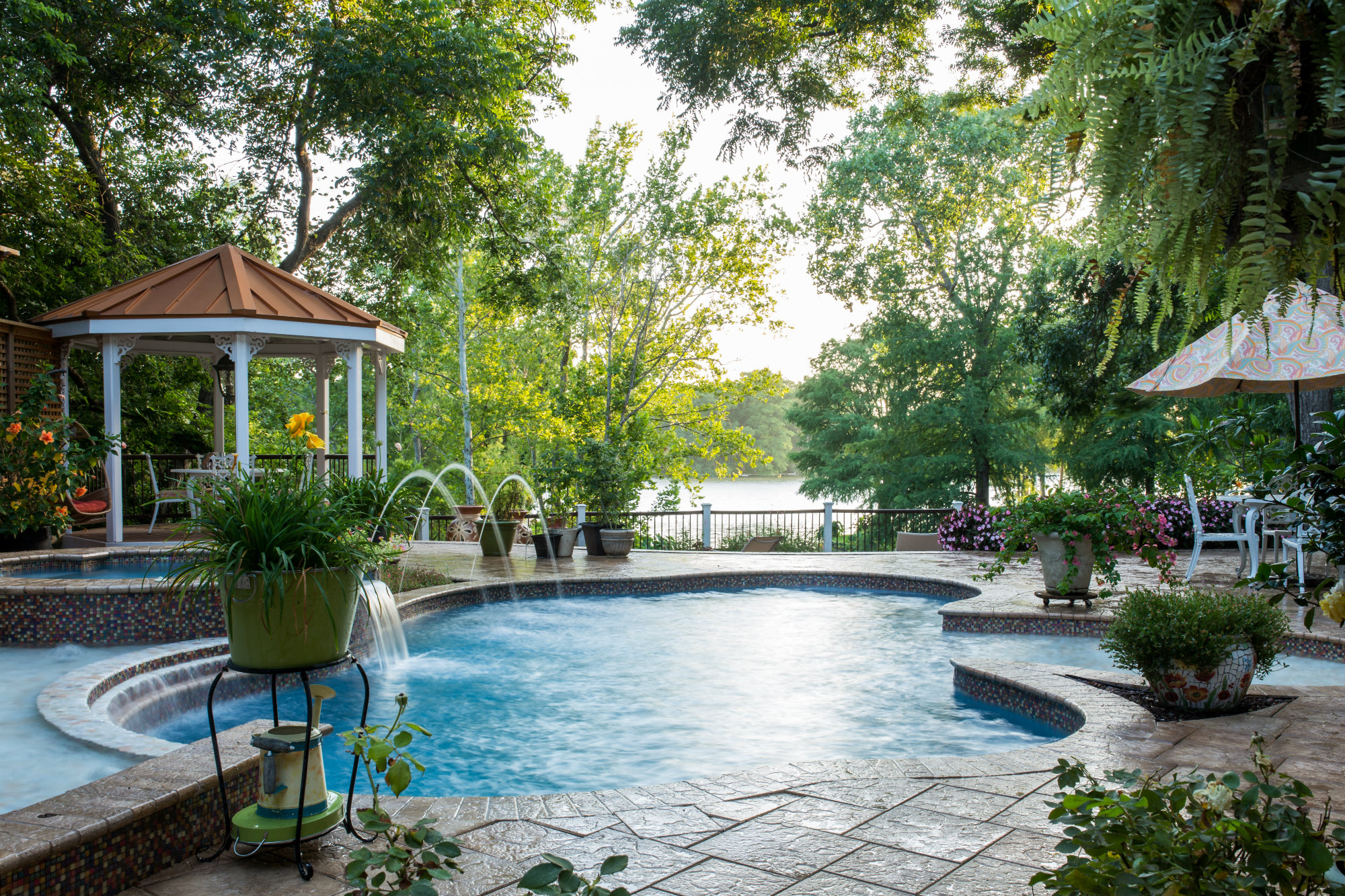 But First: Before the crews could get started with construction, they first had to remove a large wooden deck that was covering an old, empty vinyl-liner pool that had been out of commission for years. The old pool was filled in and the new construction began in a different part of the backyard. The foundation of the backyard was even raised so that patrons could enjoy the pool and patio while still taking in the lakefront views.