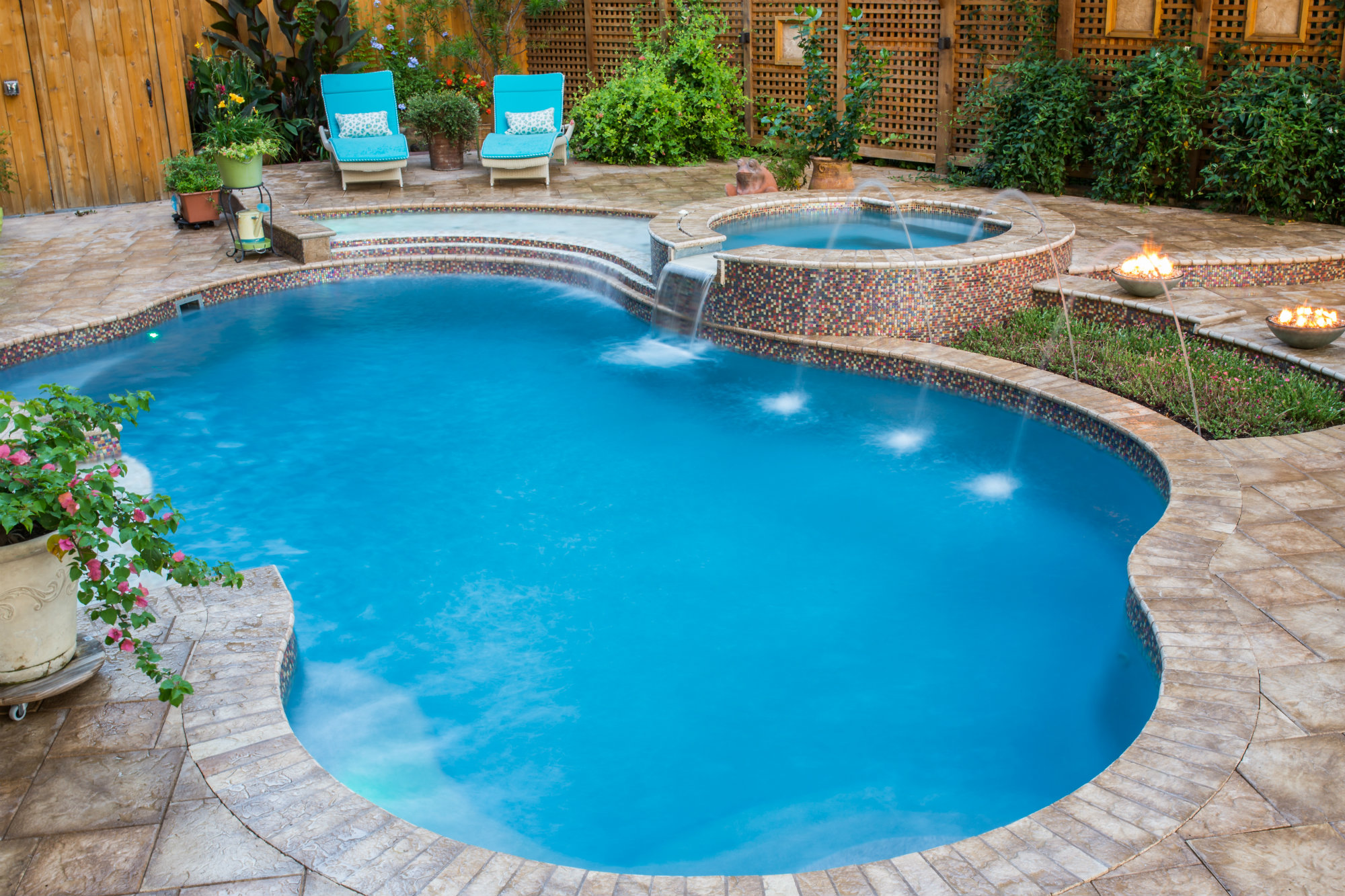 Customized Look: The homeowner was a bit skeptical about choosing a fiberglass pool for her new backyard waterscape because of the predetermined selection of shapes and sizes. But she was completely on board once Bret Shallenberger explained how he could customize it to her specifications. The design started out with a lagoon-style pool customized to include a tanning ledge, and a raised spa was added. Water flows from the ledge and spa into the pool. The result is an aquascape that makes perfect sense for the space and use. “There was no set initial design,” Shallenberger says. “We created as we built. [The homeowner] trusted me.”