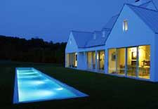 Along with the architect and landscape architect, von Lewinski created an 8-by-69-foot minimalist masterpiece, which literally looks as if it’s airborne in the evening. “The illusion is created simply by the fact that when it’s dark at night, all you see is the lighted pool and its dimensions,” says von Lewinski. “There’s nothing else lighted around the pool. There is darkness and this long, rectangular light source that looks like it’s floating.”