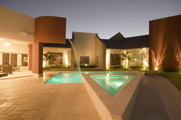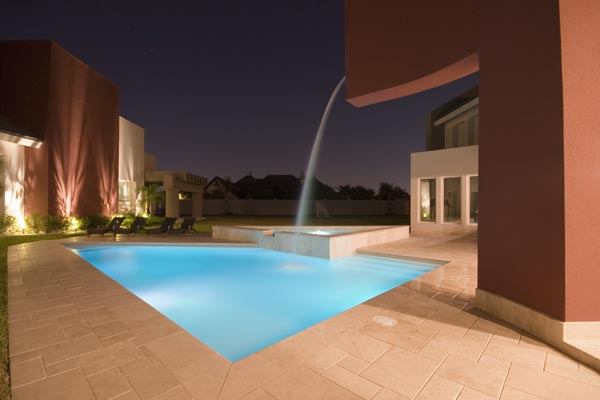 The home is set on the 18th hole of a golf course. The back of the vanishing-edge wall provides eye candy for those strolling by on the course but maintains privacy for the homeowners.