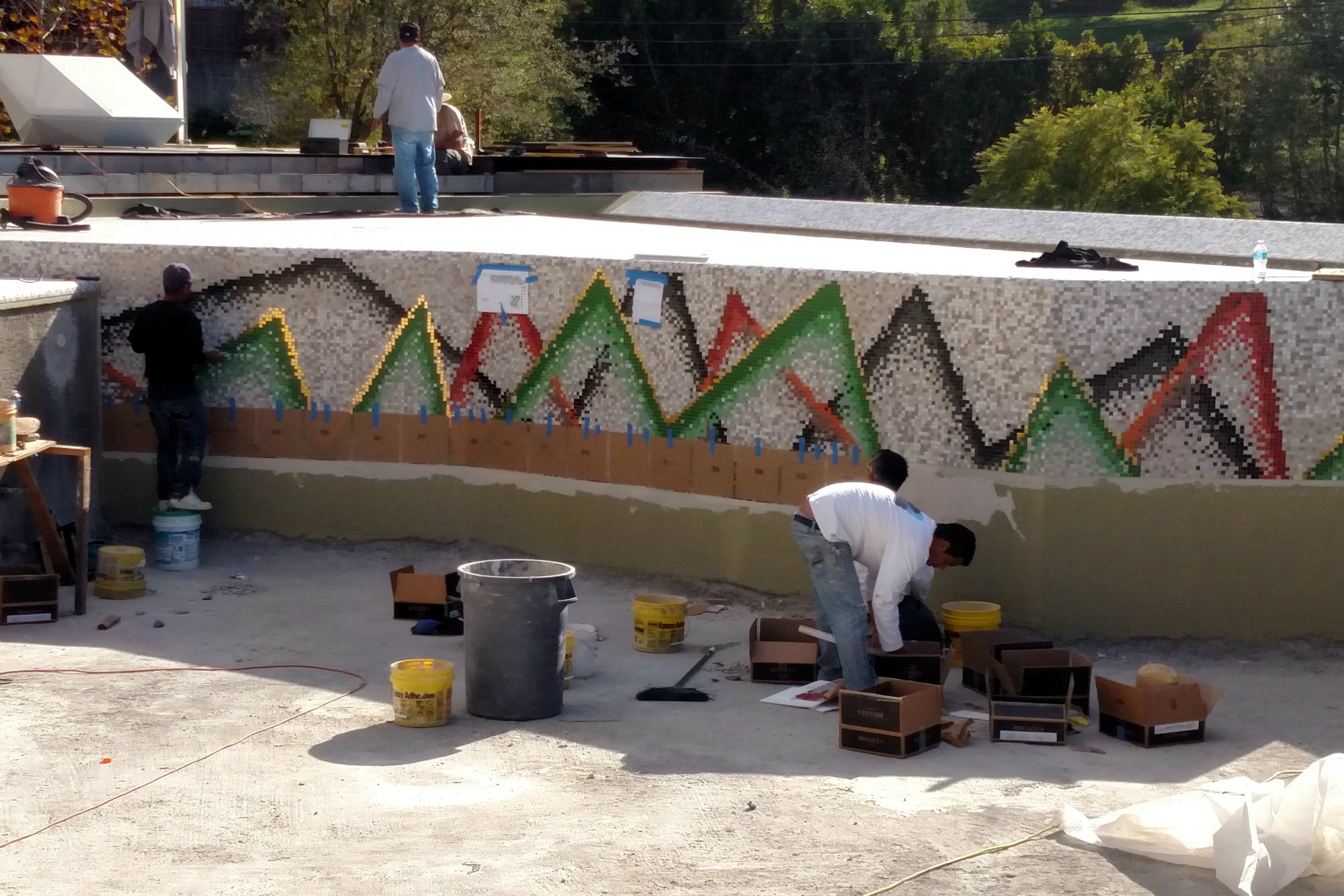 For a touch of whimsy, the homeowner designed a glass mosaic tile mural with colorful zig-zag patterns, which was installed at the pool’s deep end.