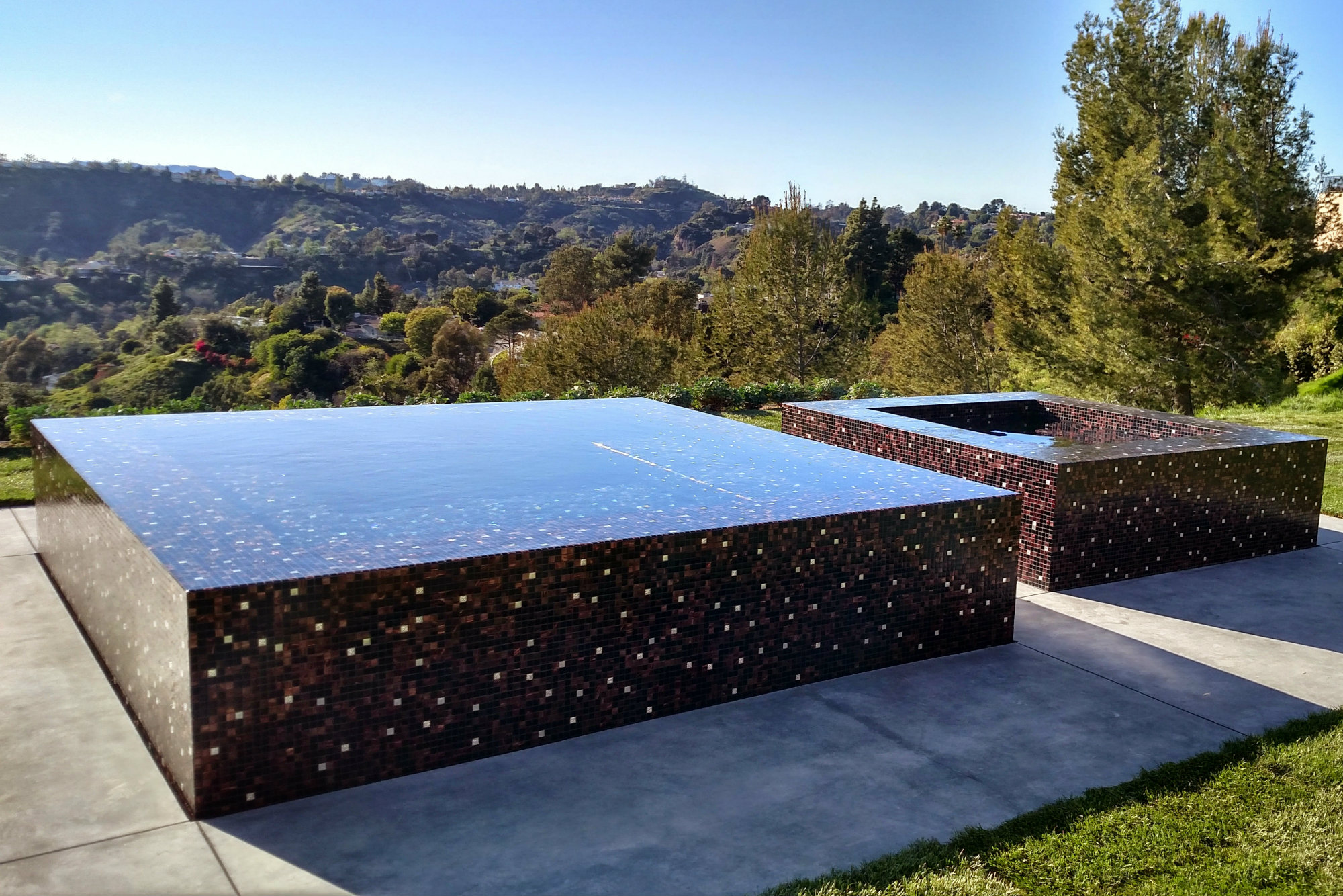 First, it includes more than 240 linear feet of perimeter overflow edge. Not only did this necessitate a ¹/16-inch tolerance, but much of the perimeter had to line up precisely with the deck. The concrete pavers cut with an detailed radial pattern and designed by Lara Fishman, principle of Los Angeles-based Storm Interiors, required an exacting hand. Under normal circumstances, it would be enough that the pavers bore the pattern. This alone required that each piece be numbered and set according to a template to ensure that every component sat in its place and the lines connected perfectly from paver to paver.