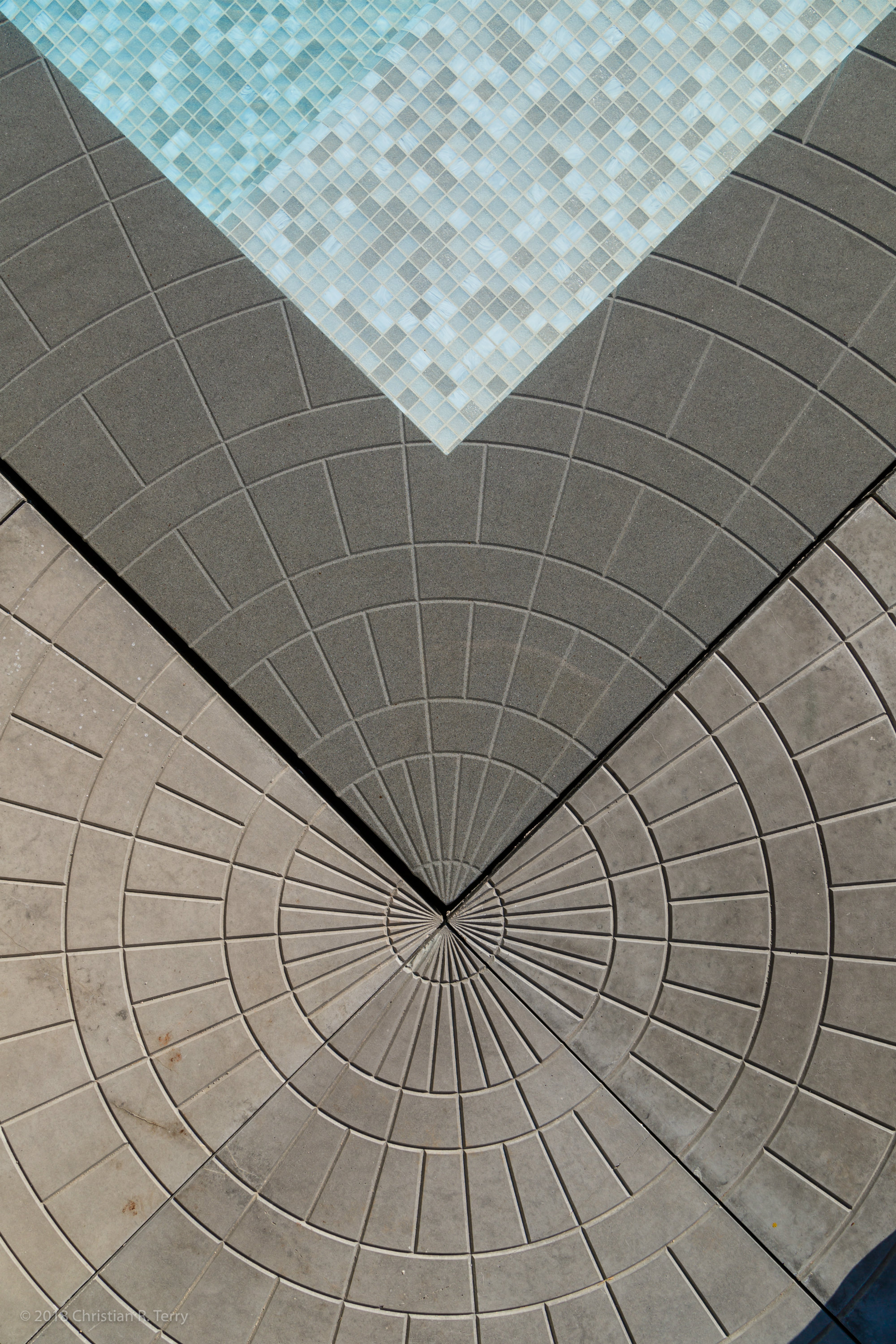 In this case, however, the submerged perimeter-overflow coping also contained the pattern, so it also had to meet up perfectly with the deck — despite the fact that a different company fabricated each material. To make this possible, the pattern was rendered in Auto CAD, and the fabricators kept exactly to the drawings.