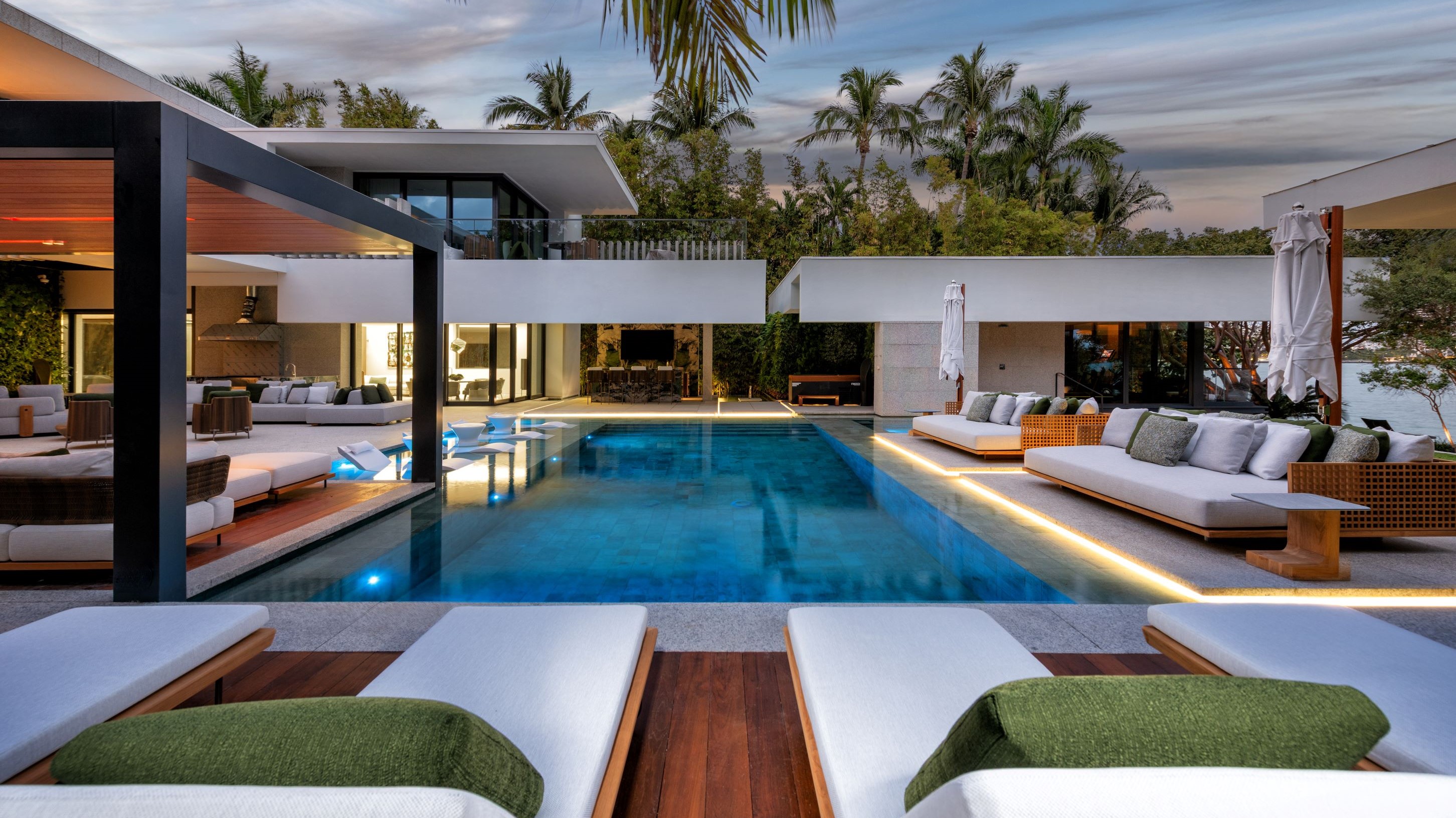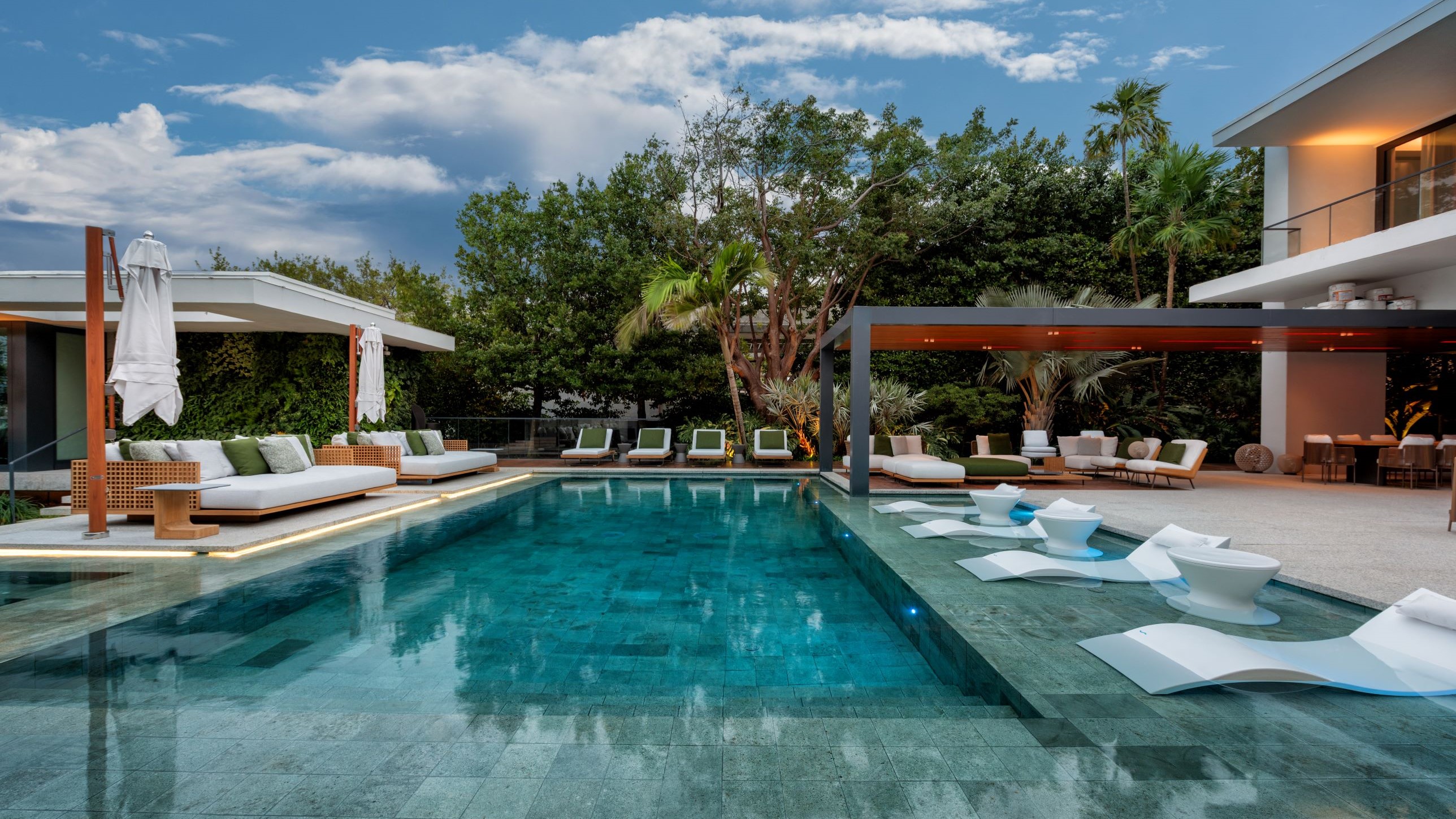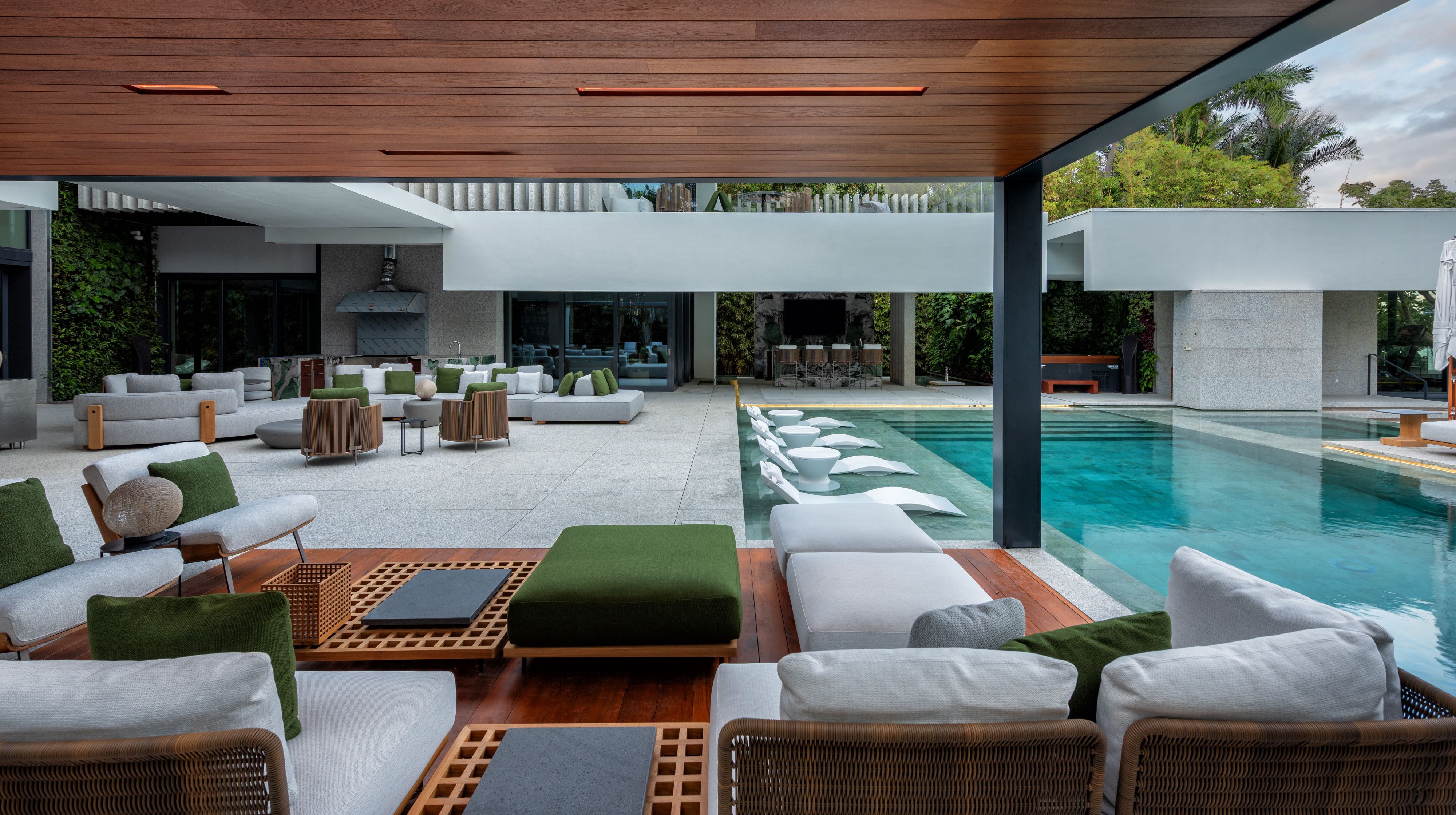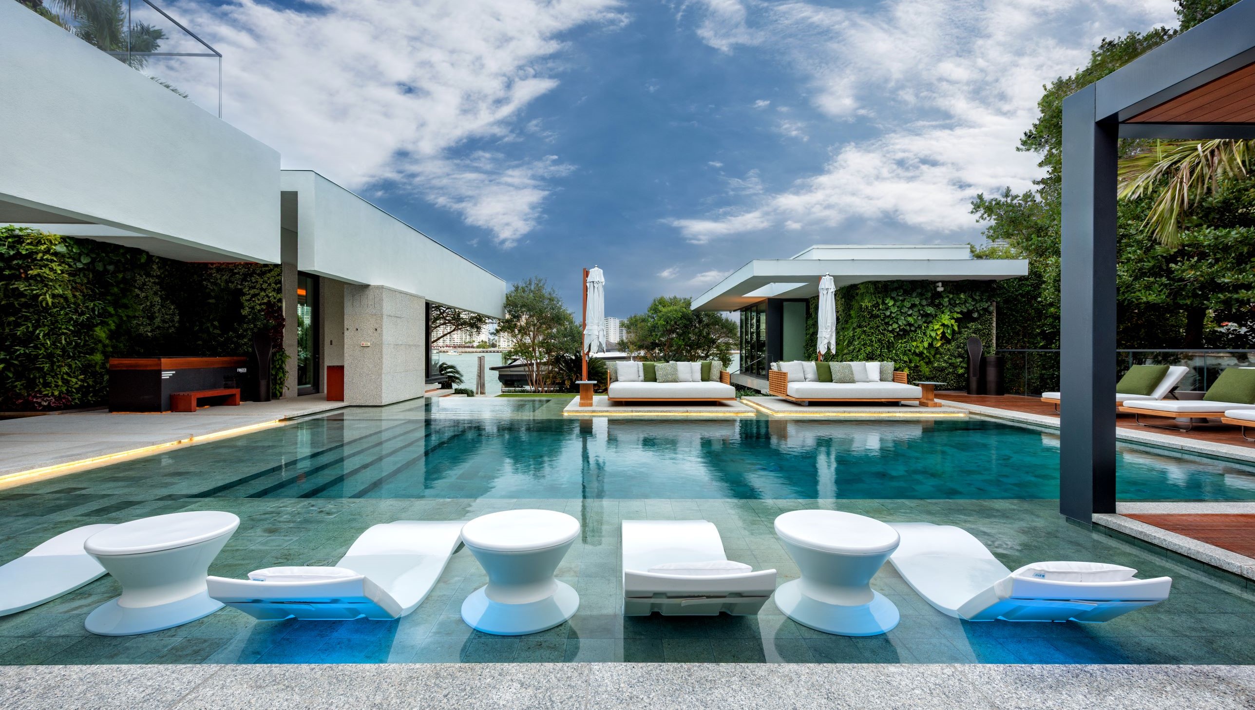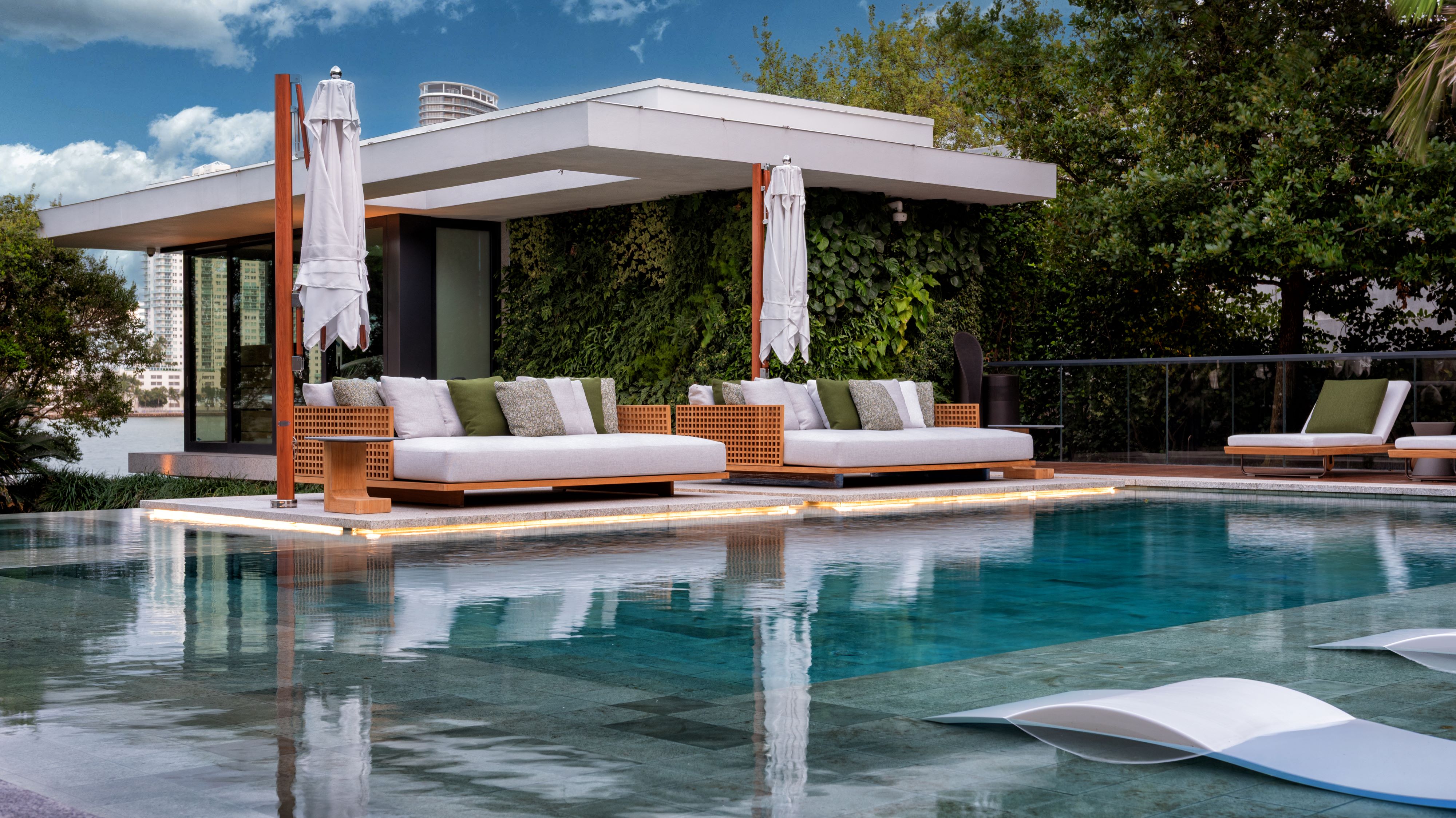 Anchoring the yard is a two-sided vanishing-edge pool, built by CPS Outdoors, also based in Miami. The designer aligned the long rectangle with the home’s major view corridors to properly frame the bay beyond.