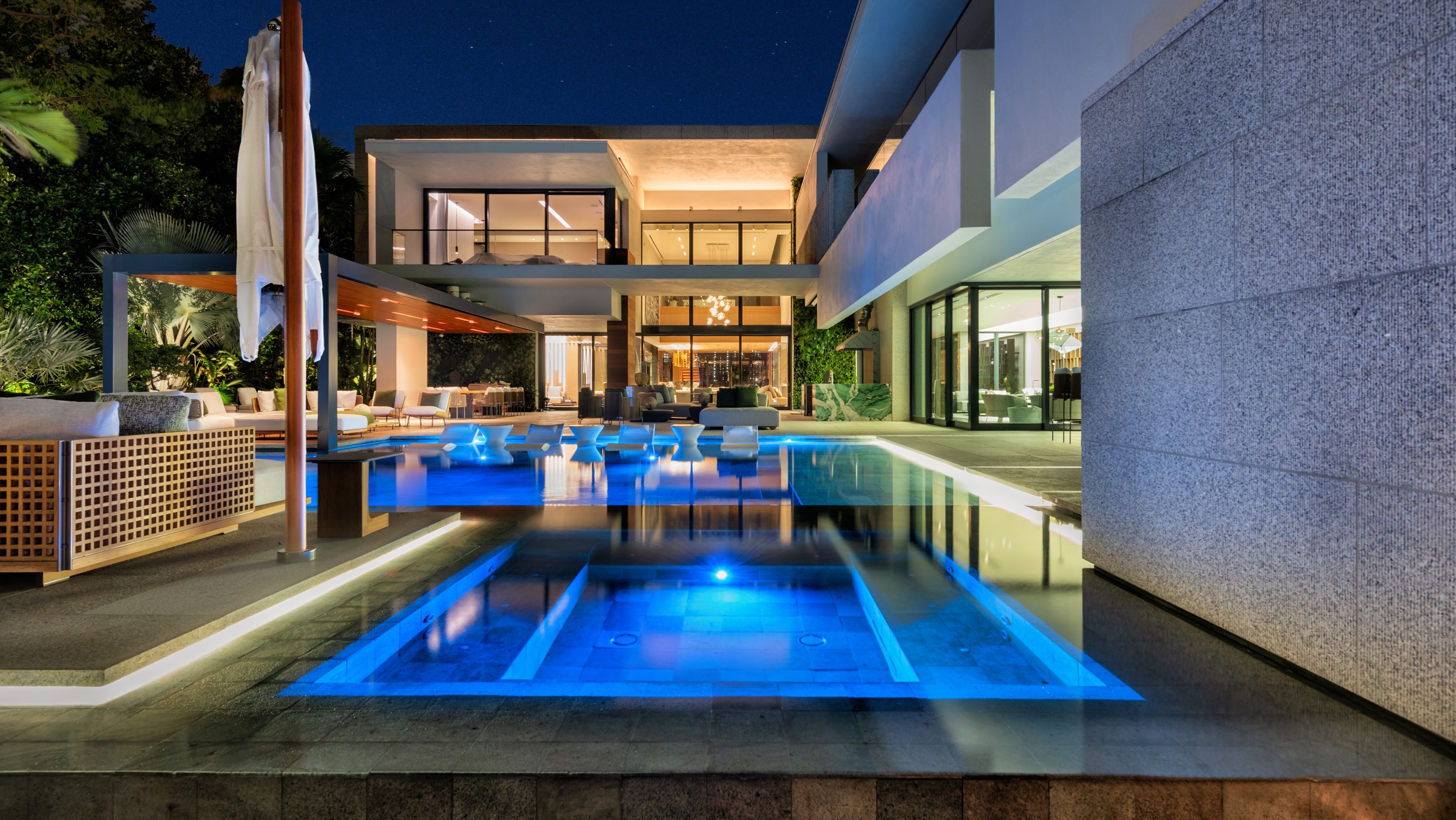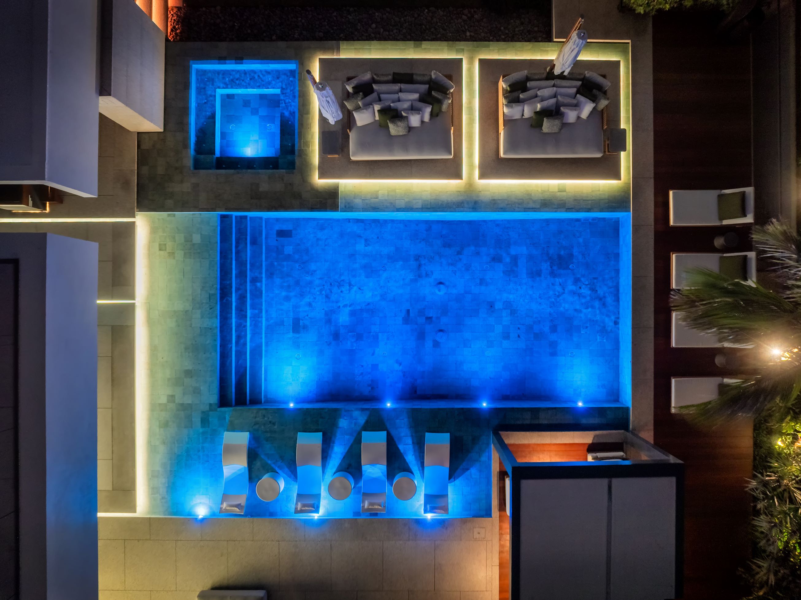 Two floating islands, each with its own daybed and umbrella, sit directly next to each other, precisely lit underneath to enhance the illusion. The basin underneath the islands extends around an adjacent structure and wraps around the outdoor kitchen for a similar effect.
