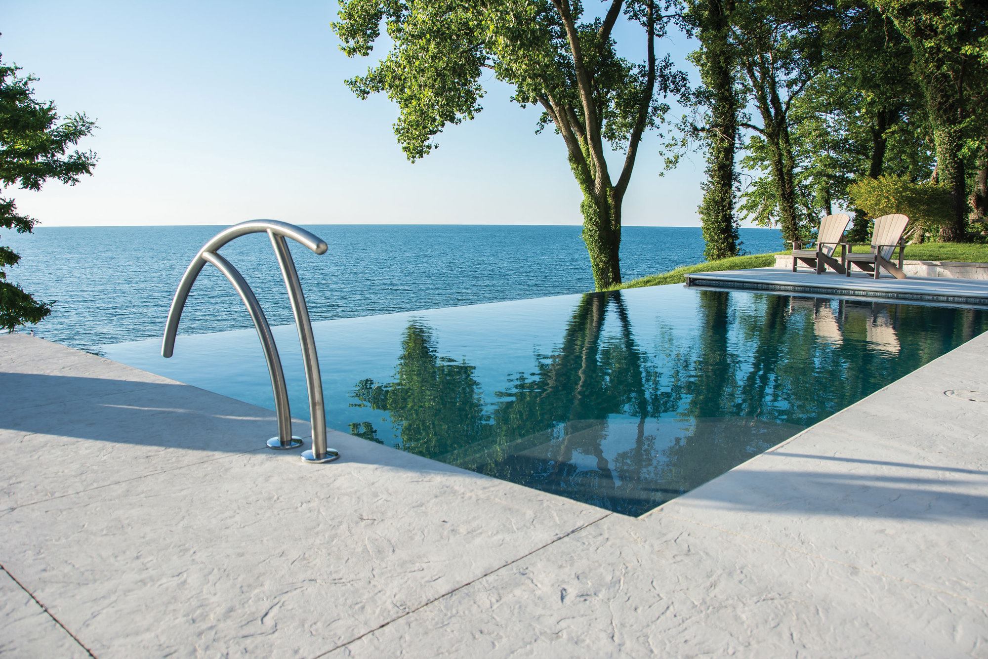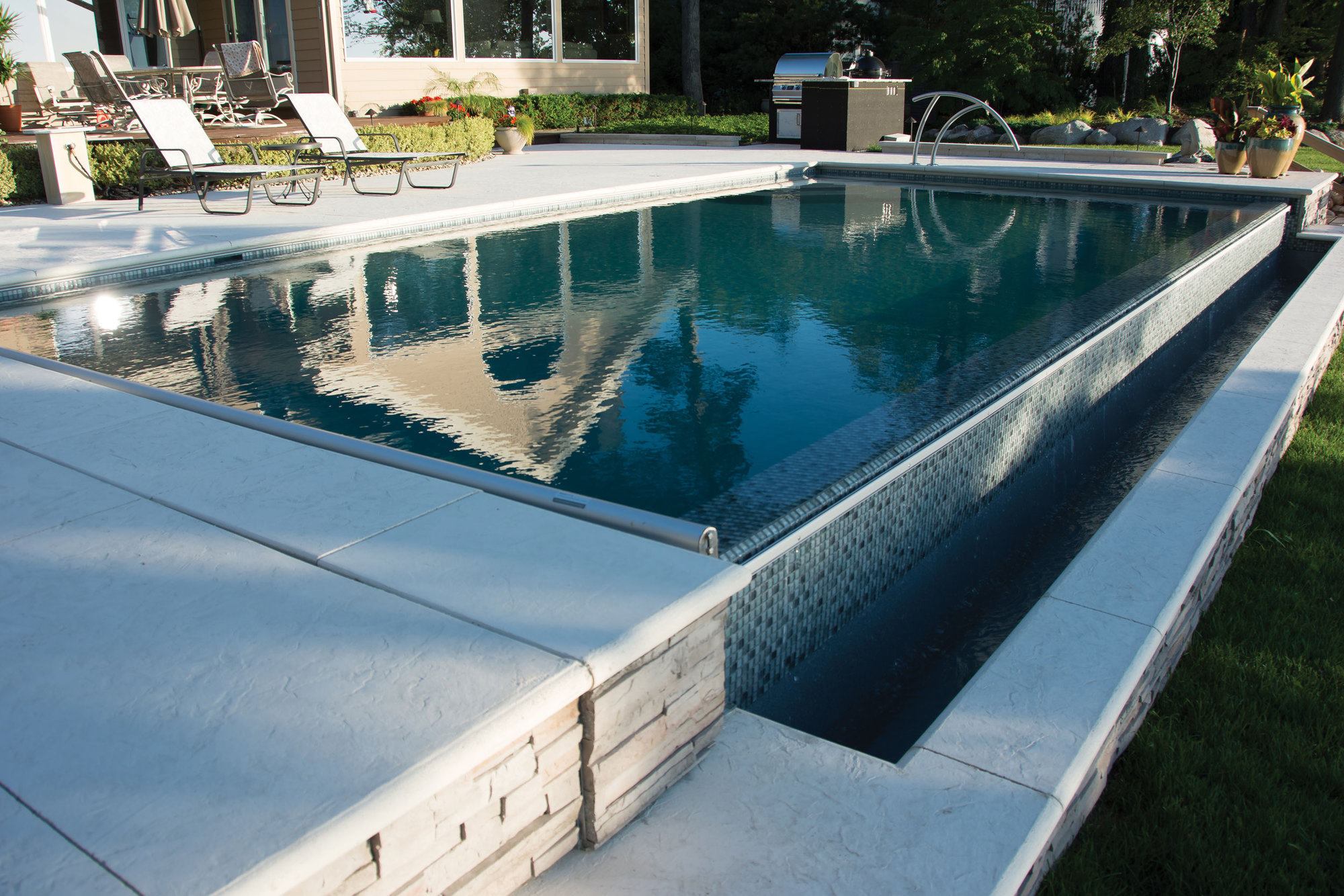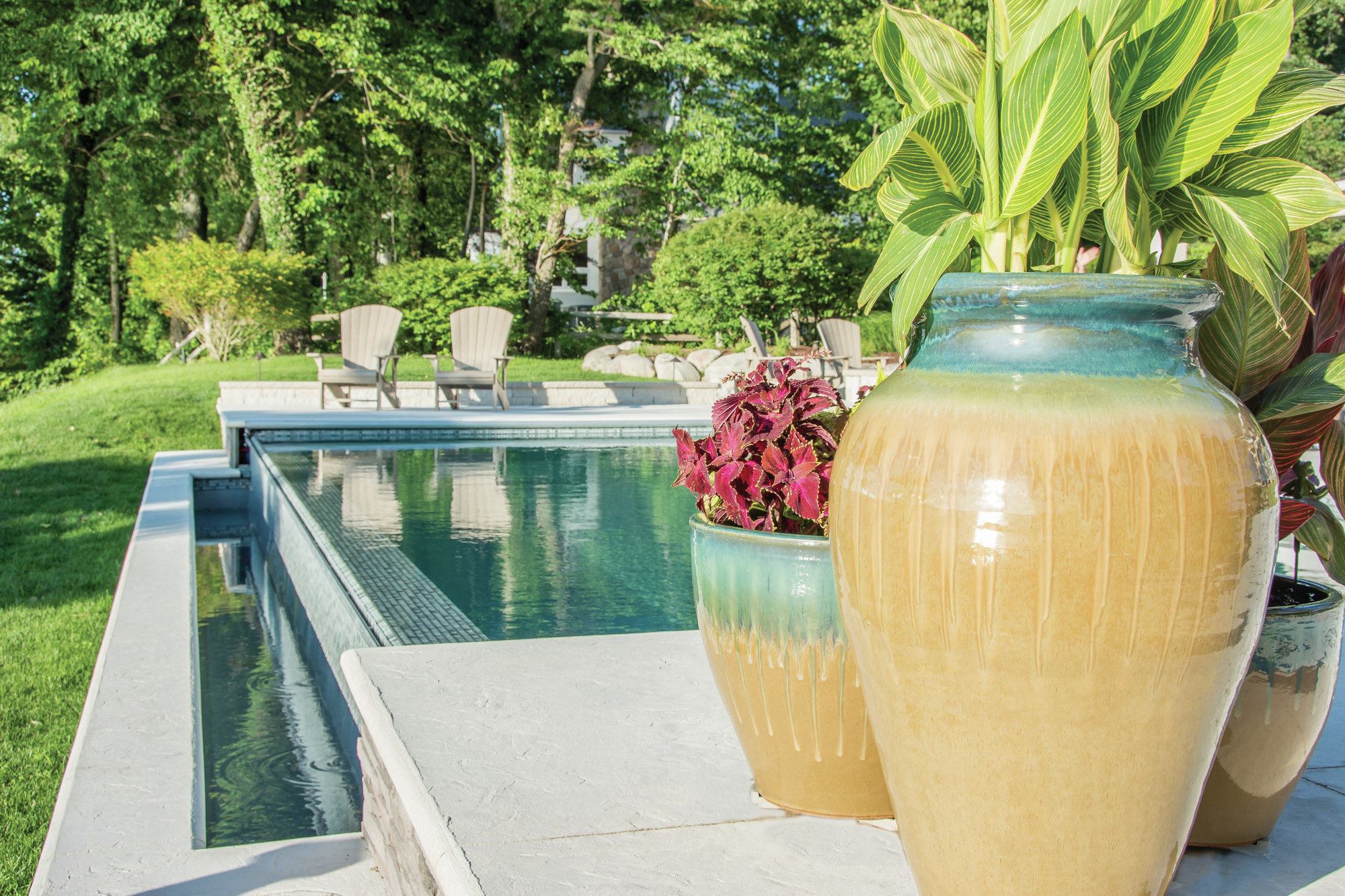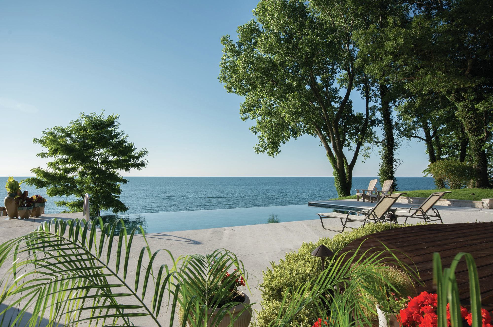 Changing tides: These homeowners requested a sleek design to enhance their view of Lake Michigan — without being a distraction. Because the lake’s hue changes with the weather, Bill Kantor needed a color palette that would create a seamless view, from the pool to the lake beyond, at any time. The San Juan fiberglass pool shell has a gel-coat finish in Iridium Granite, and the Vitrex Mosaici by Casa Italia tiles are in Grigio, a mix of grays, to complement the environment. To marry the design to the homeowner’s property, Kantor suggested that the weir wall below the vanishing edge be faced with the same stone as the home’s chimney.