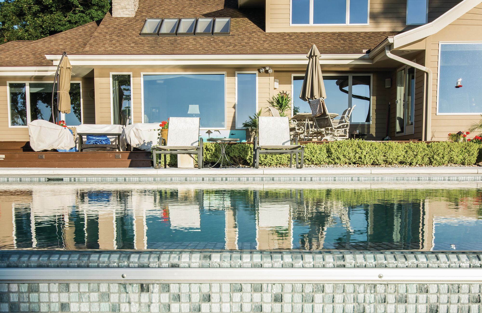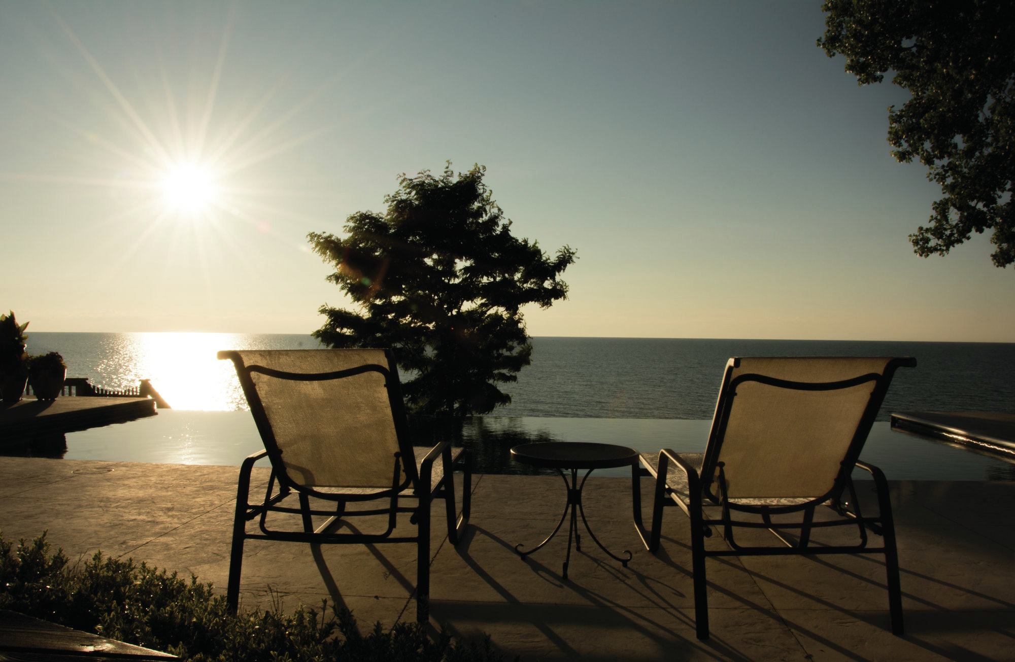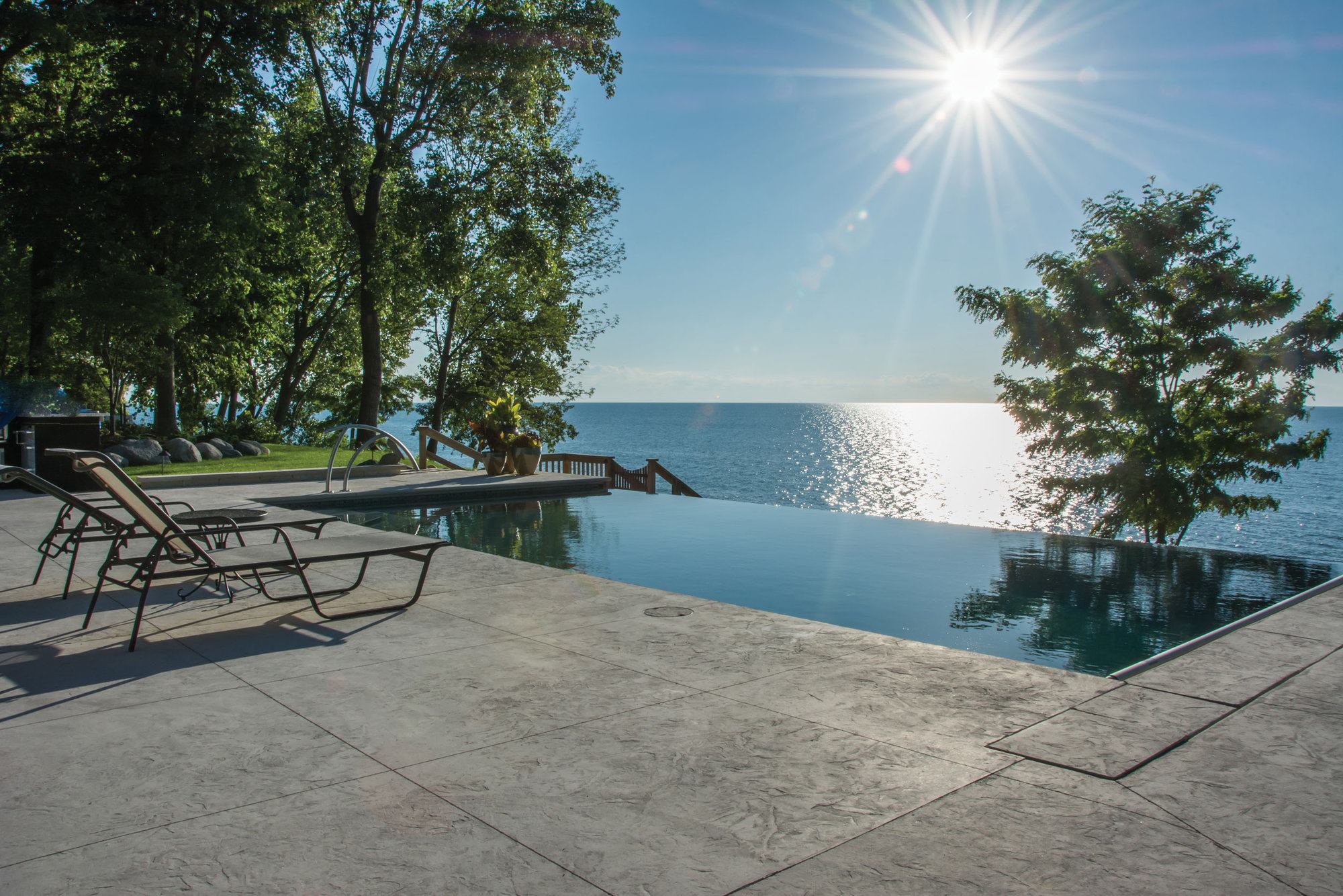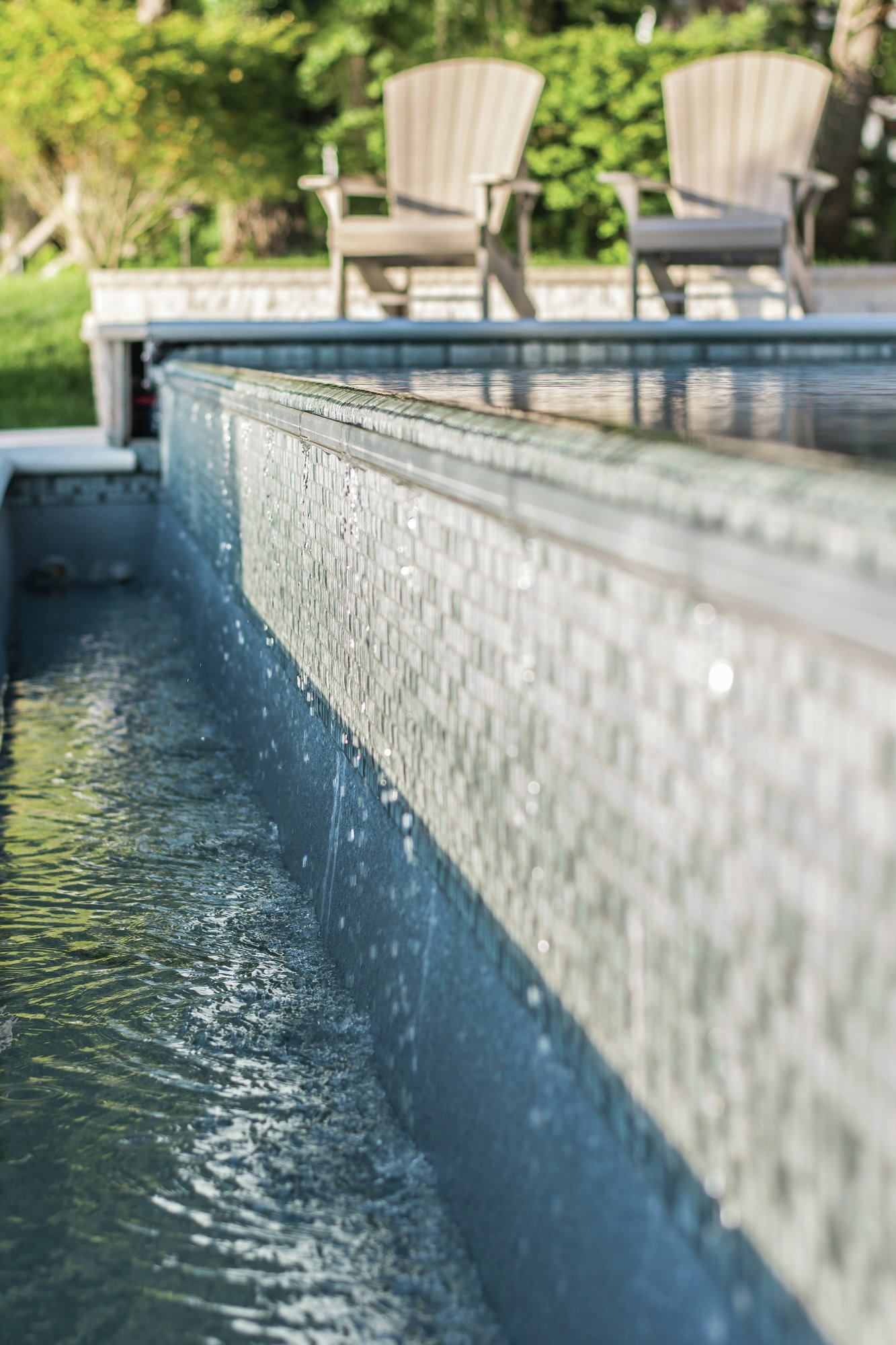 Changing tides: These homeowners requested a sleek design to enhance their view of Lake Michigan — without being a distraction. Because the lake’s hue changes with the weather, Bill Kantor needed a color palette that would create a seamless view, from the pool to the lake beyond, at any time. The San Juan fiberglass pool shell has a gel-coat finish in Iridium Granite, and the Vitrex Mosaici by Casa Italia tiles are in Grigio, a mix of grays, to complement the environment. To marry the design to the homeowner’s property, Kantor suggested that the weir wall below the vanishing edge be faced with the same stone as the home’s chimney.