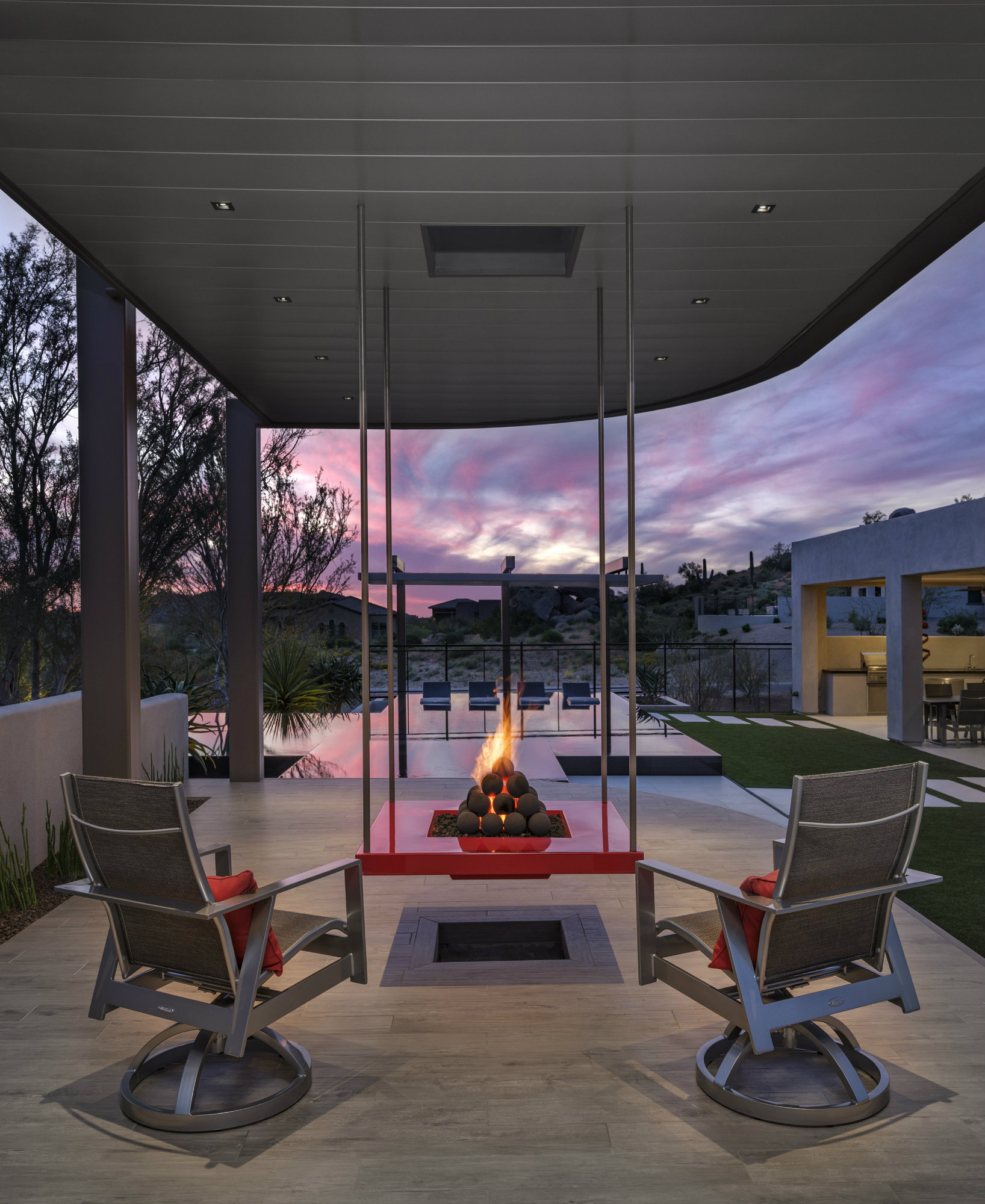The morning patio includes one of the yard’s focal points — a red suspended fire bowl with black clay fireballs. “Everything else was levitating,” says designer Rick Chafey. “The deck is cantilevered over, and once the plants are filled in, [the morning patio] will appear to be kind of floating on top of the vegetation. The ceiling hangs in the structure above … So why would we build a fixed component here that anchors it?”