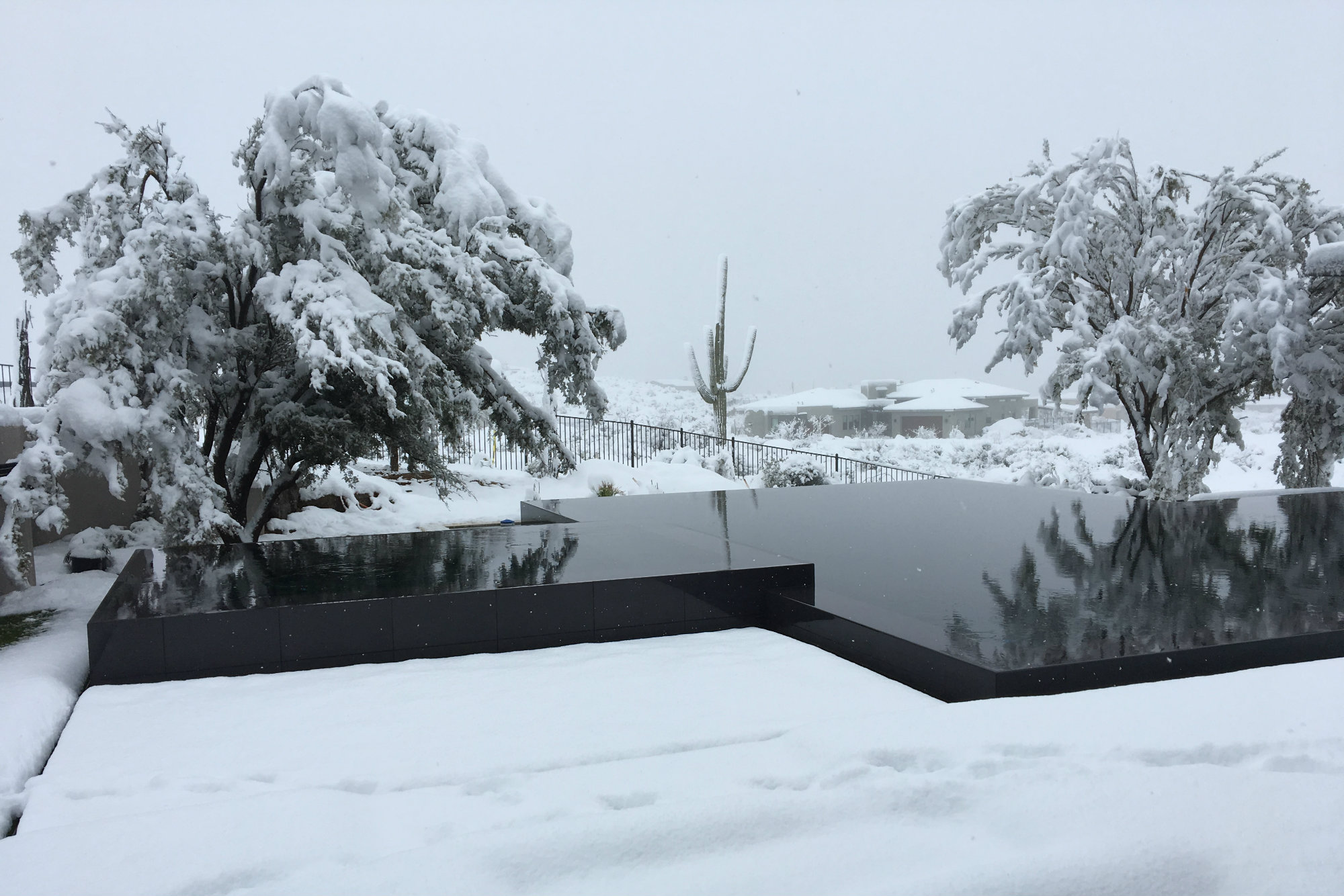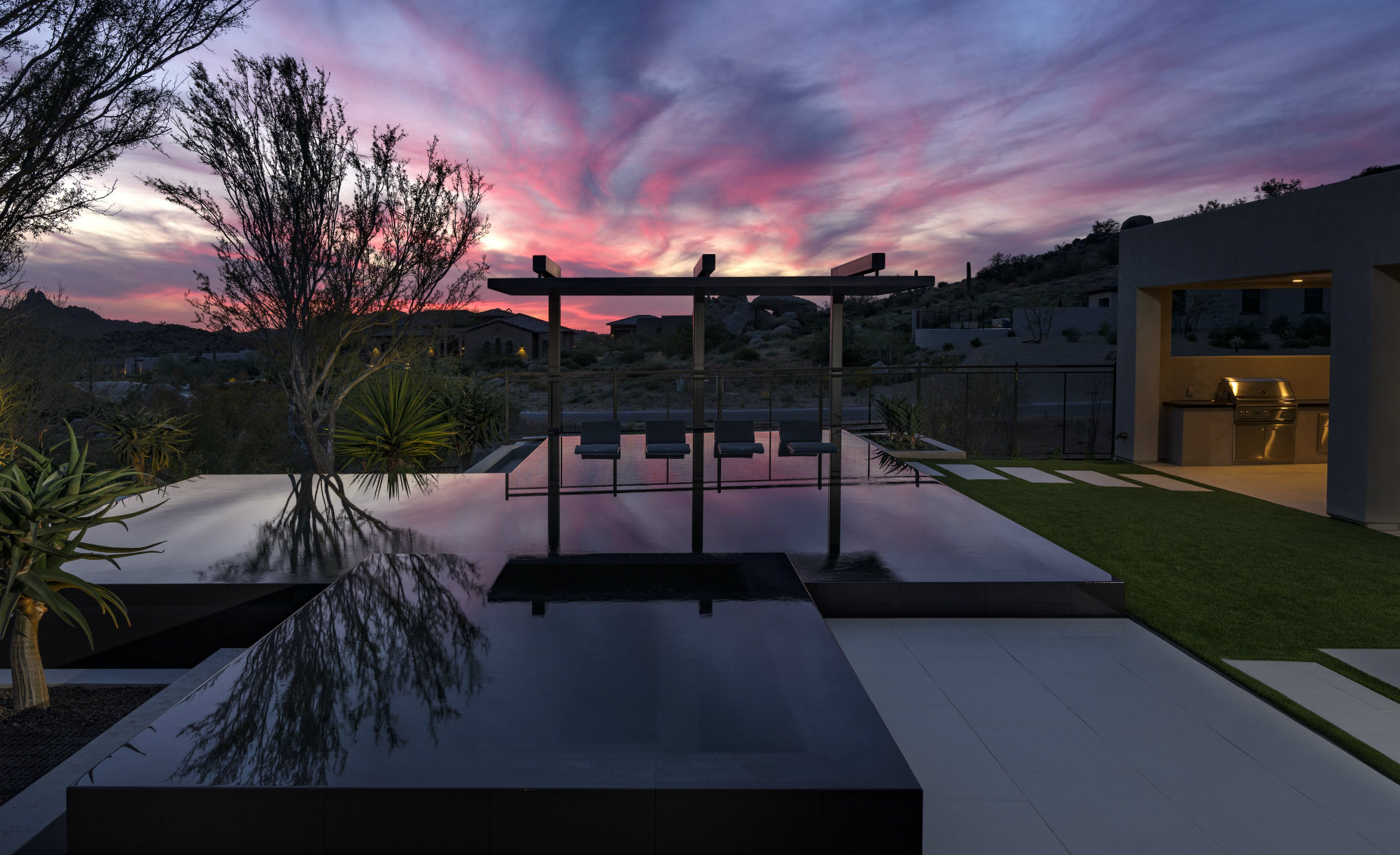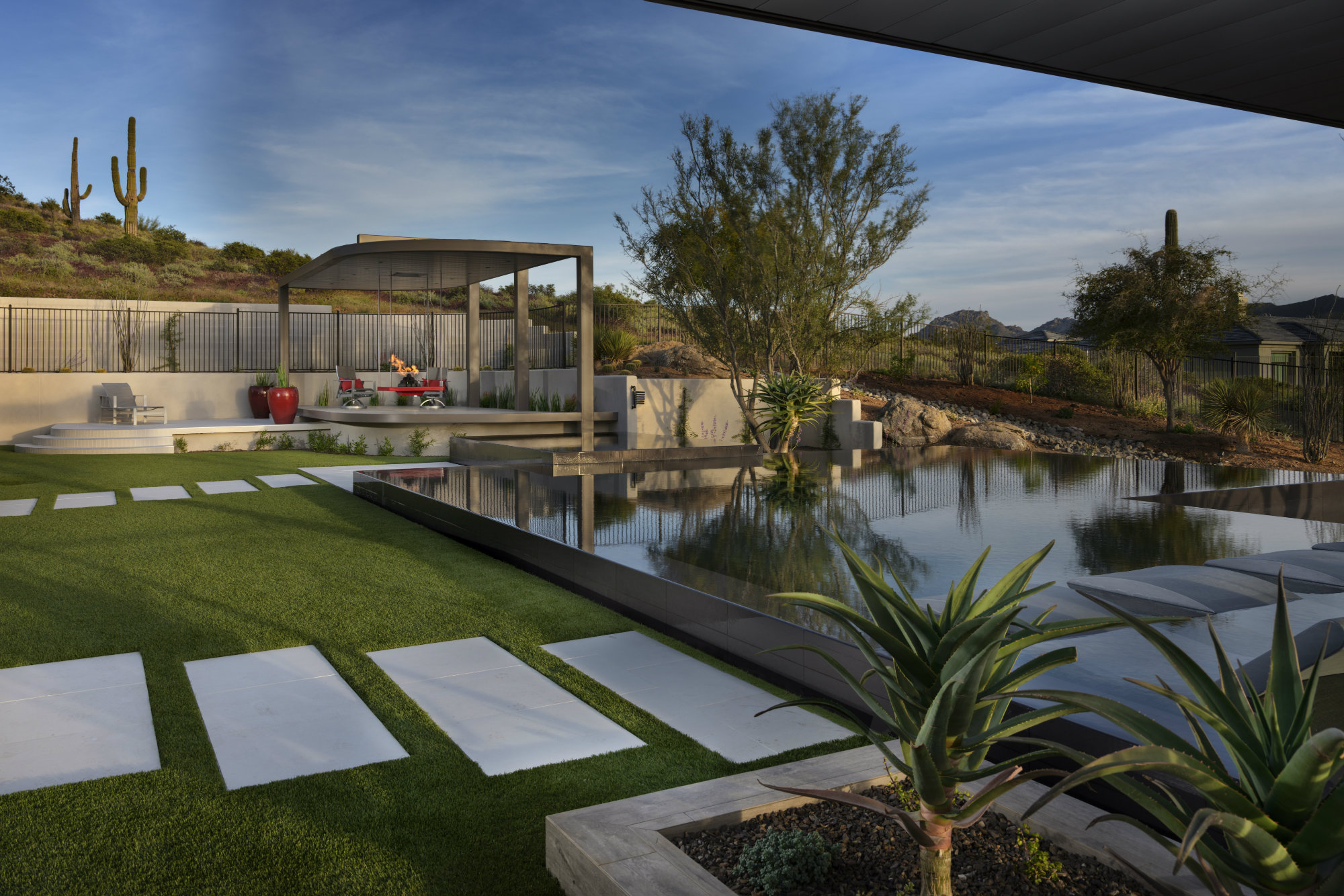 Two ironwood trees and a handful of Hercules agaves throw their sculptural reflections onto the surface, particularly at night when they’re lit.