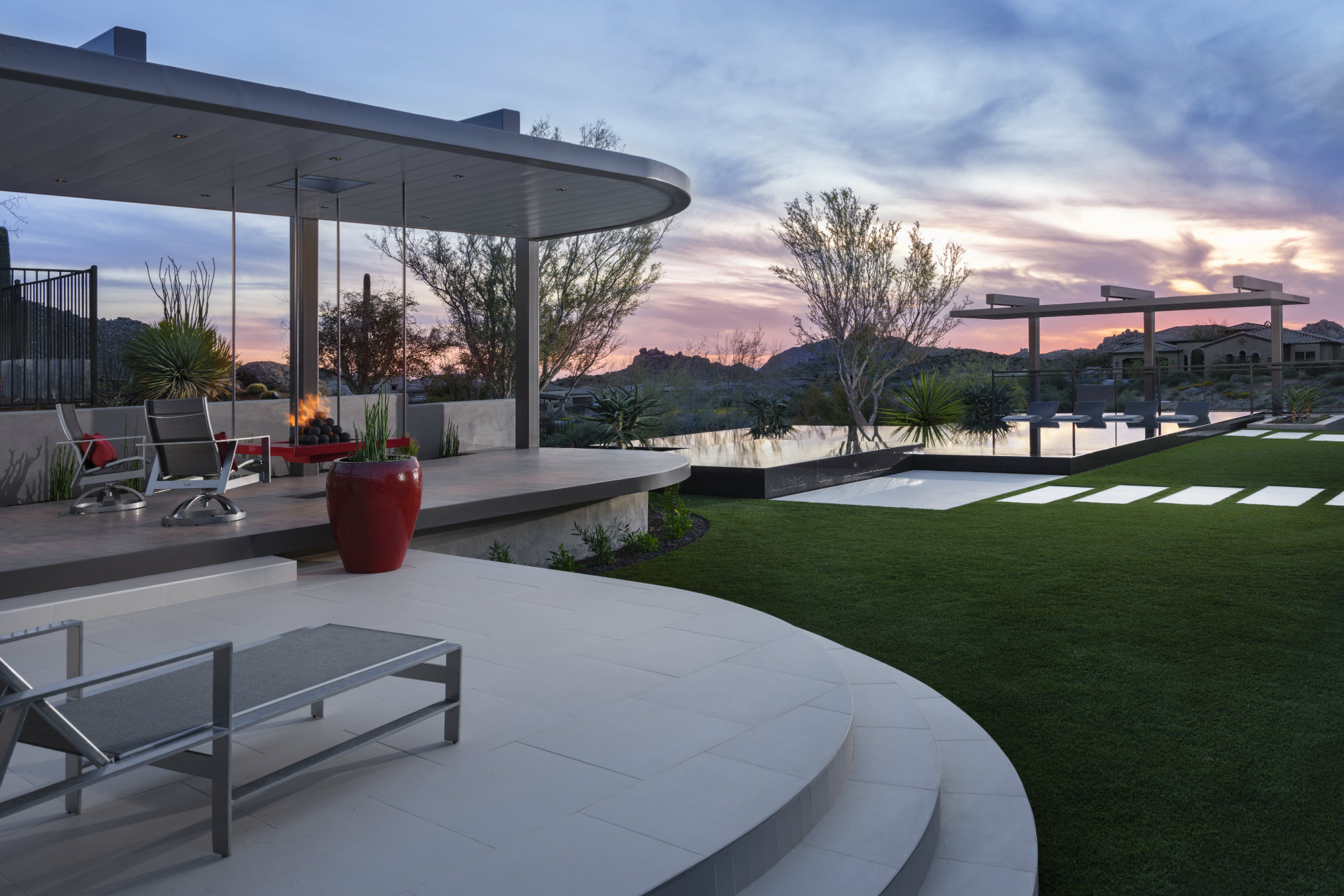 To combat the severe Arizona sun, the designers sought to provide shade. However, they didn’t want to obstruct the views with bulky structures. They created cantilevered shade structures, so the bulk of the support comes from the back and from significant footings that root them in the ground. One such structure shades an elevated morning patio, so-called because the homeowners use while the sun is behind them and the mountains throw shadows on it. The other shade element is set over one end of the pool itself, so swimmers can get some relief.