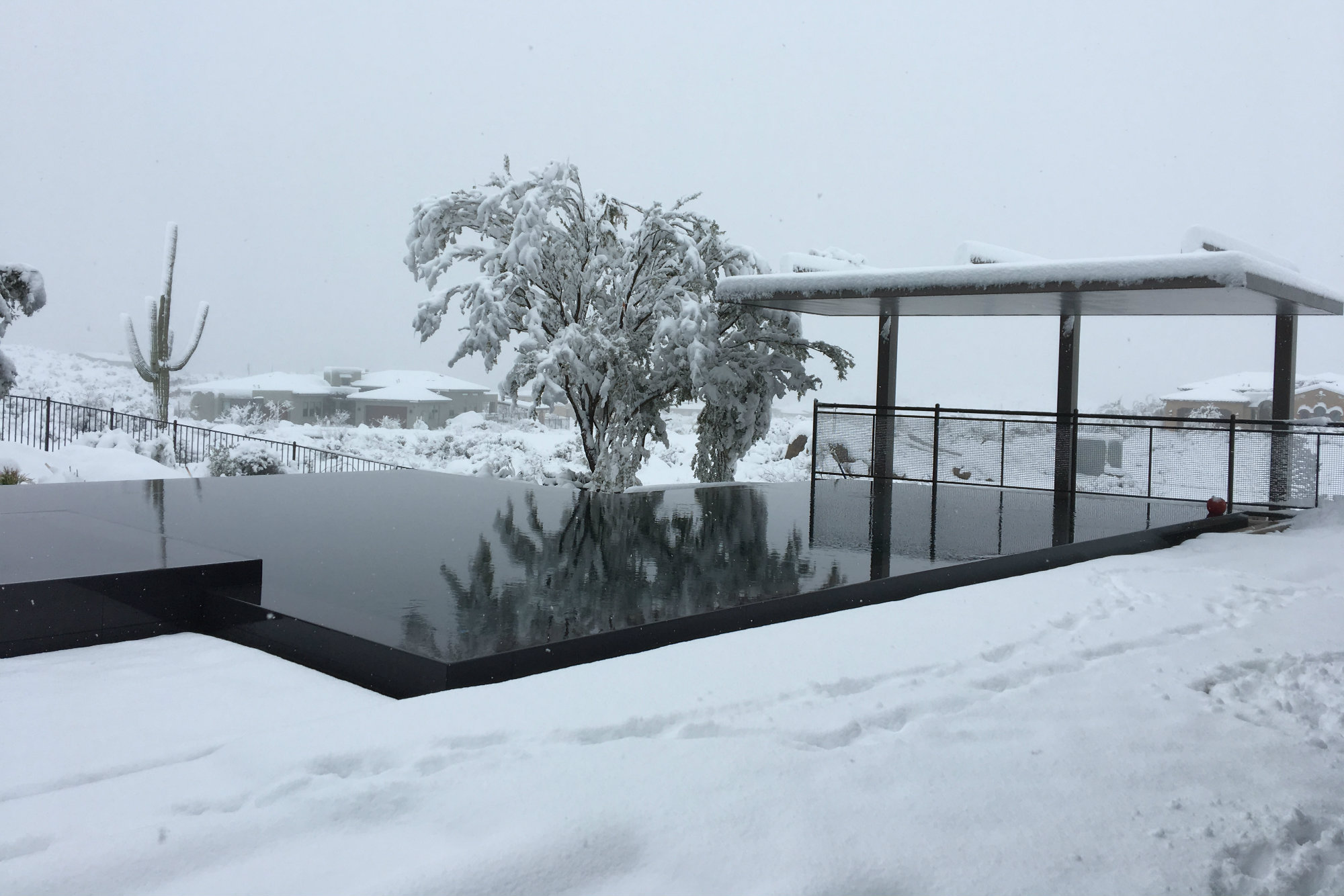 This backyard is made up of several horizontal planes — a low-profile perimeter-overflow pool with dark finishes to reflect the desert landscape, elevated patio with both a floor and a ceiling that cantilever, and a cantilevered shade structure over the pool itself.