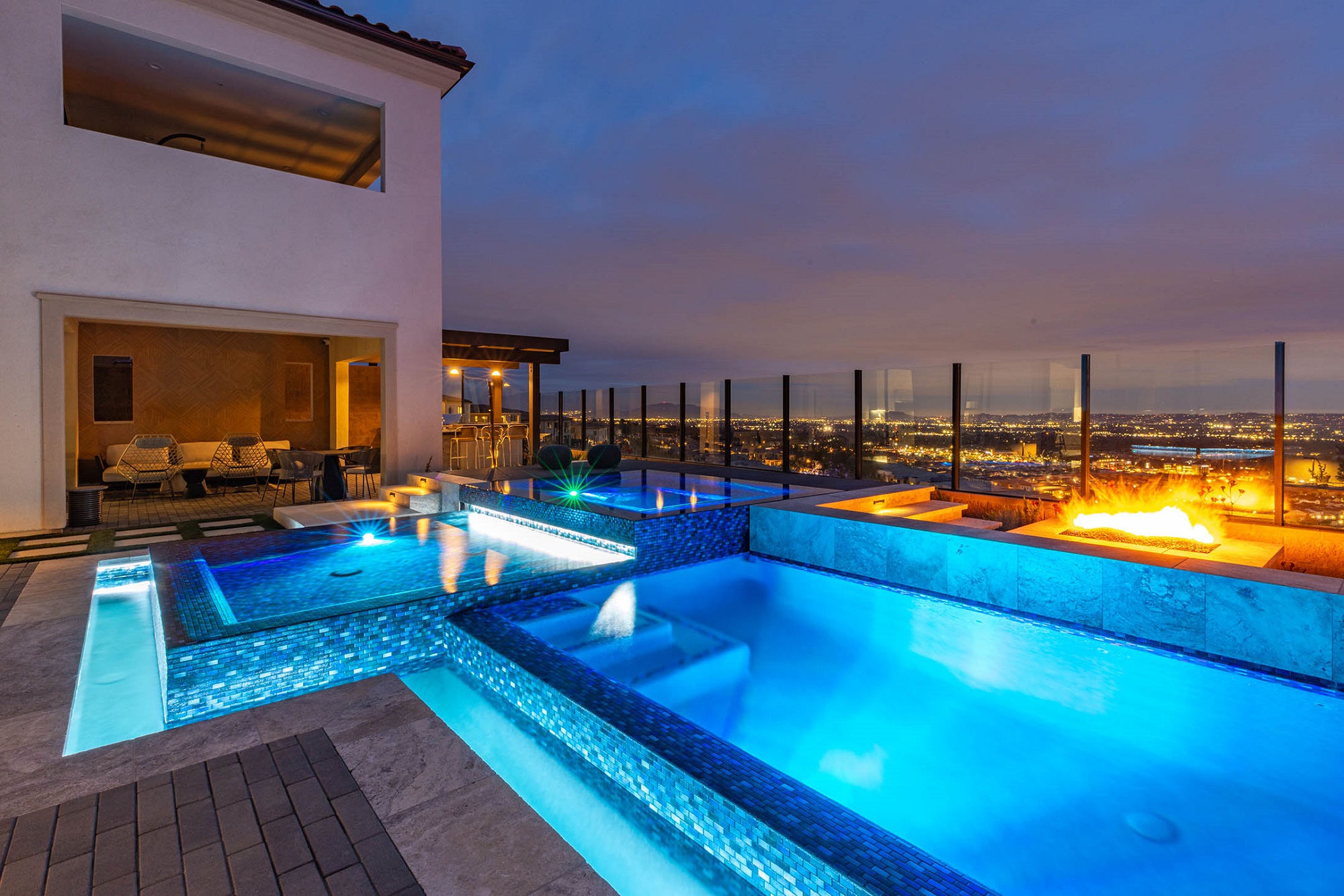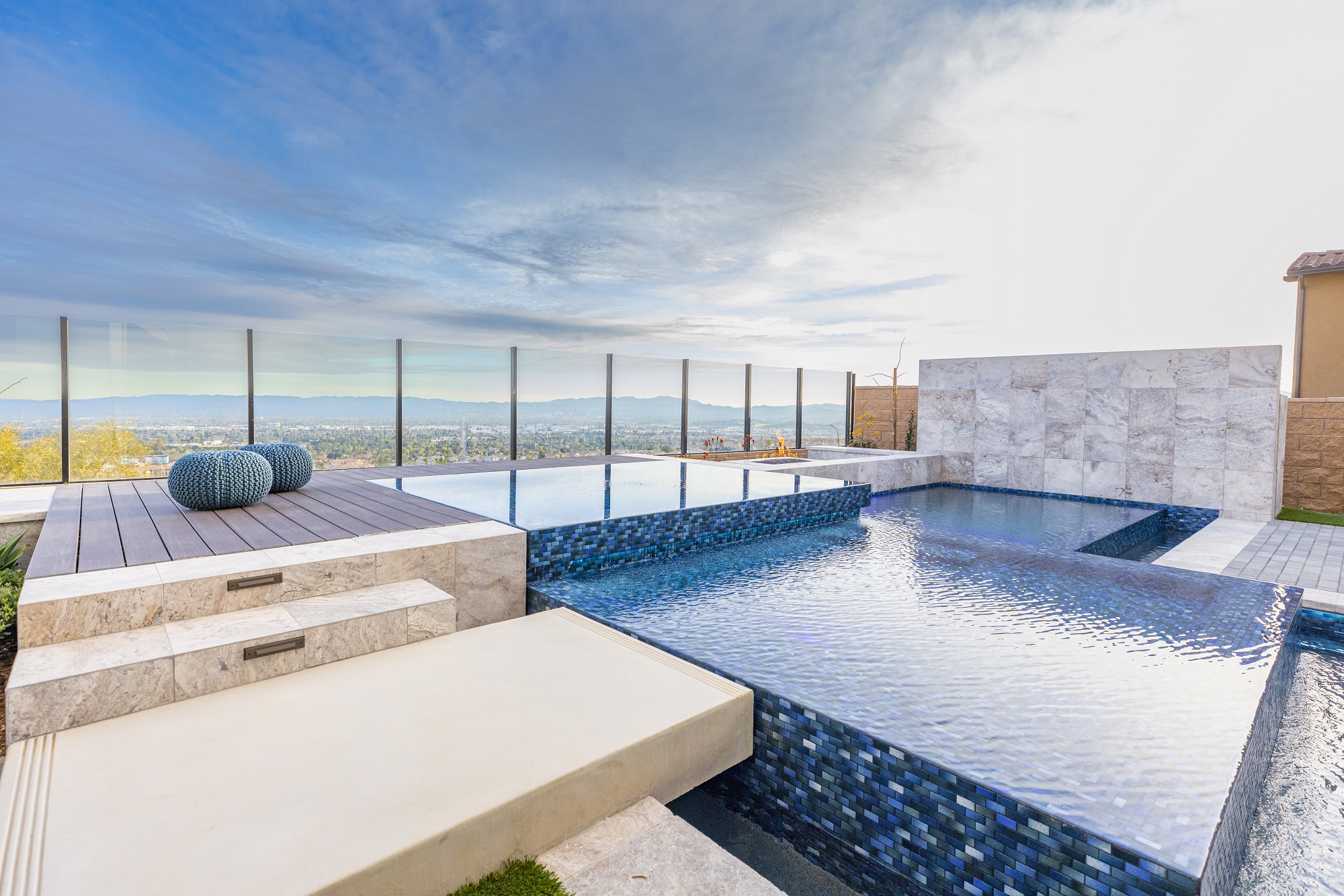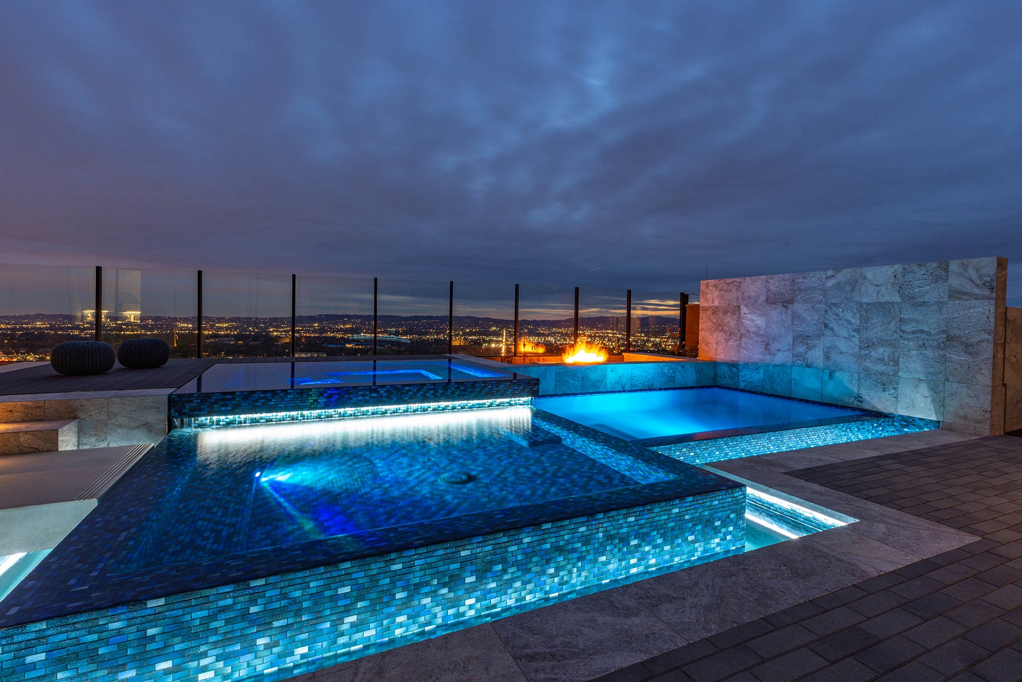 For this lot overlooking Los Angeles’ San Fernando Valley, the clients wanted to capture the view, both from outside and through the glass walls at the back of the home. This meant little to no interruptions in the sight line. Additionally, they wanted the waterscape to match the abode’s contemporary style and serve as a water feature at least as much as a pool and spa.