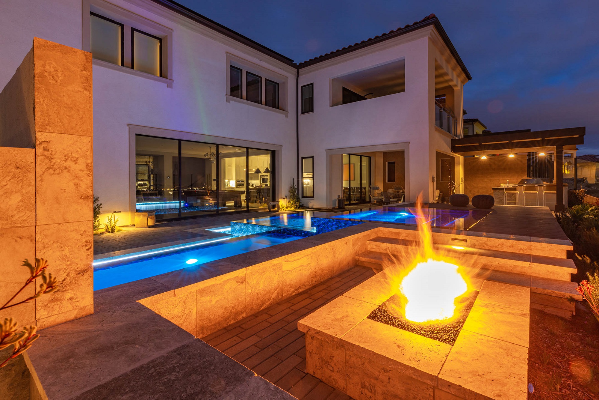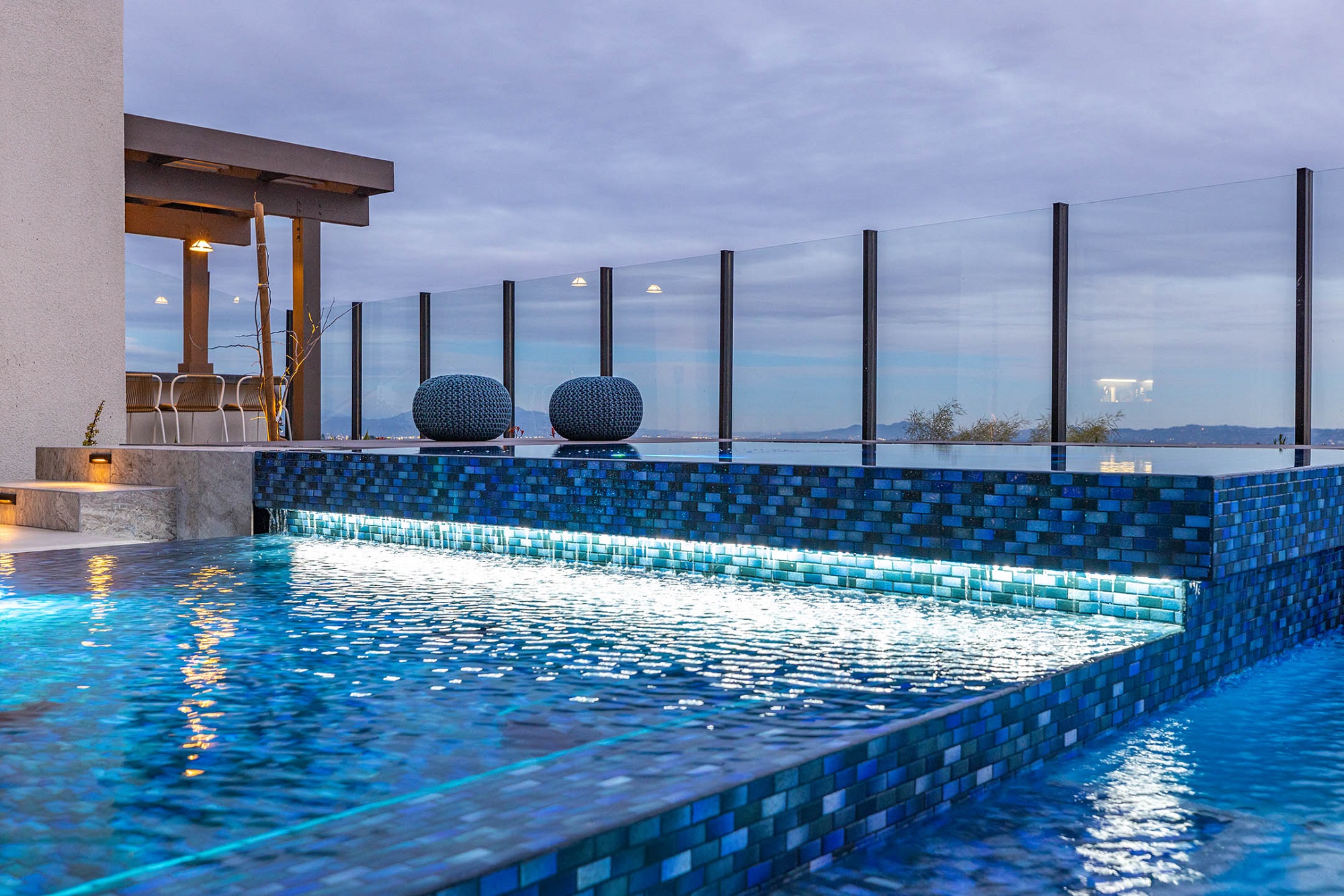 “I was going to need to be up three steps,” Cohen says. “And 18 inches is kind of a magic number because that’s your industry-standard seat height. So this allowed me to put the firepit on the backside, have the raised bond beam serve as a seat bench, be flush with the rim-flow spa, and have a spa that reflects the horizon and views of the valley.”