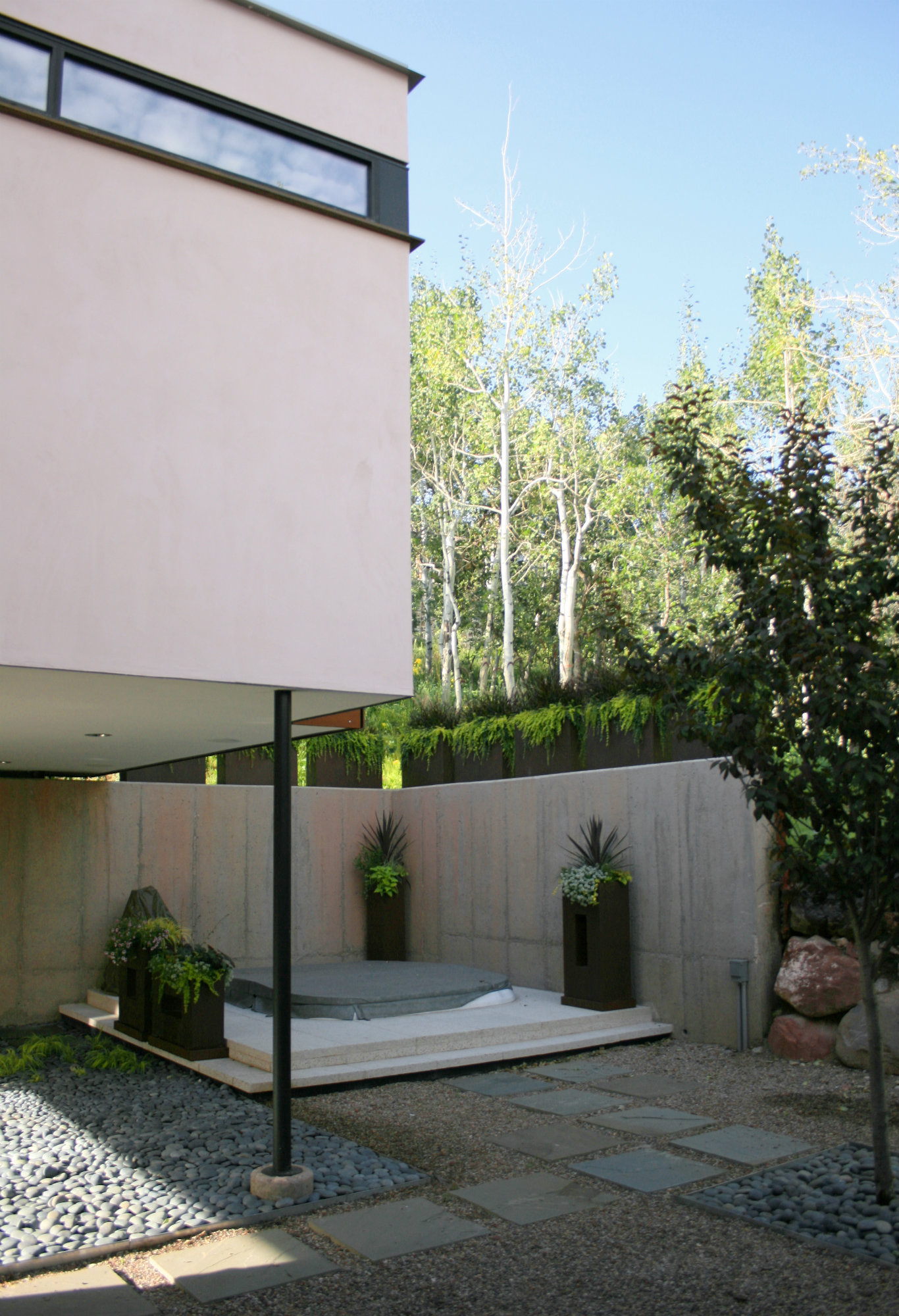 High-end and low-maintenance: These Aspen, Colo. homeowners wanted a place to unwind that was large enough for their family of six, had a custom look, and required minimal maintenance. Willis Pember, AIA, principal at Willis Pember Architects and lead architect on the project, answered their request with concrete walls for privacy, a terrazzo tile platform with floating steps, and planter boxes to add color and texture. “I like that we were able to use a drop-in tub and detail it in a way that made it appear much more high-end than the typical drop-in installation,” says Pember. Ben Allen, of I.A. Sedgwick and lead contractor on the project, designed a steel pit under the terrazzo tiles for service techs to gain access to the hot tub equipment. “There are two galvanized handles sunk into the center of each tile overtop of the pit,” he says. The whole space is designed for easy upkeep with an upscale appearance.
