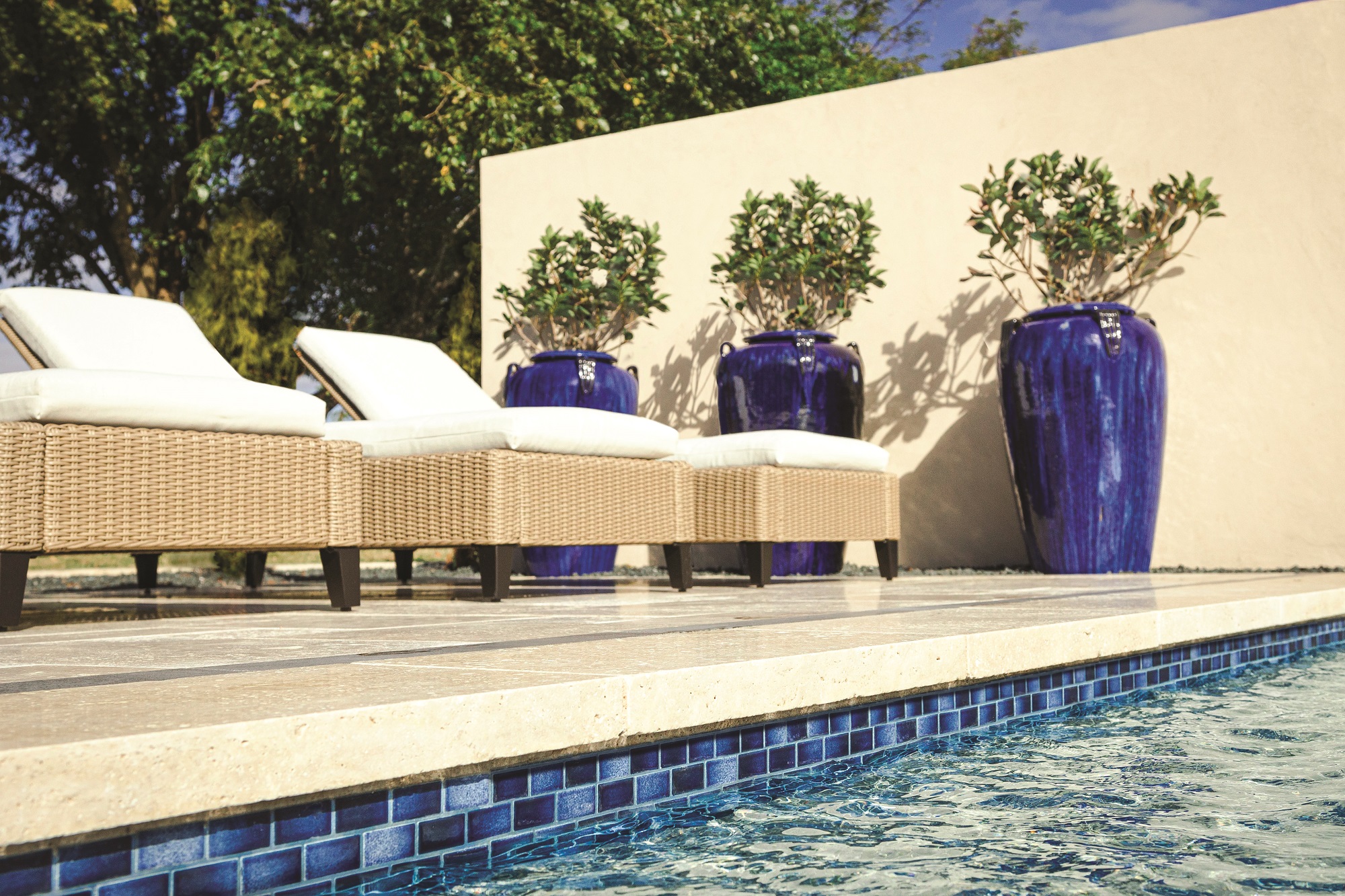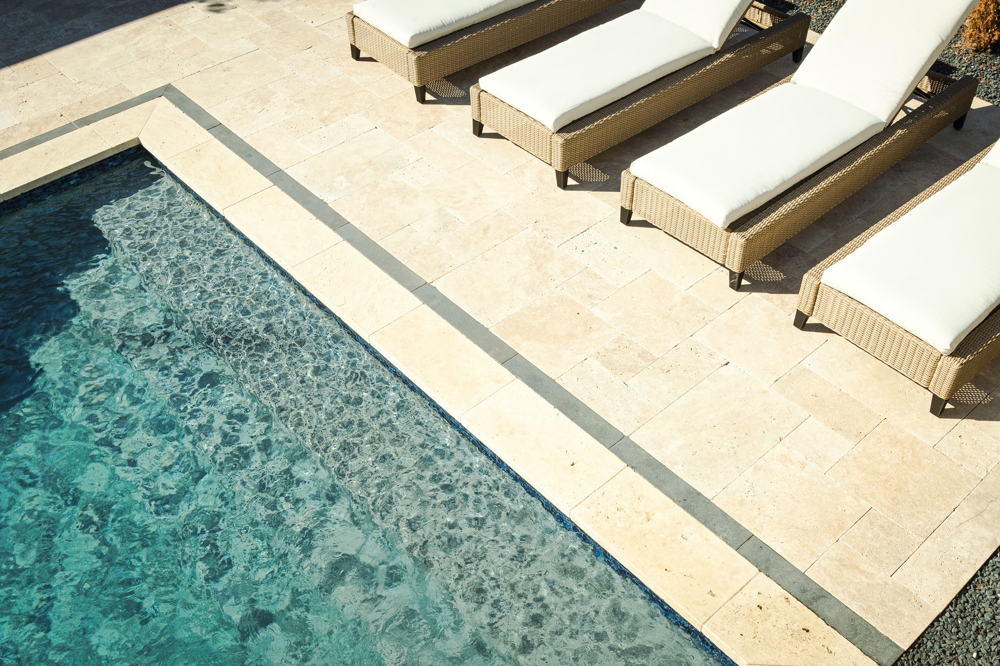 The deck and coping are made of a beige travertine. An accent strip of black volcanic basalt stone behind the coping adds contrast and provides a nice transition from the large-format coping to the more intricate Versailles patterned deck.