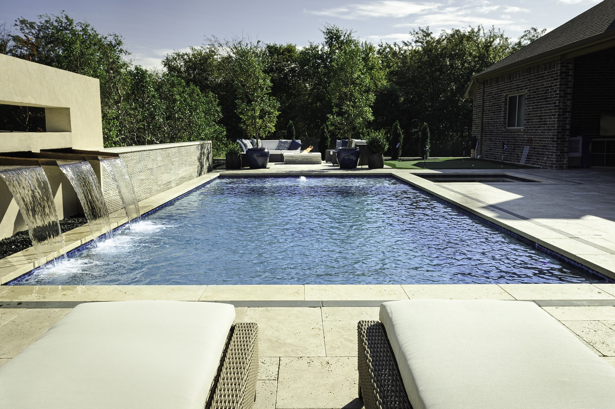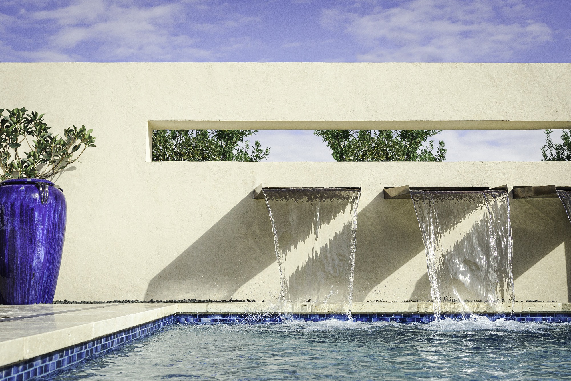 The spa stayed flush with the pool. With it close to the home, Hawk didn’t want to elevate it, lest it detract from the wall and waterfeature. “I also don’t like to elevate any spa vessels when they’re that close to the house because it tends to feel a little tighter,” he adds.