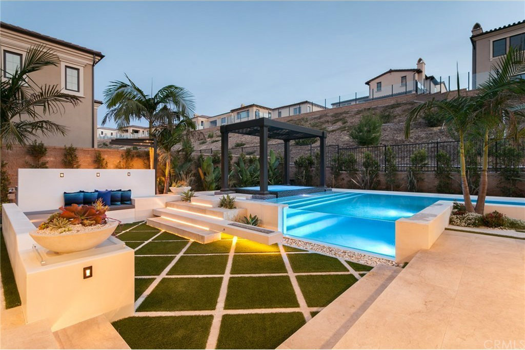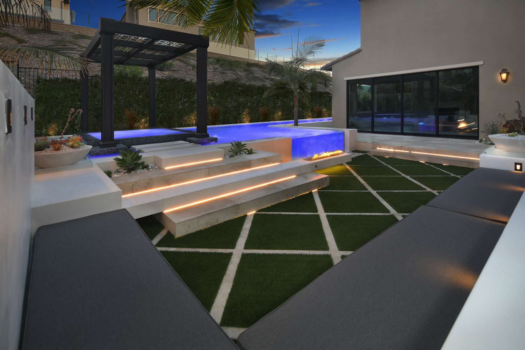 Immediately outside the great room door, Fox placed the true attention-getter — a reverse vanishing edge with clear acrylic panel. Color-changing lights in the pool intensify the glowing effect through the acrylic. The water spills into a gutter concealed by pebbles.