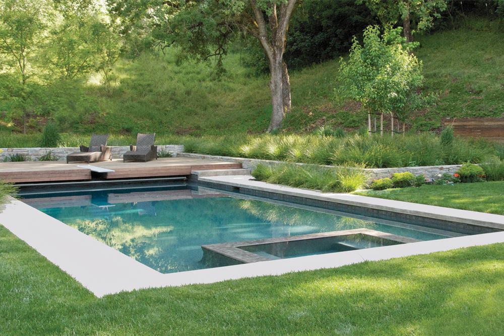 Thuilot chose medium blue-gray tile and pebble finish for the pool and spa. He felt a bright aqua would look unnatural, and believes that people aren’t comfortable when they can’t see the bottom.