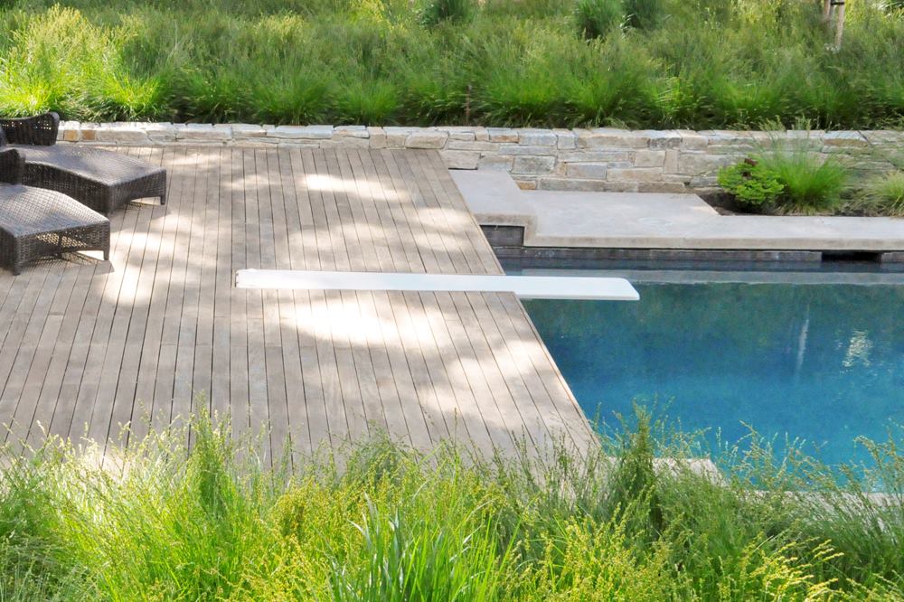 Elevated 14 inches above the pool coping, the deck is covered in Ipe wood, chosen for its durability and resistance to splintering. This deck provides the main congregation and activity area, with plenty of seating.