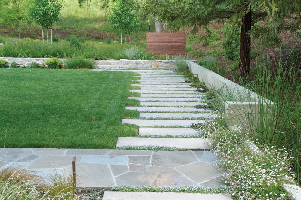 The raised planter walls on either side of the pool are covered in Old Spruce Mountain stone, a ledger also used to veneer the outdoor surface of the home’s fireplace. The pool equipment was concealed behind Ipe panels to the side of the pool.