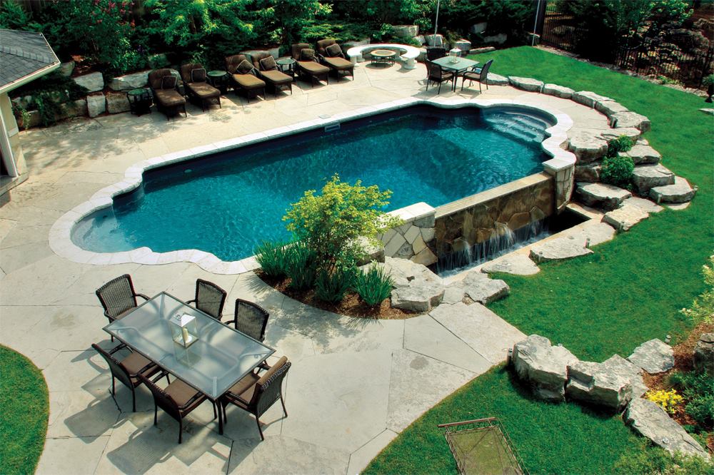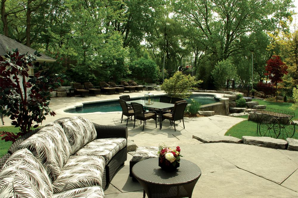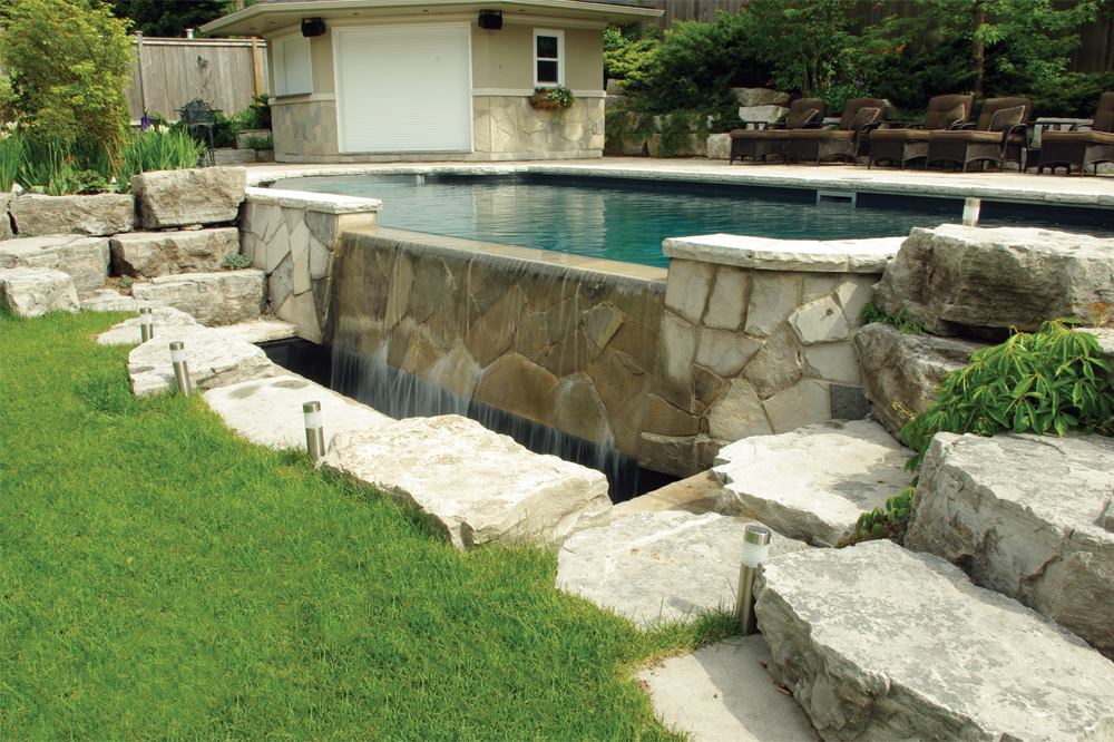 Despite a picturesque location off the shores of Lake Ontario, the sloping backyard with more than a meter’s worth of grade difference was a less-than-ideal space to build a pool. Fortunately, the homeowner’s vision of an aquascape with a vanishing-edge waterfall fit perfectly with the topography.