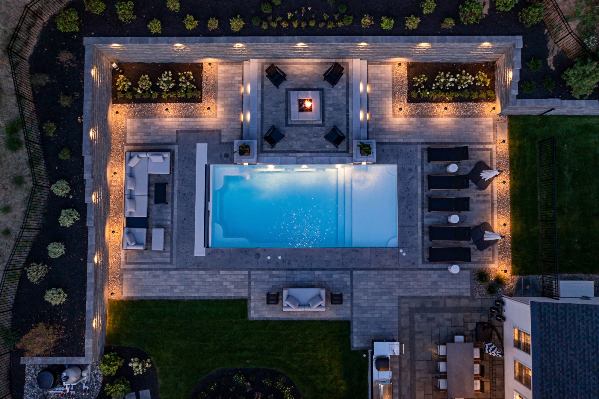 The materials for the flatwork areas around the pool were chosen to help define the spaces. Surrounding the pool is a 3-foot deck of cantilevered, stamped concrete. Paving stone was used in the patio areas, including the raised area where the fire pit sits.