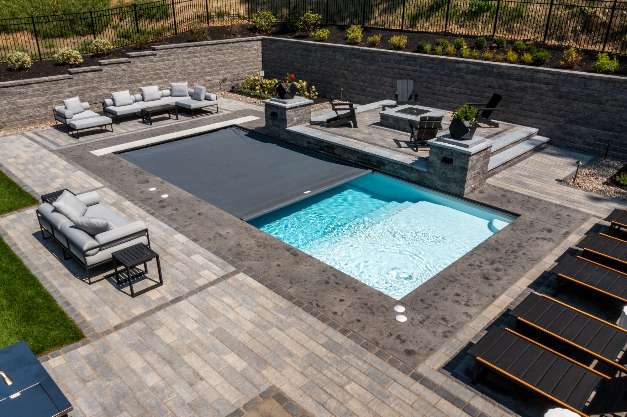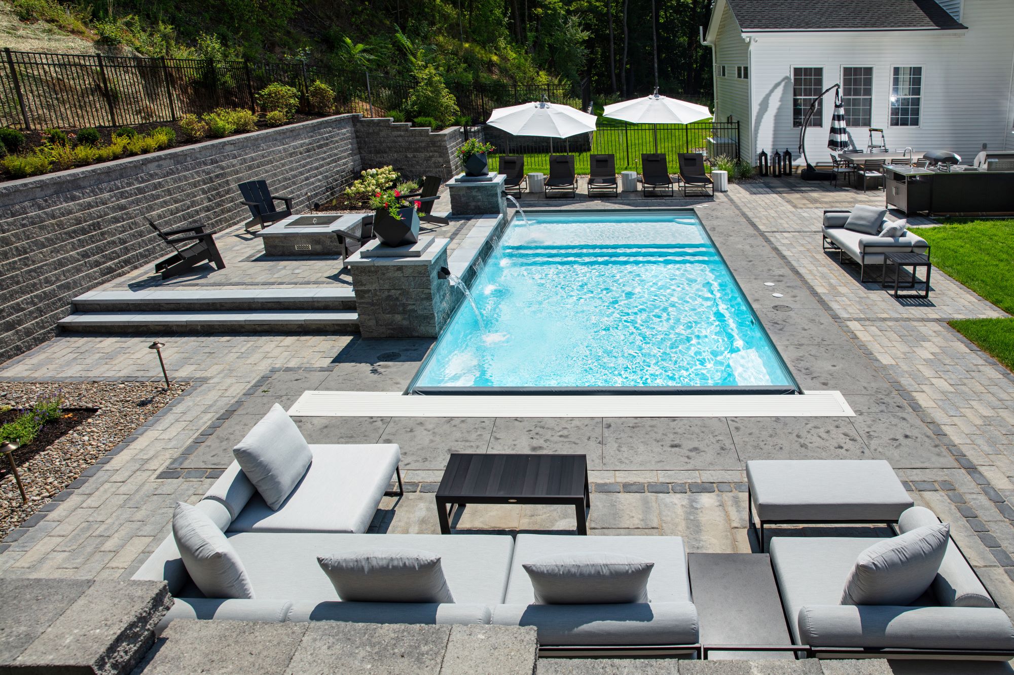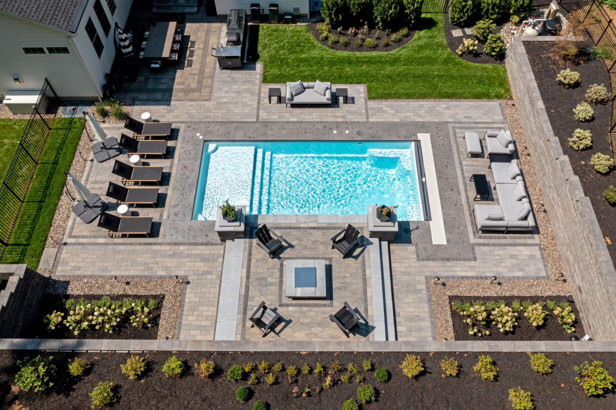 To give the backyard a modern look appropriate to the two-story house, Concord Pools installed a rectangular fiberglass pool with a concrete deck and stone patio.