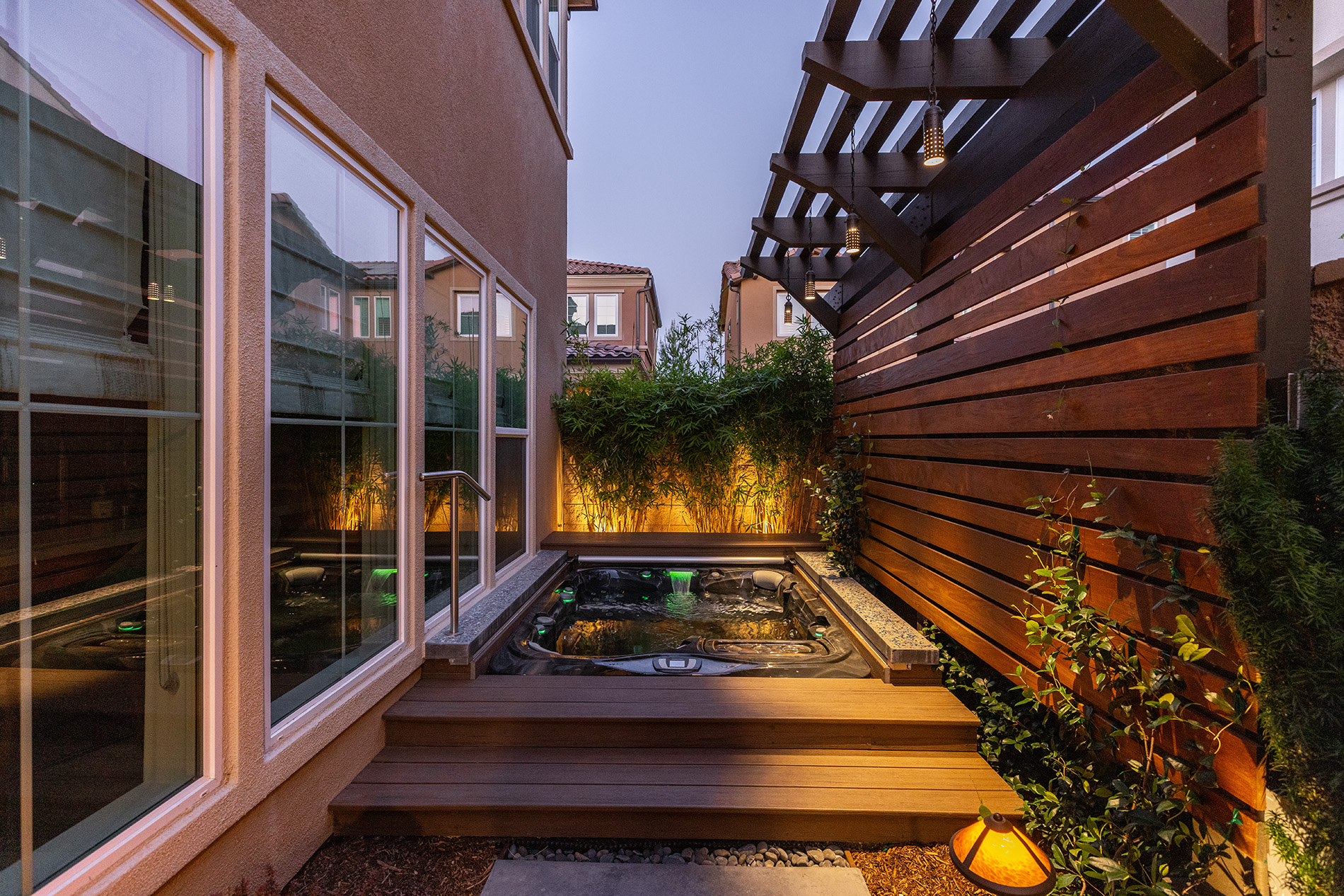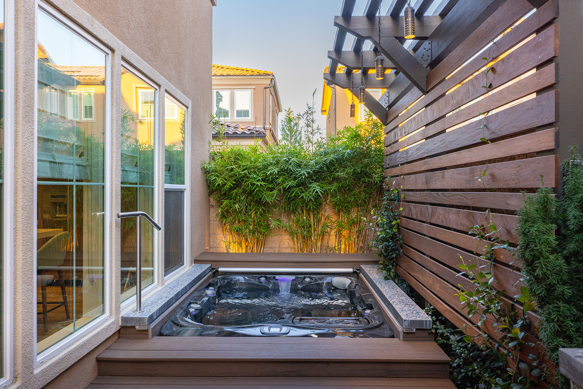 The spa is sunken halfway into the ground to keep it from blocking the windows on the home, which sit fairly low to the ground.